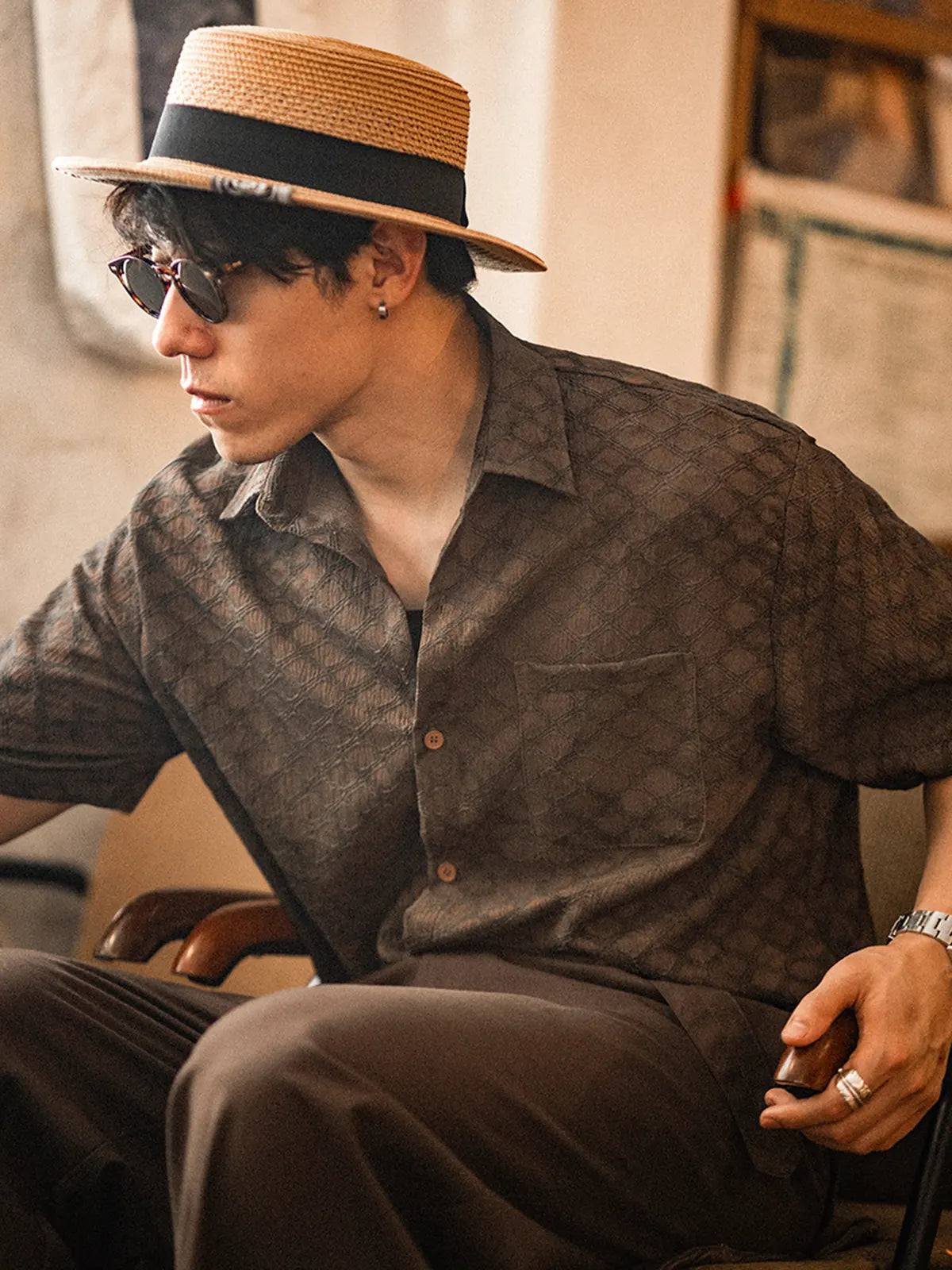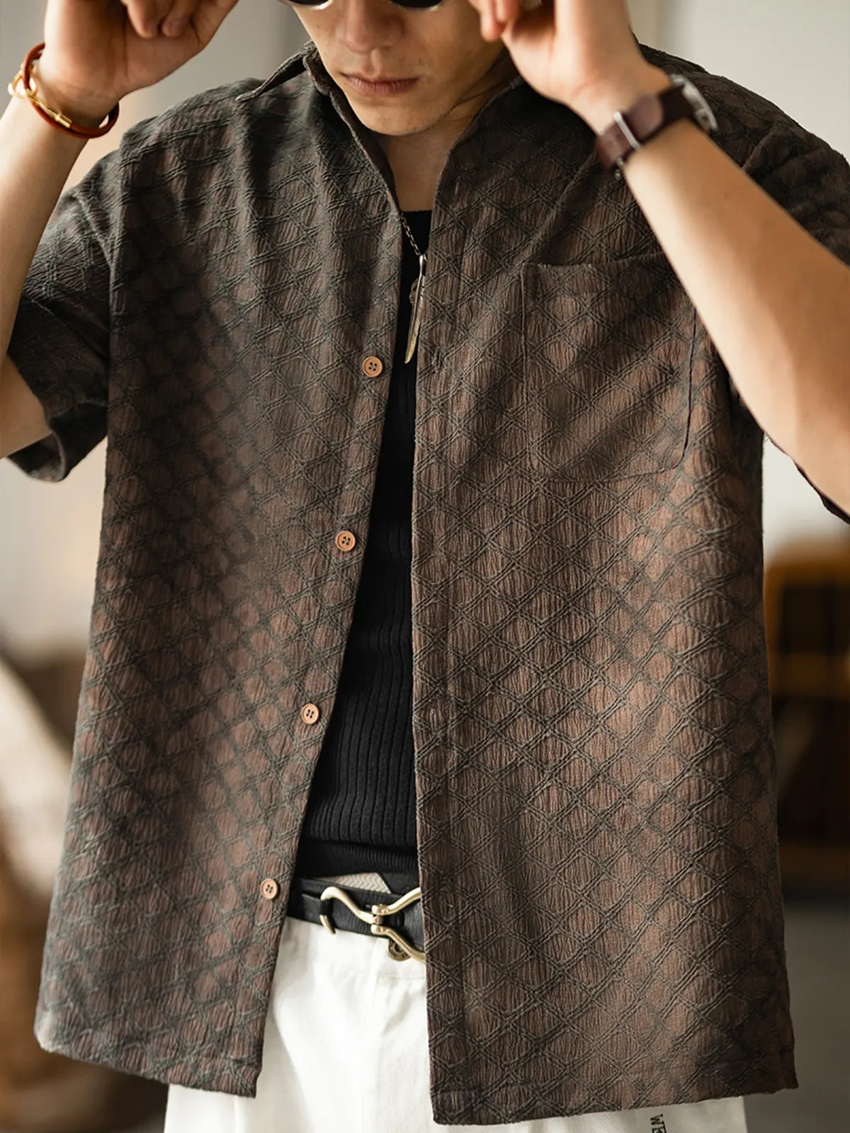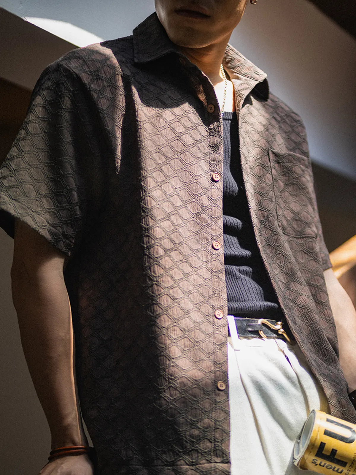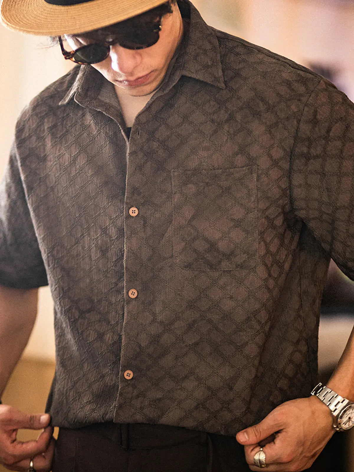 ハリと薄軽さを両立する94%ポリエステル・6%ポリウレタン混紡の抗シワストレッチ素材に、ビンテージライクな蛇皮柄をオールオーバーでプリント。ココナッツナットボタンが温かみを添え、開閉するたびにナチュラルなアクセントを演出。シンプルなレギュラーカラーとボックスシルエットにより、単体でリラックス感あふれる着こなしが楽しめるほか、インナーにTシャツを合わせたレイヤードスタイルも軽やかにキマる。ショーツやスリムデニムとの相性はもちろん、軽快なシャツジャケット風の羽織りとしても活躍。ビジネスカジュアルからリゾートまで、シワを気にせず手軽にコーデをアップデートできる一着。