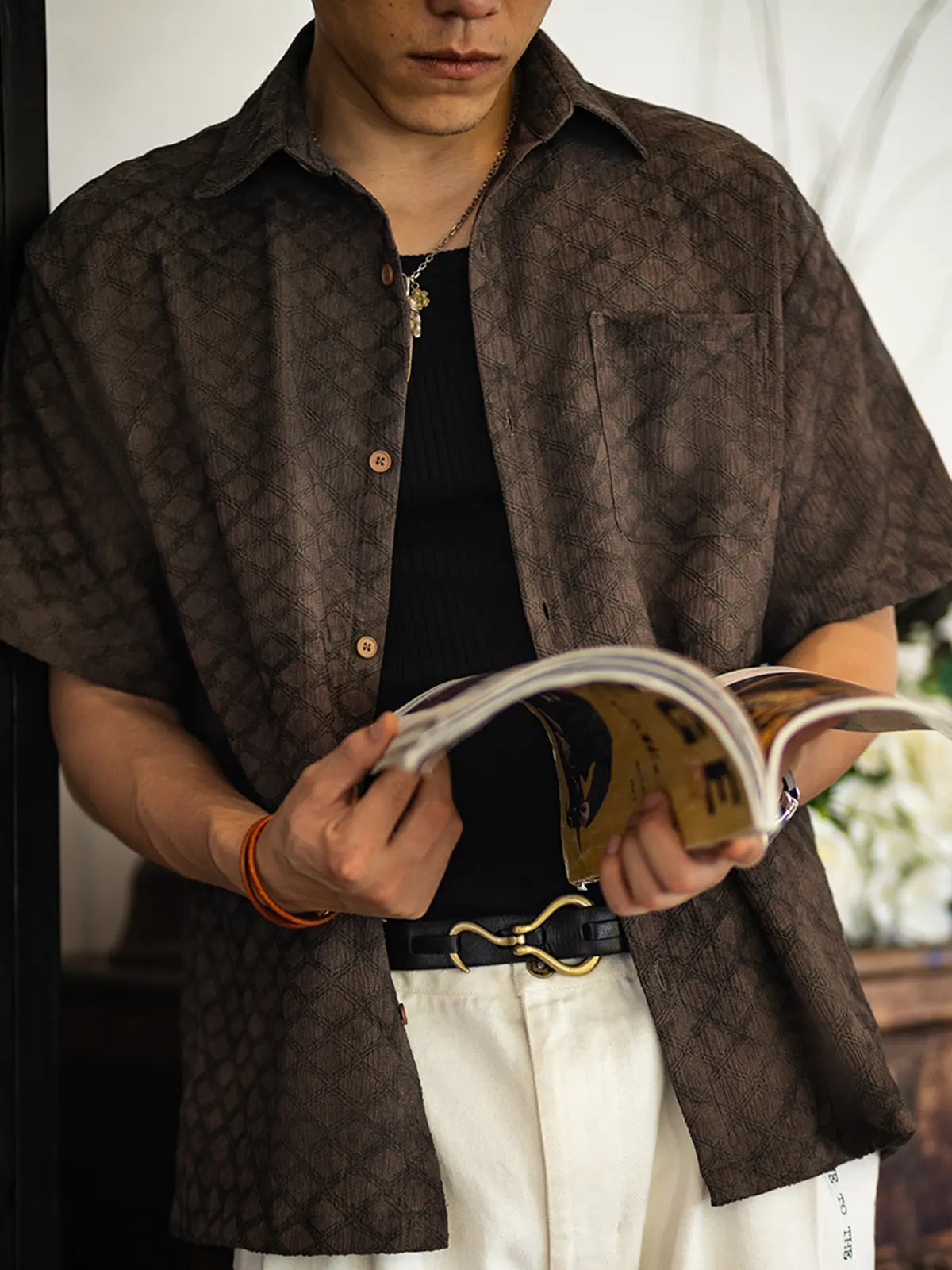 軽量抗シワ性のポリエステル94%+ポリウレタン6%生地を使用した、蛇柄プリント×ココナッツボタンのゆったり半袖シャツ。