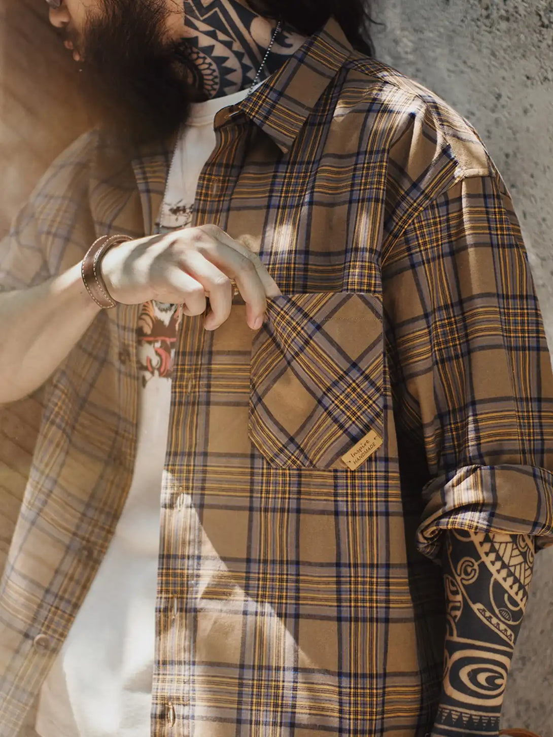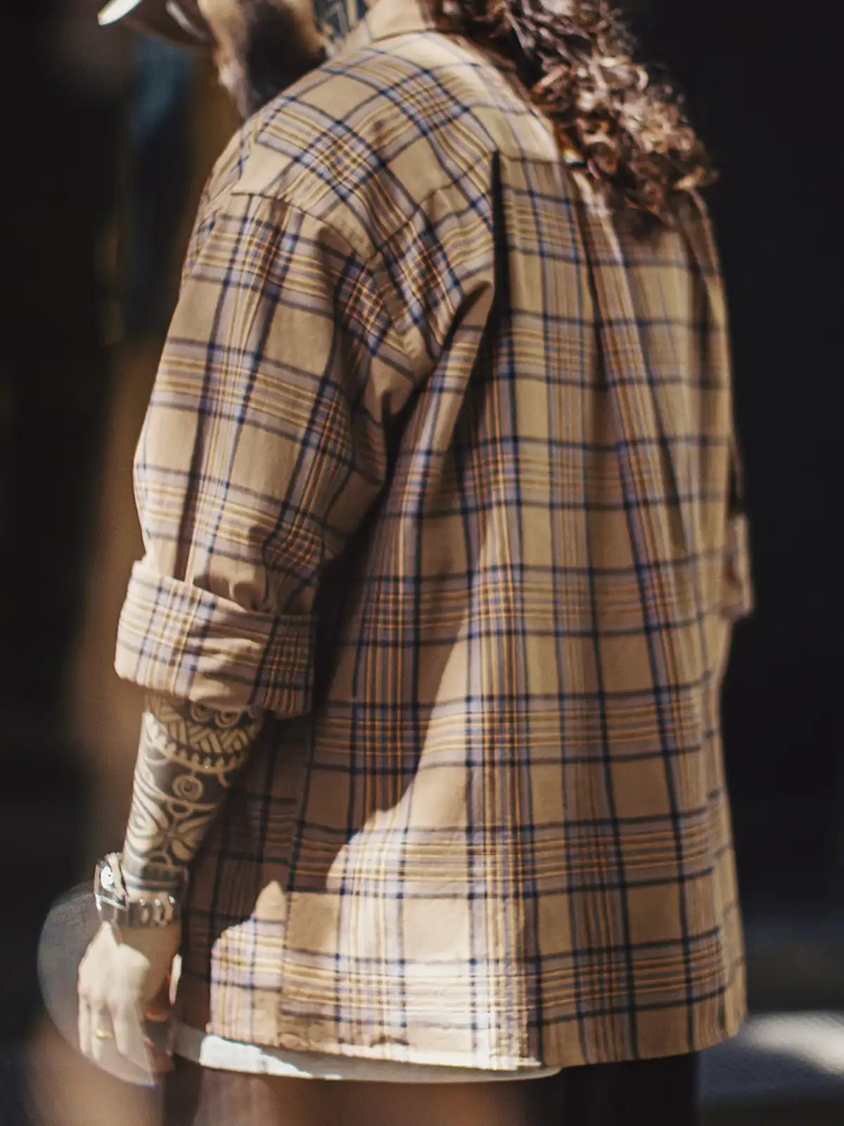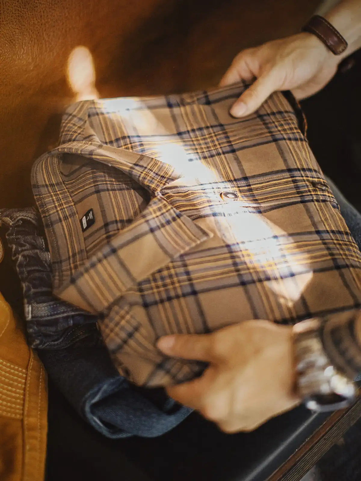19世紀のワークウェアにルーツを持つ、大地色が映える薄手チェックオーバーシャツです。