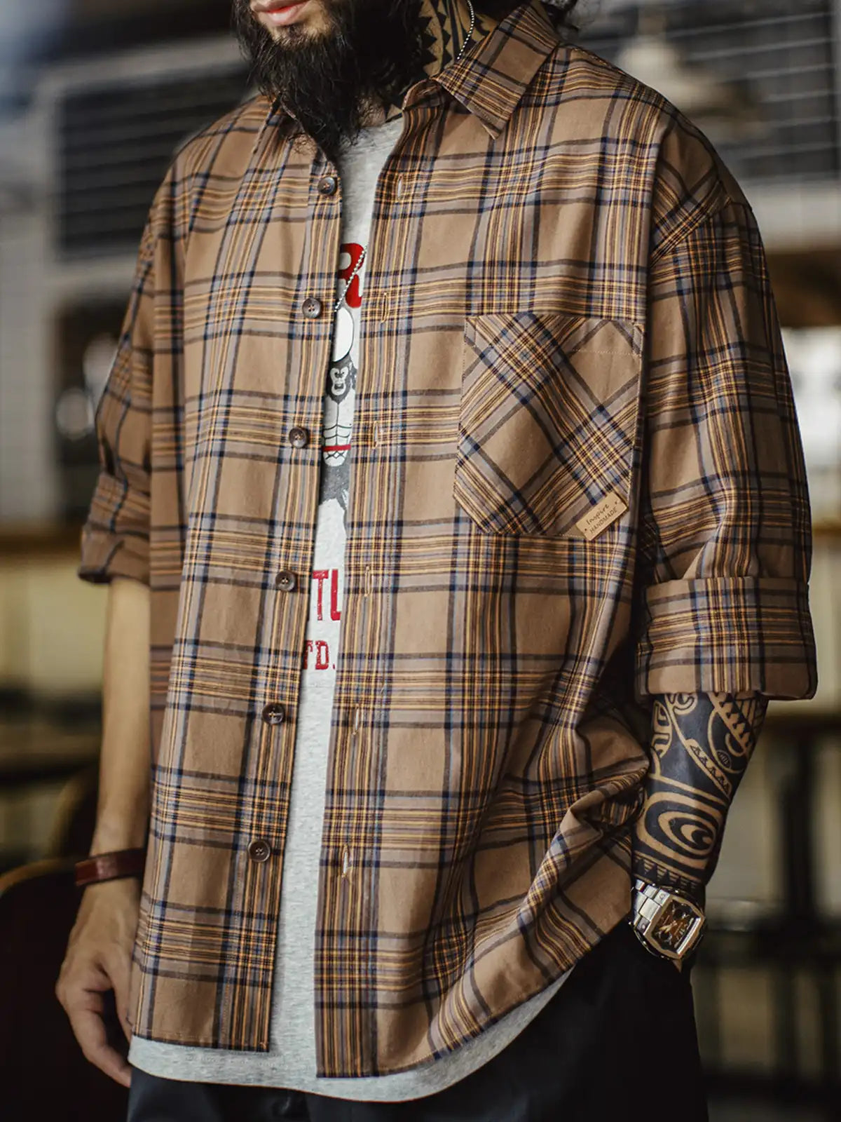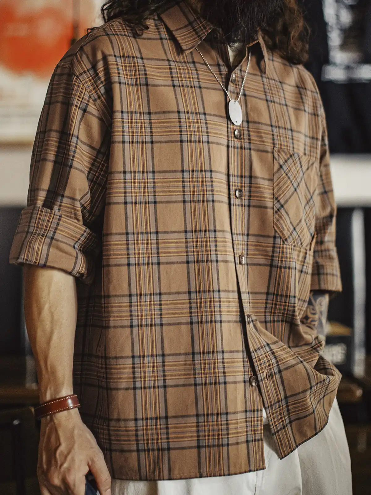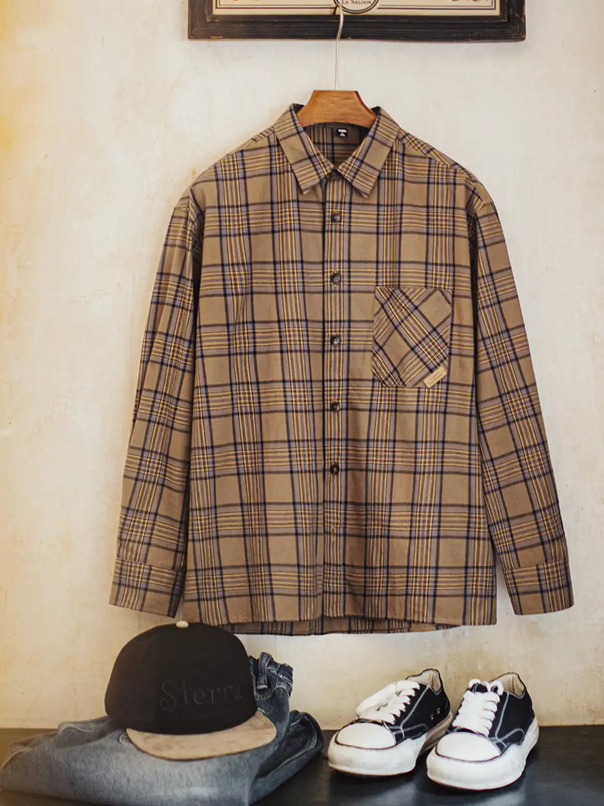 19世紀のワークウェアにルーツを持つ、大地色が映える薄手チェックオーバーシャツです。