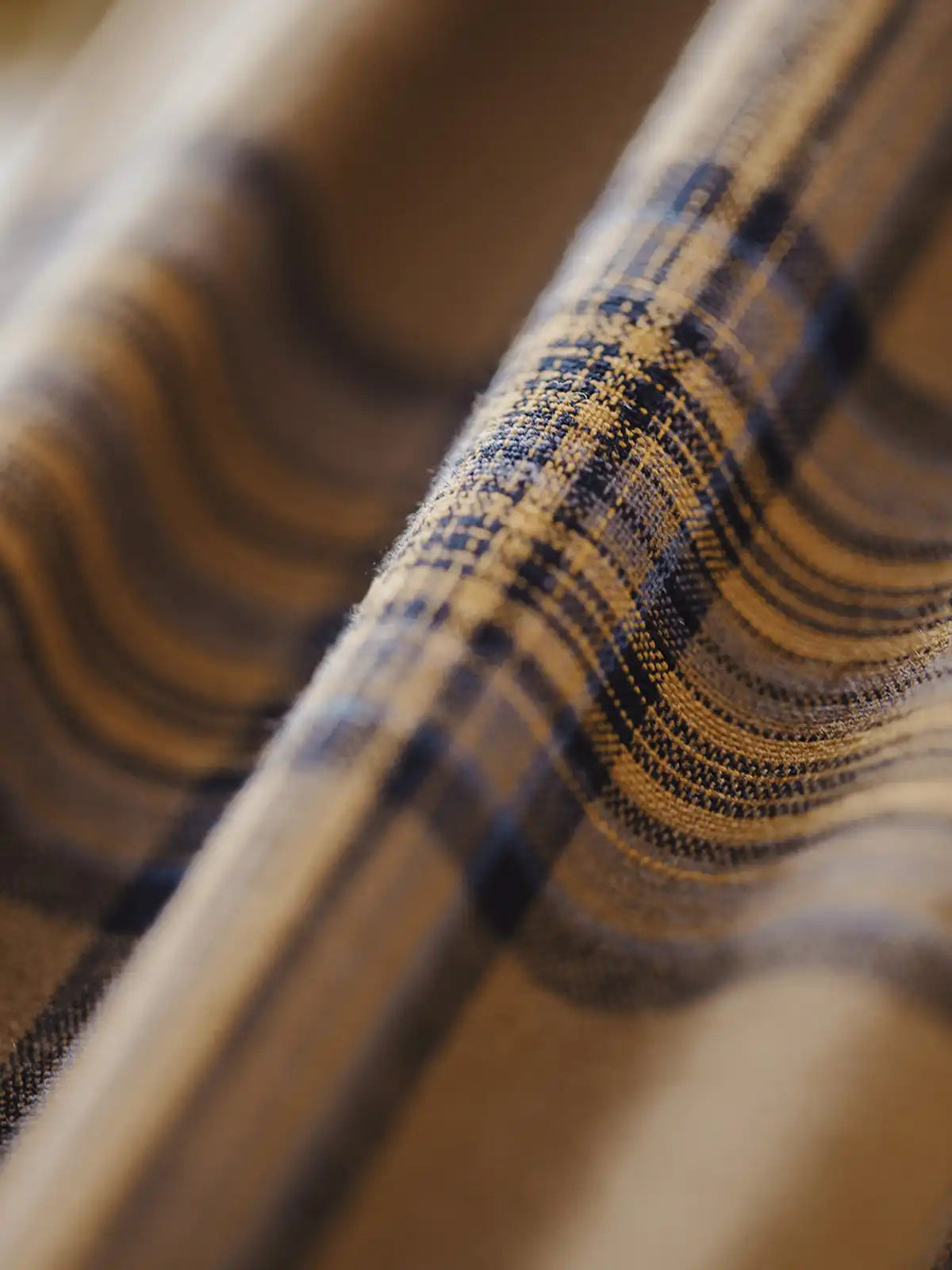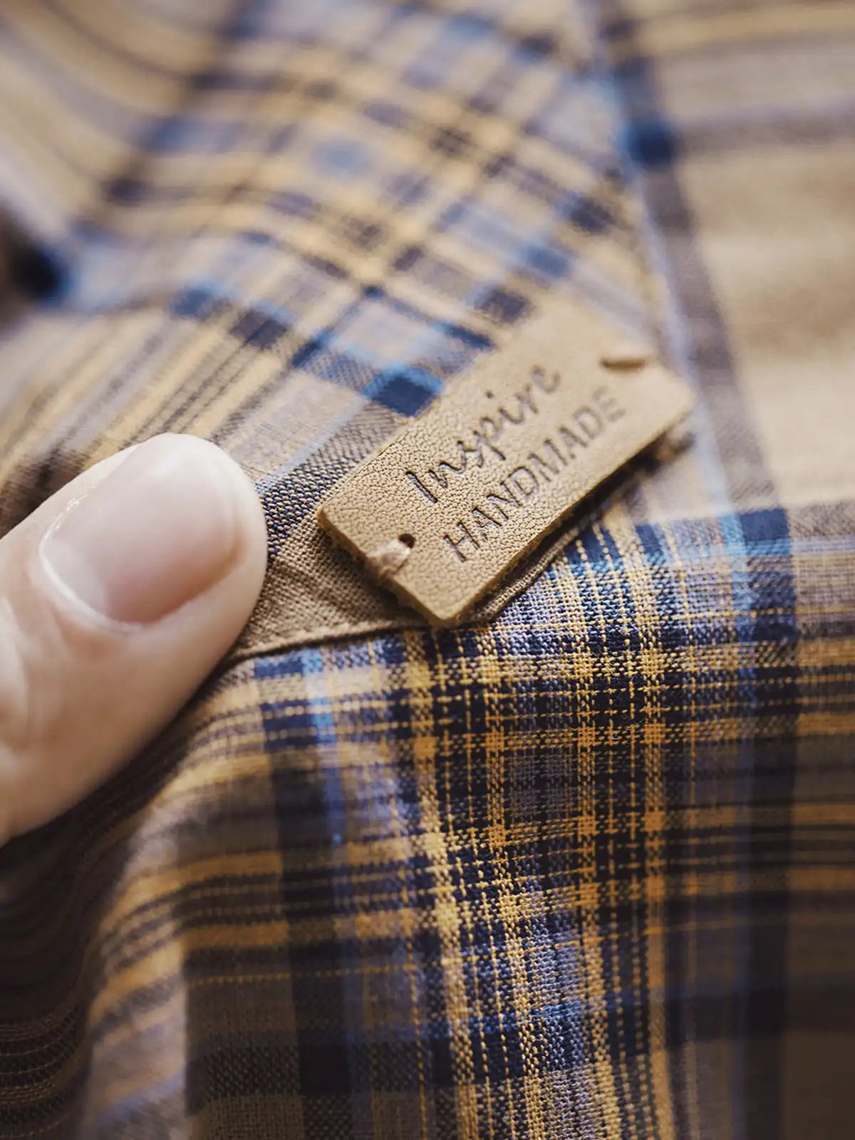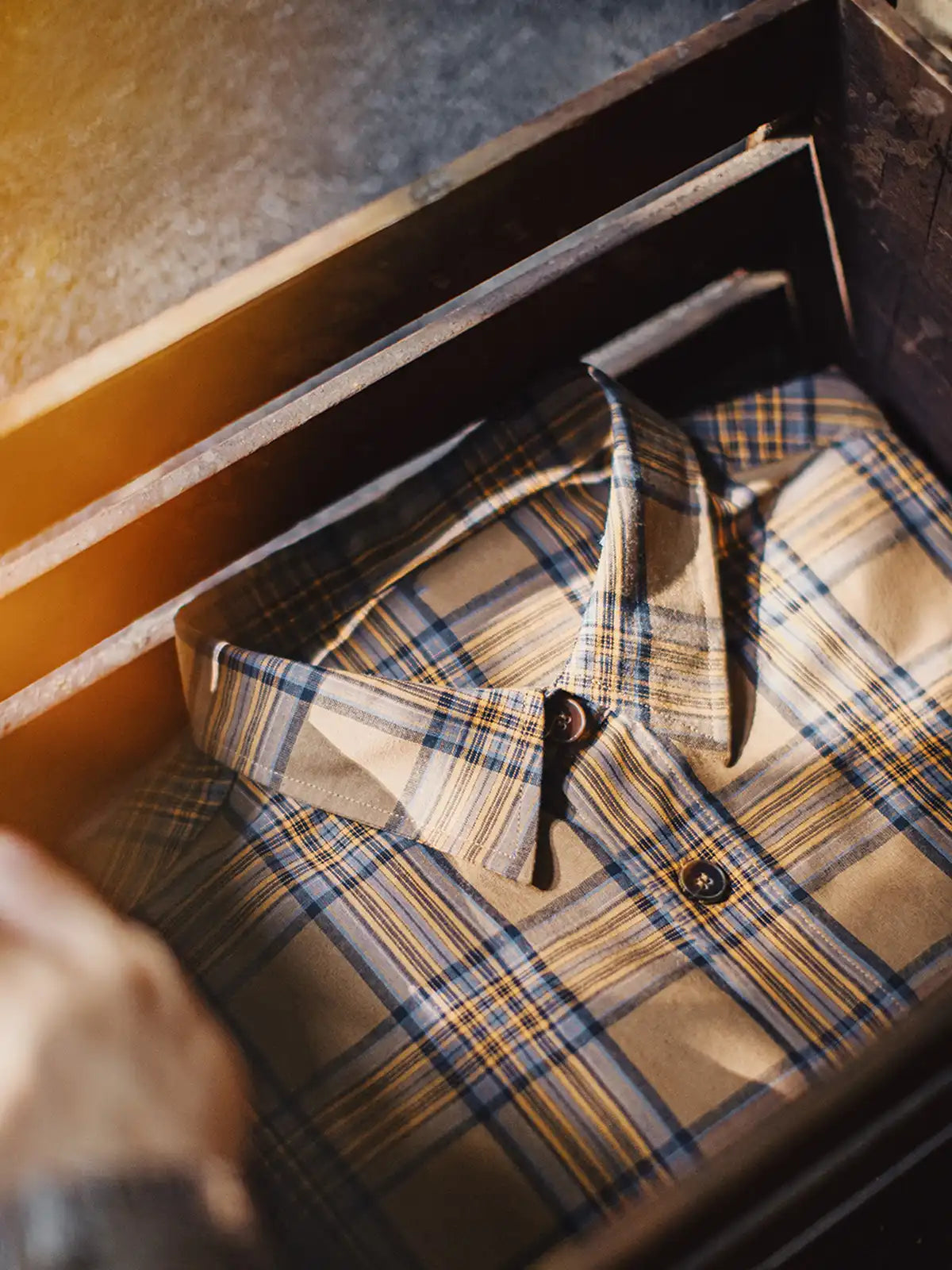 労働者の制服として誕生したワークシャツを現代的に再解釈し、厚手のフランネルに代わる132g/m²のコットン素材で吸湿透気性を大幅に向上。深いネイビーと淡いイエローの格子柄が大人の落ち着きを演出し、胸ポケットに配した手縫いプレスのレザーパッチがさりげない高級感を添えます。裾は自然なアール裁断でレイヤードしやすく、ゆったりとしたルーズフィットは一枚着でも軽アウター使いでも自在。Tシャツの上から羽織れば、初秋のスタイリングに程よい抜け感を加えてくれます。