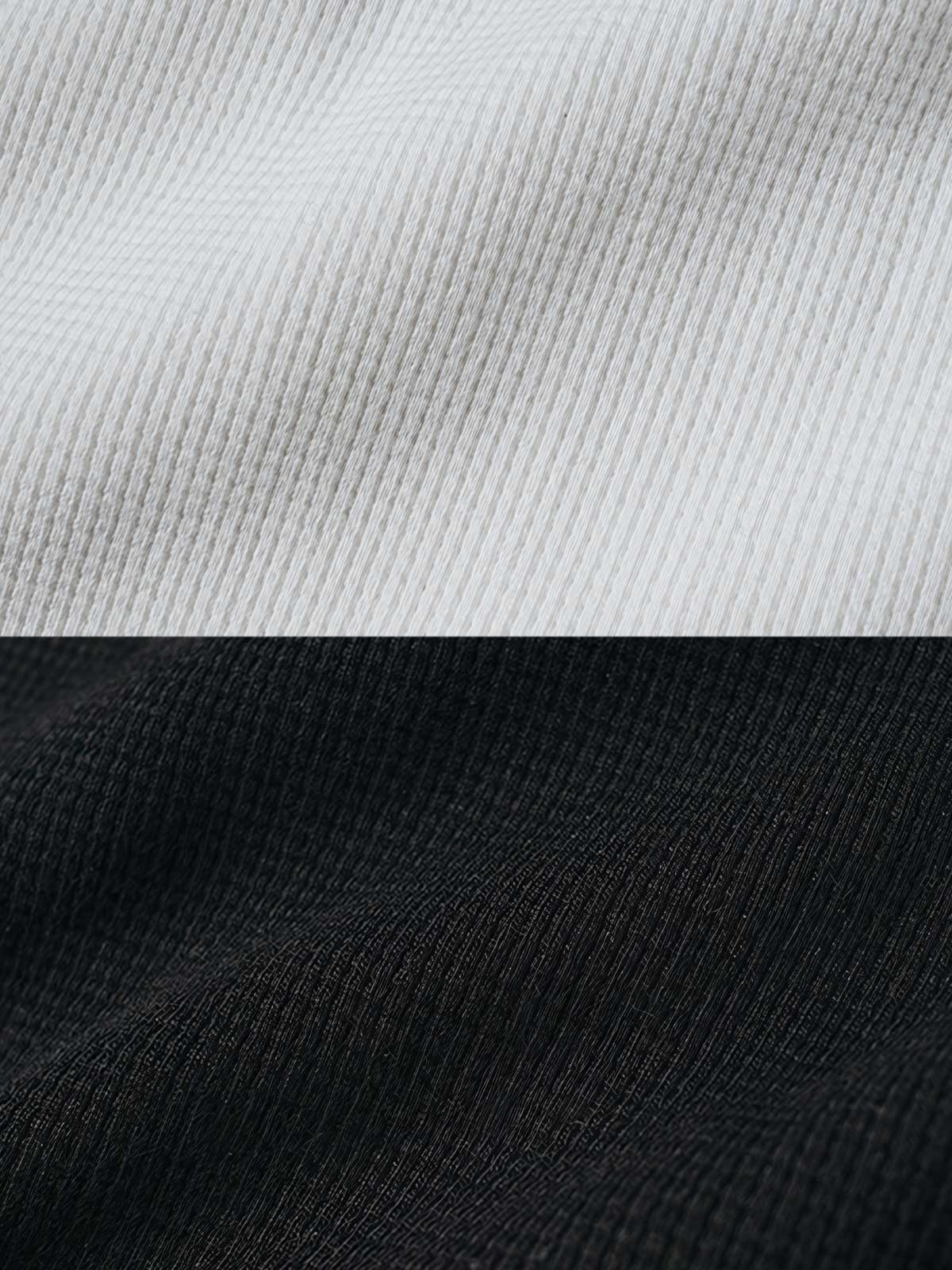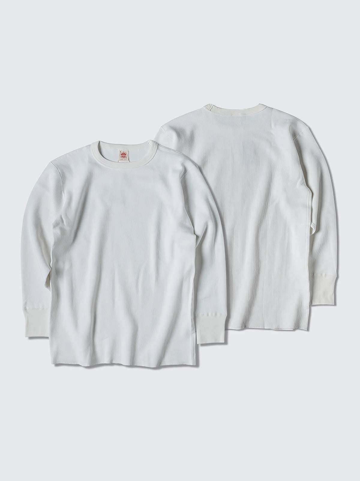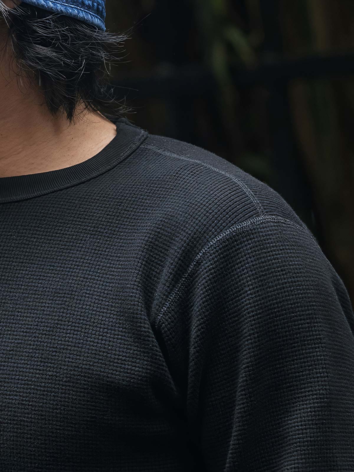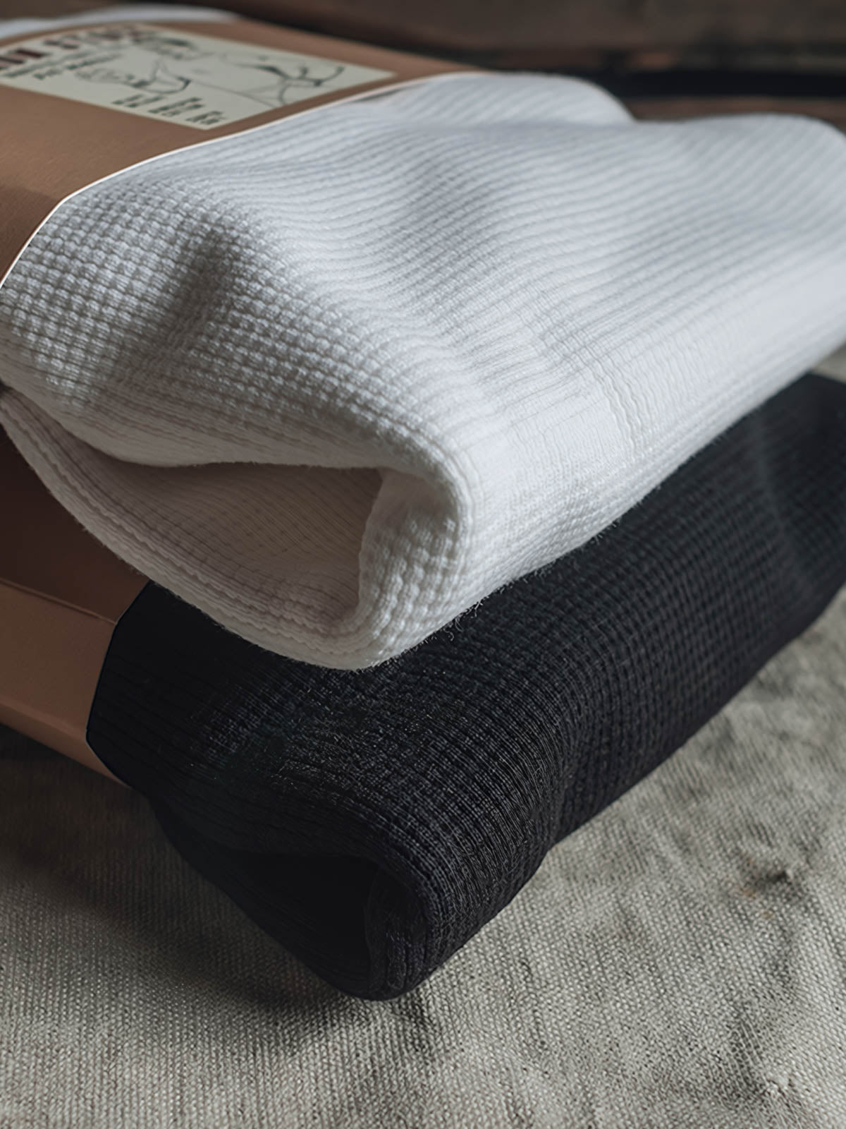 この長袖Tシャツは、クラシックなワッフル格子模様を採用しています。この模様は19世紀の寝具として始まり、そのユニークな外観と快適な質感が衣類にも採用されるようになりました。ワッフル格子は伝統的なアンダーシャツのデザインからインスピレーションを得ており、その歴史的な背景と独特な魅力を現代のファッションに融合させています