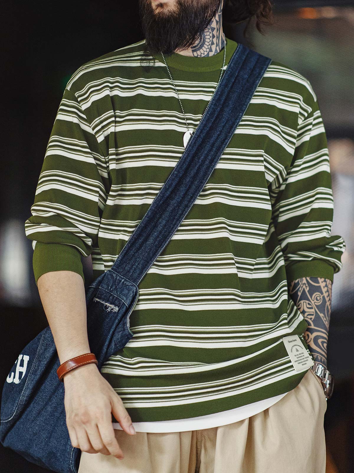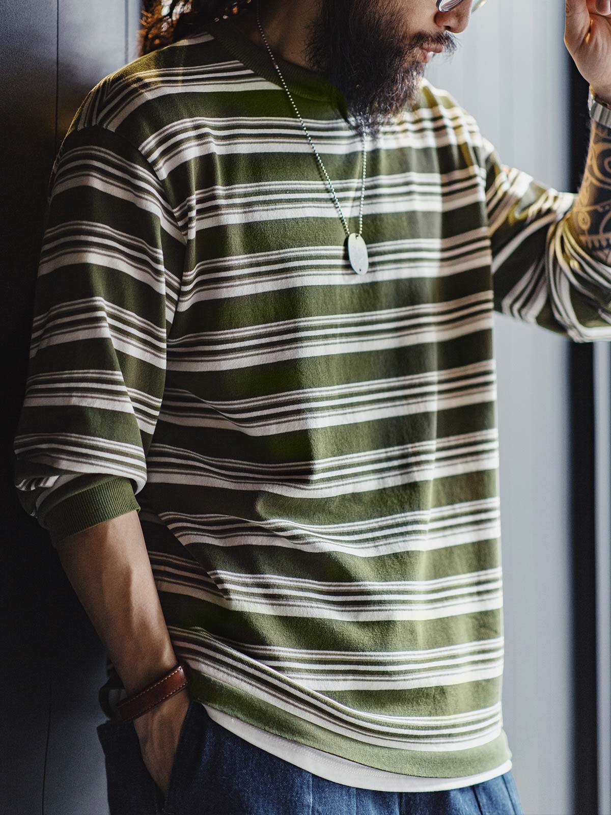 このアメリカンヴィンテージストライプ長袖Tシャツは、三色の糸で独特なデザインを作り出し、秋のコーデに最適。