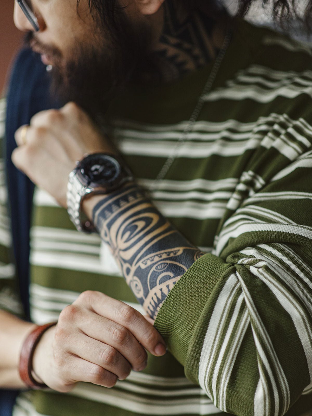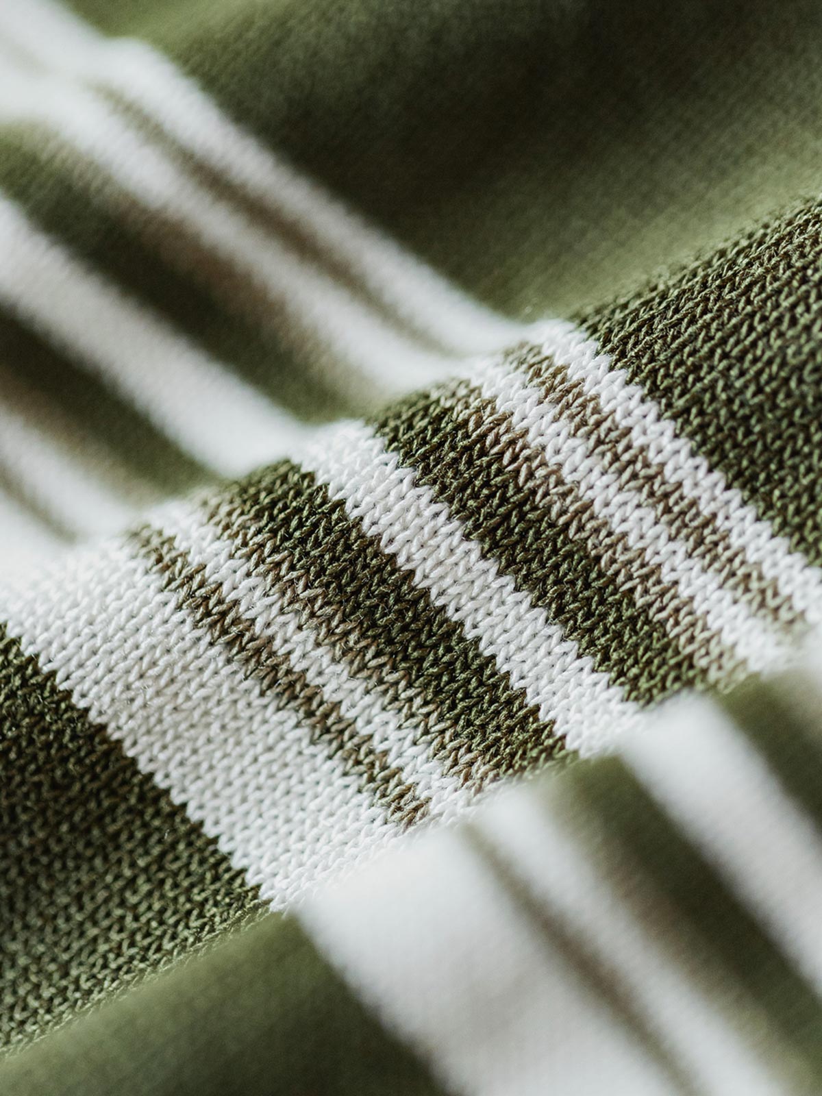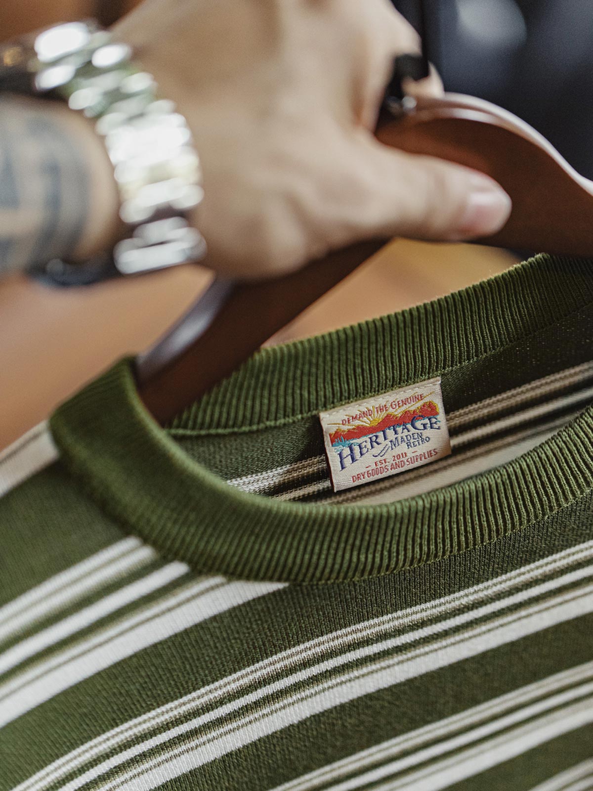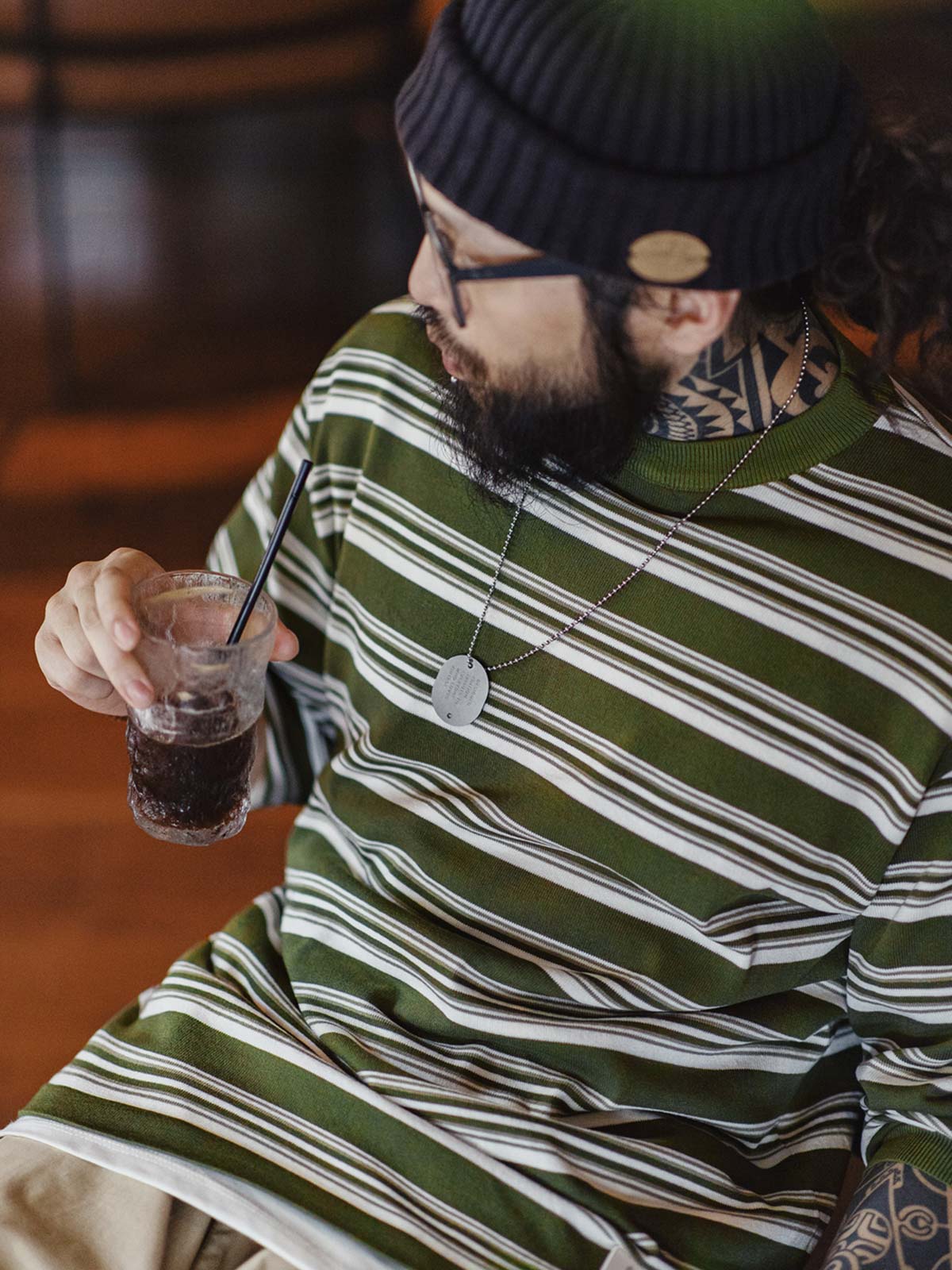 この長袖Tシャツは、アメリカンヴィンテージスタイルをインスピレーションにしています。ディープグリーン、オフホワイト、グレーグリーンの三色の糸を使用し、異なる幅のストライプを巧みに配置することで、独特の視覚効果を演出しています。ストライプデザインは視覚的な奥行きを増し、ヴィンテージ感を強調します。リブ付きのクルーネックと袖口デザインは、伸縮性と快適性を高め、自由な動きを確保します。このTシャツは、季節の変わり目にぴったりで、単品でもレイヤードでも、秋のスタイリングに独特の魅力を加えます。