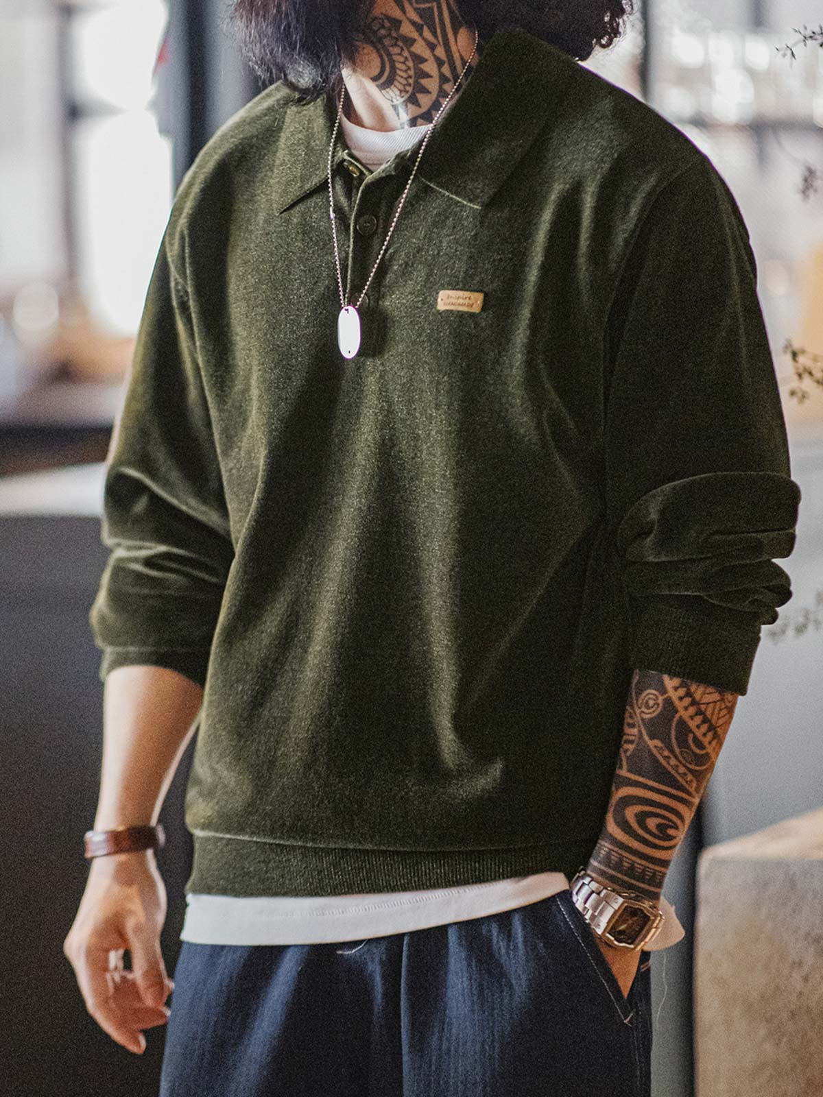 この長袖ポロシャツは、高級感のあるシェニール糸を使用し、しなやかで豊かな風合いを持つ生地に仕上げています。表面のフリースのような質感が肌に心地よく、見た目にも上品な光沢を与えます。また、この素材は耐シワ性と形状保持性に優れ、お手入れが簡単という実用的な特性も備えています。クラシックな小ぶりの襟元とハーフジップデザインがヴィンテージテイストを引き立て、ボタンには牛角風のデザインを採用し、さりげない高級感を演出。袖口と裾のリブ仕様はフィット感を高め、保温性を確保します。ワイドなシルエットはゆったりとした着心地を提供し、様々なシーンでの着用に対応できるため、オフィスカジュアルからアクティブな日常のスタイリングまで幅広く活躍します。シェニール素材特有の光沢感と雪のような立体感が、洗練された印象をさらに引き立てます。
