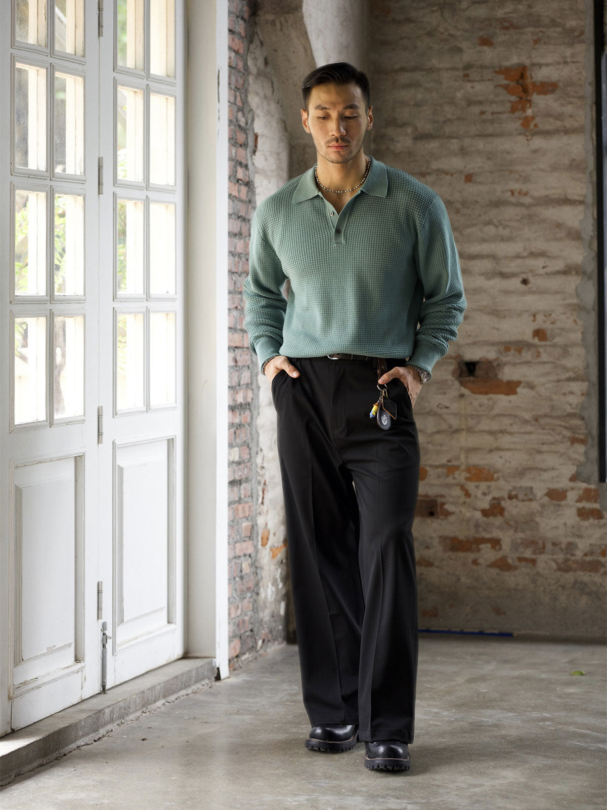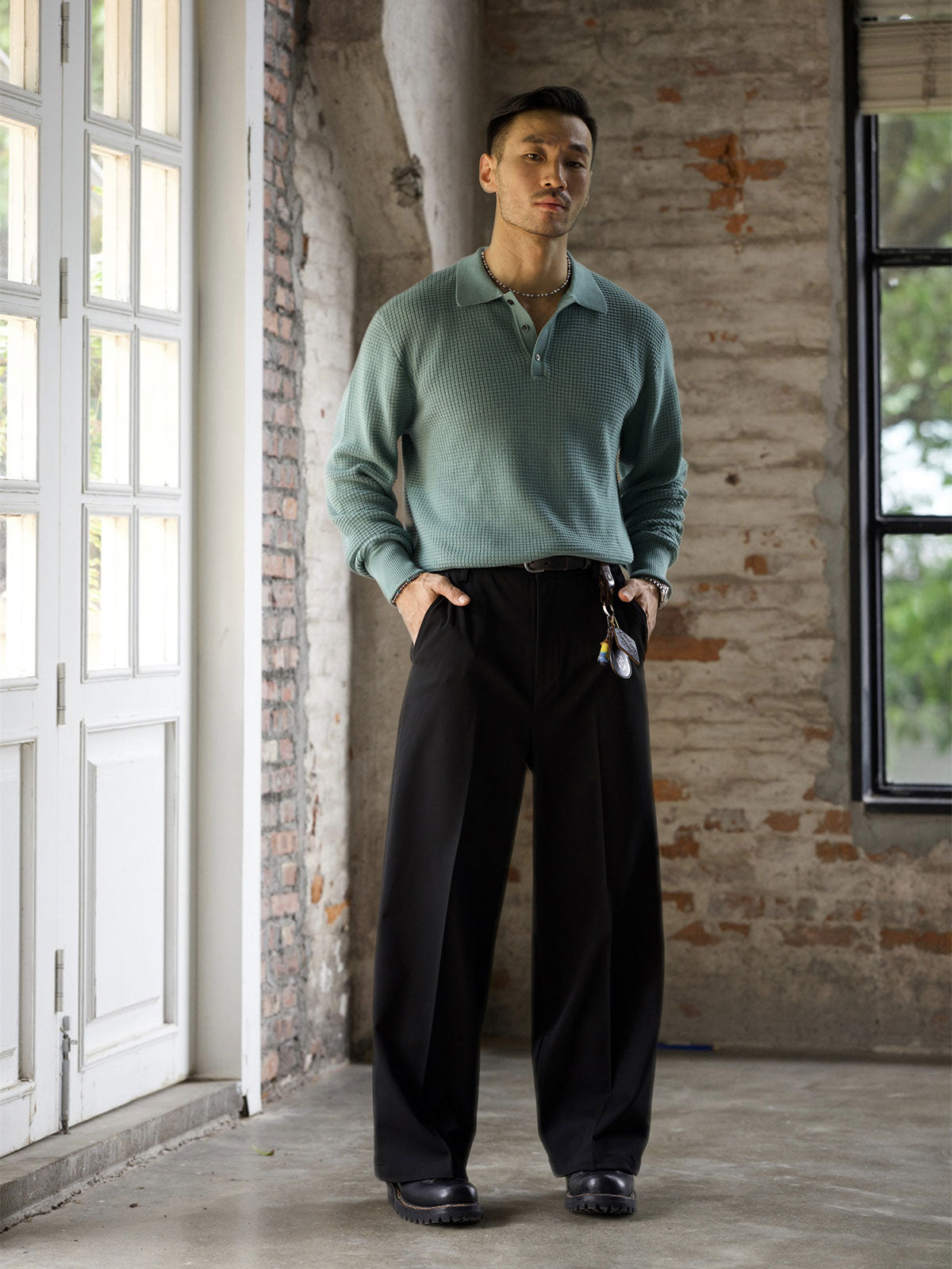 このポロネック長袖Tシャツは、450gの中厚100%コットン糸で編まれ、毛玉ができにくく、柔らかさとドレープ性が特徴です。保温性と通気性に優れており、立体的なワッフル柄デザインが装飾効果と通気性向上の役割を果たします。フィットシルエットで、単品でもインナーでも使いやすく、さまざまなパンツとのコーディネートが簡単です。クラシックなポロネックと正肩デザインが、さまざまな体型にフィットし、快適な着心地を提供。通勤からカジュアルまで、幅広いシーンで活躍する万能な一枚です。