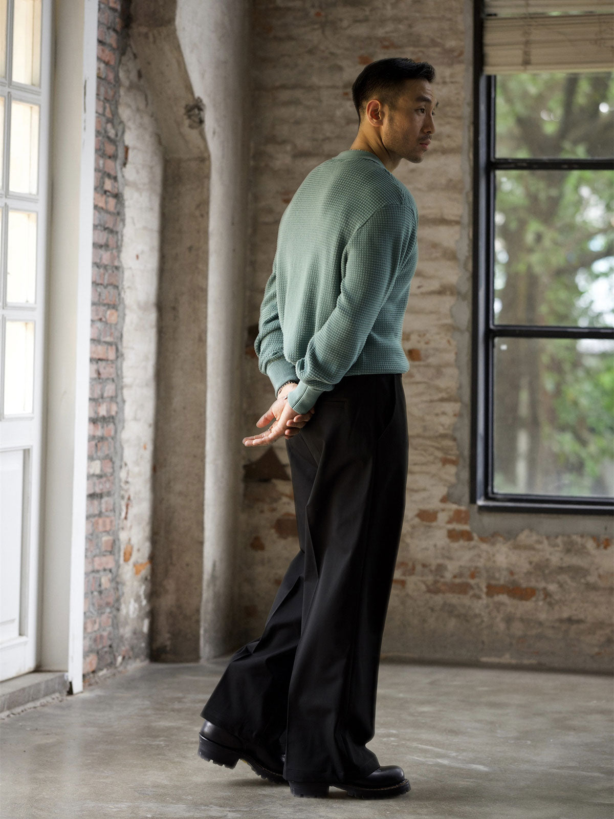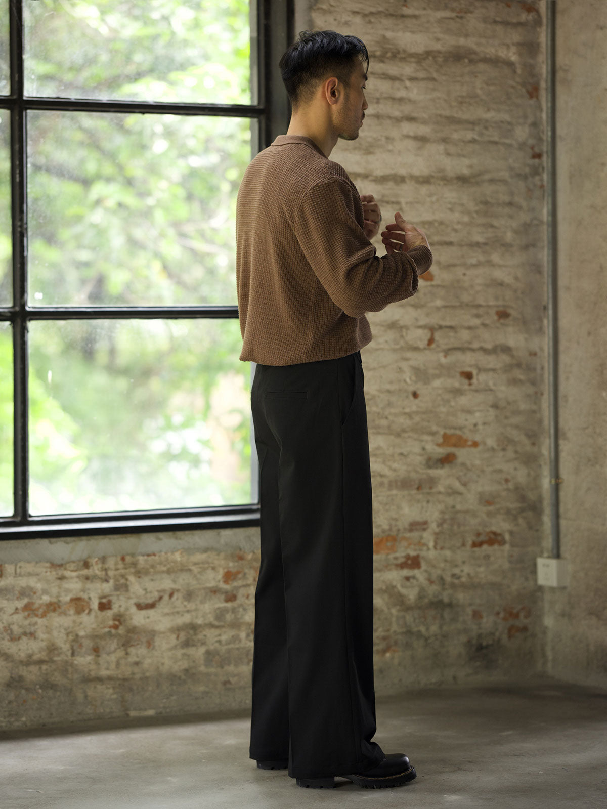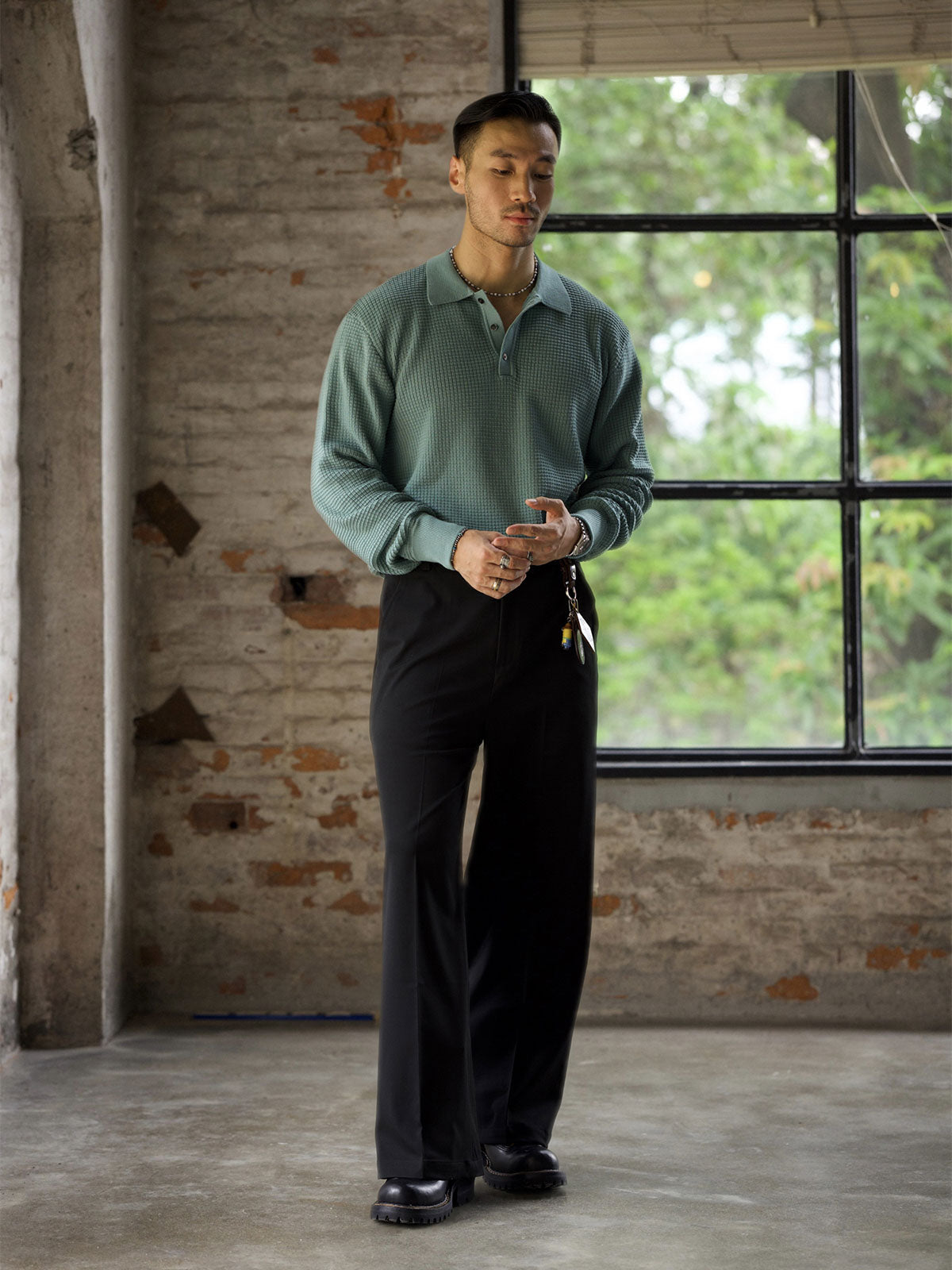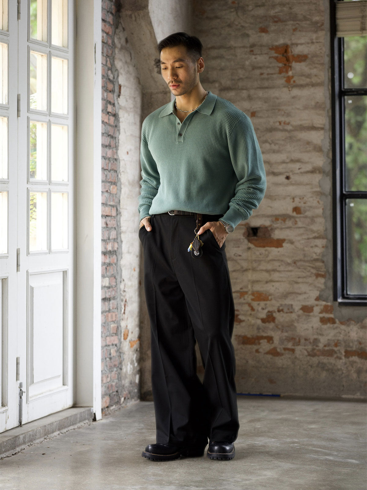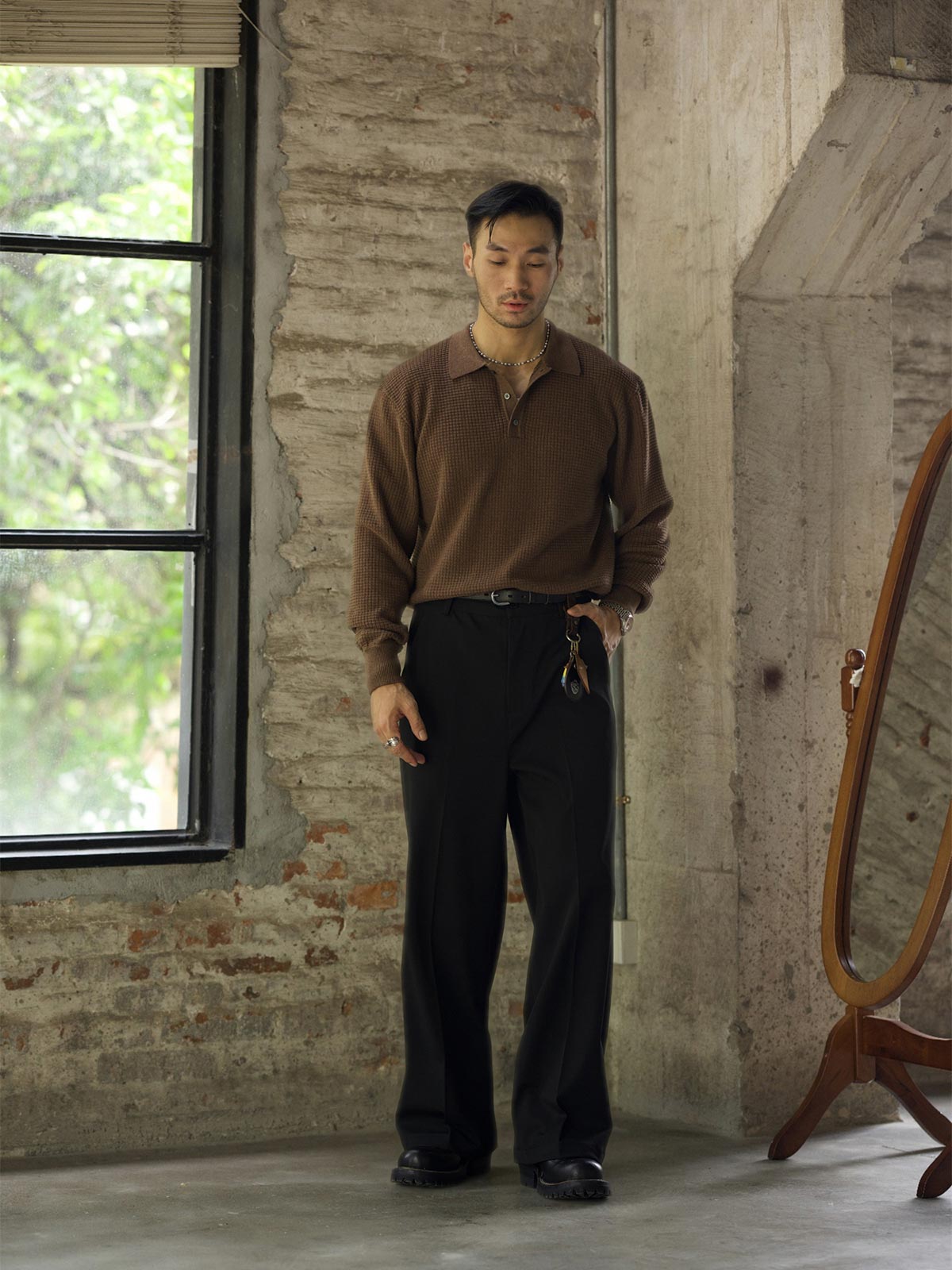 快適さと保温性を兼ね備えたオールコットンのポロネック長袖Tシャツ。クラシックなワッフル柄デザインが秋冬の通勤やカジュアルスタイルに最適。