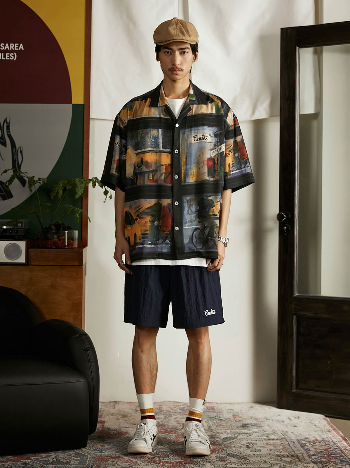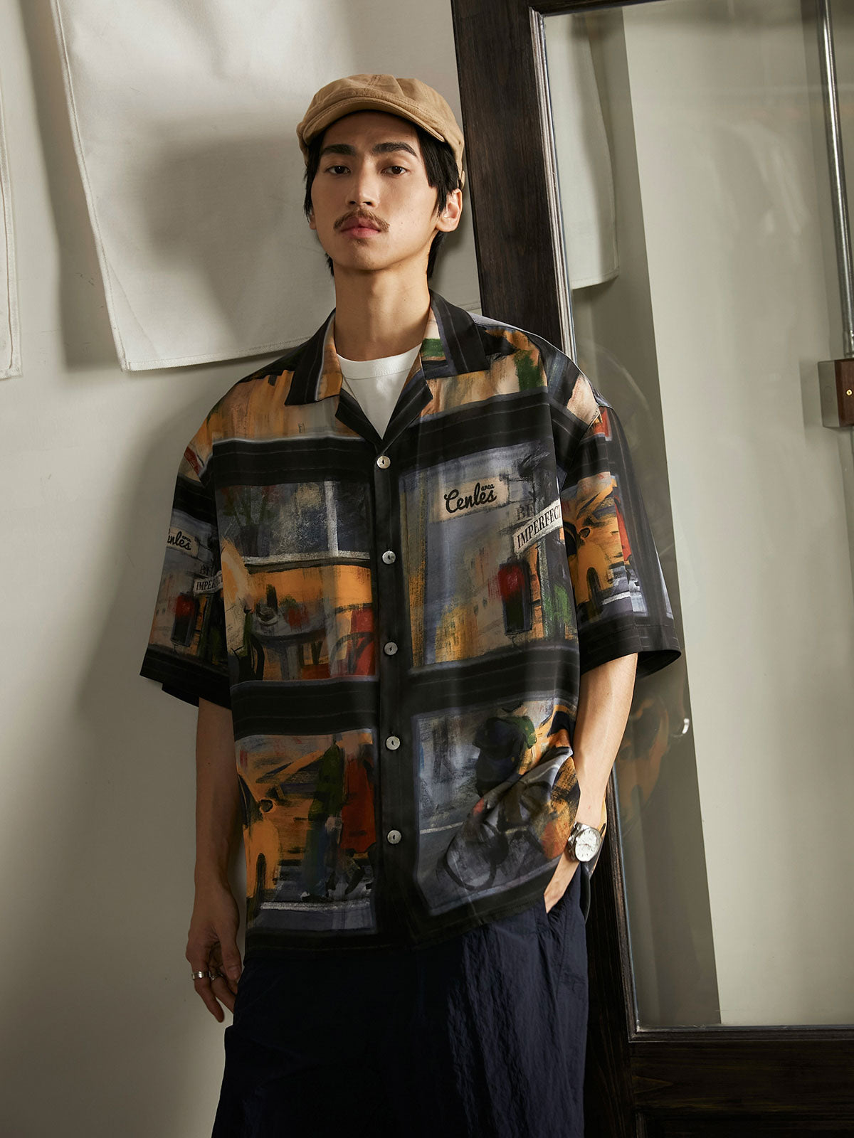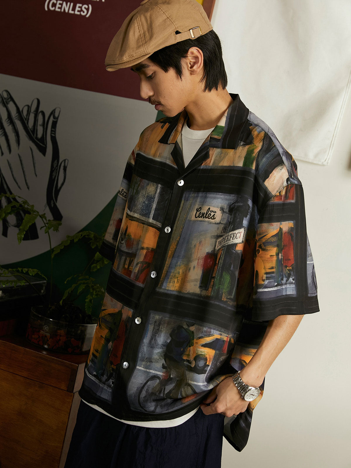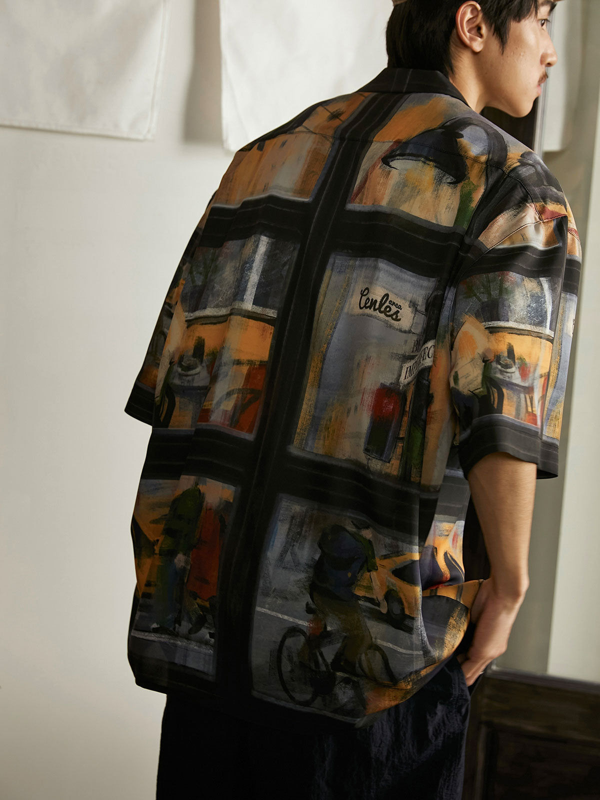 このハワイアンシャツは、雨の日の街景油画をテーマにしており、部屋内の安全感と快適さからインスピレーションを得ています。雨に濡れる街角と行人が描かれた物語性豊かな連続デザインが特徴です。