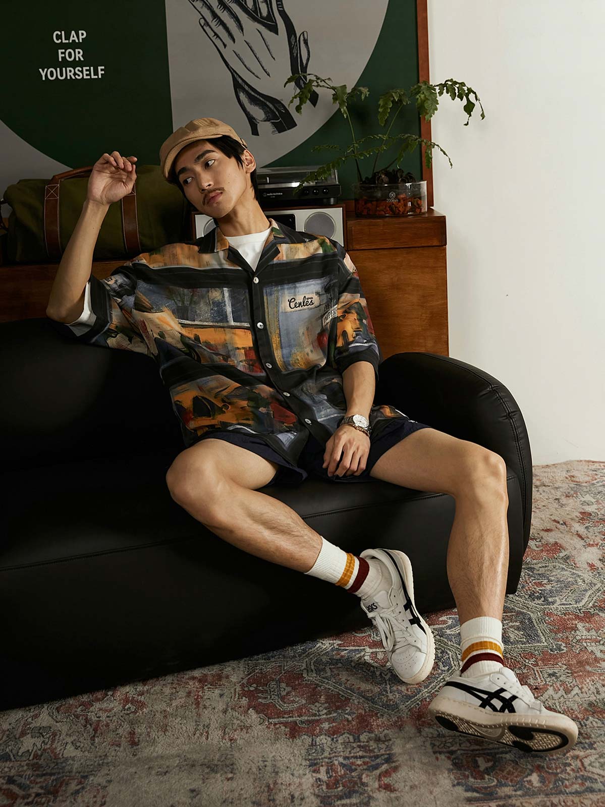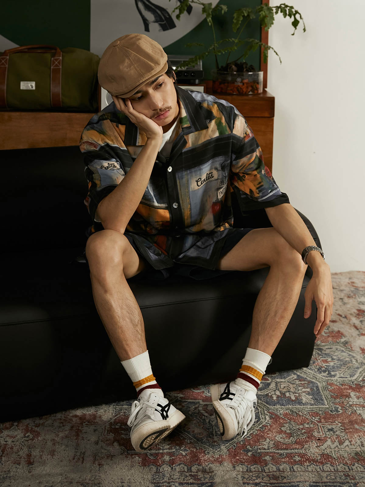ダークトーンの背景にレトロなプリントが映えるこのシャツは、ジーンズやカジュアルパンツと組み合わせると格別です。キャンバスシューズやカジュアルシューズを合わせれば、週末のアウトドア活動やカジュアルな街歩きにぴったりです。