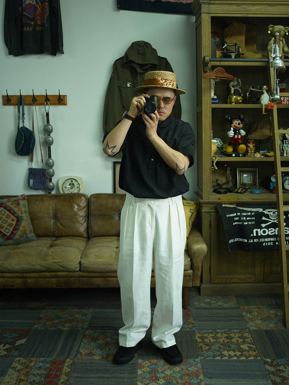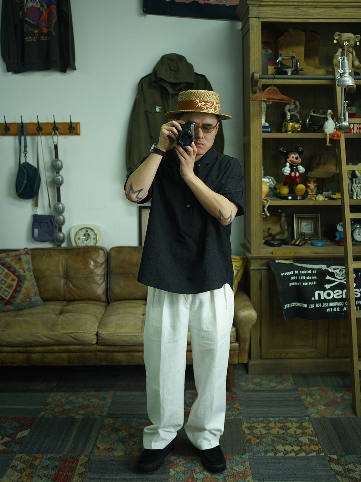 このクルーネックプルオーバーシャツは、1920年代のイートンカラーと海軍のセーラースタイルにインスパイアされています。全綿のシアサッカー生地を使用しており、程よい柔らかさと硬さ、立体的な表面、そしてしっかりとしたシルエットが特徴です。ゆったりとしたシルエットのプルオーバーデザインで、快適な着心地を提供します。胸ポケットと裾のサイドにはコントラストカラーの補強ステッチが施され、ヴィンテージなディテールを加えています。クルーネックと裾のアーチカットが調和し、カジュアルな印象を強調します。ボタンは天然の黒蝶貝ボタンを使用し、シアサッカーの特有のテクスチャーと相まって、ユニークなサマーNew Classicスタイルを演出します。