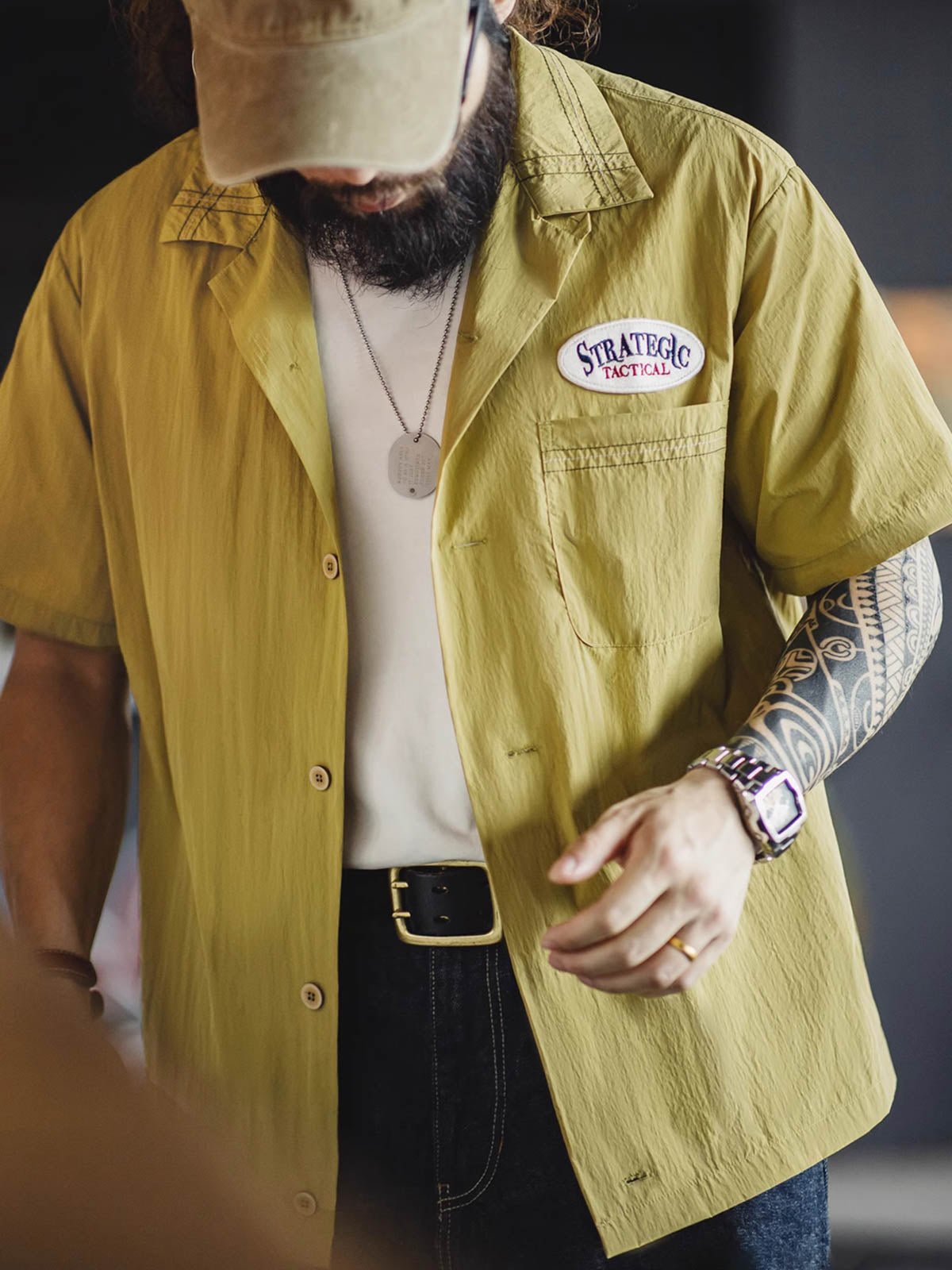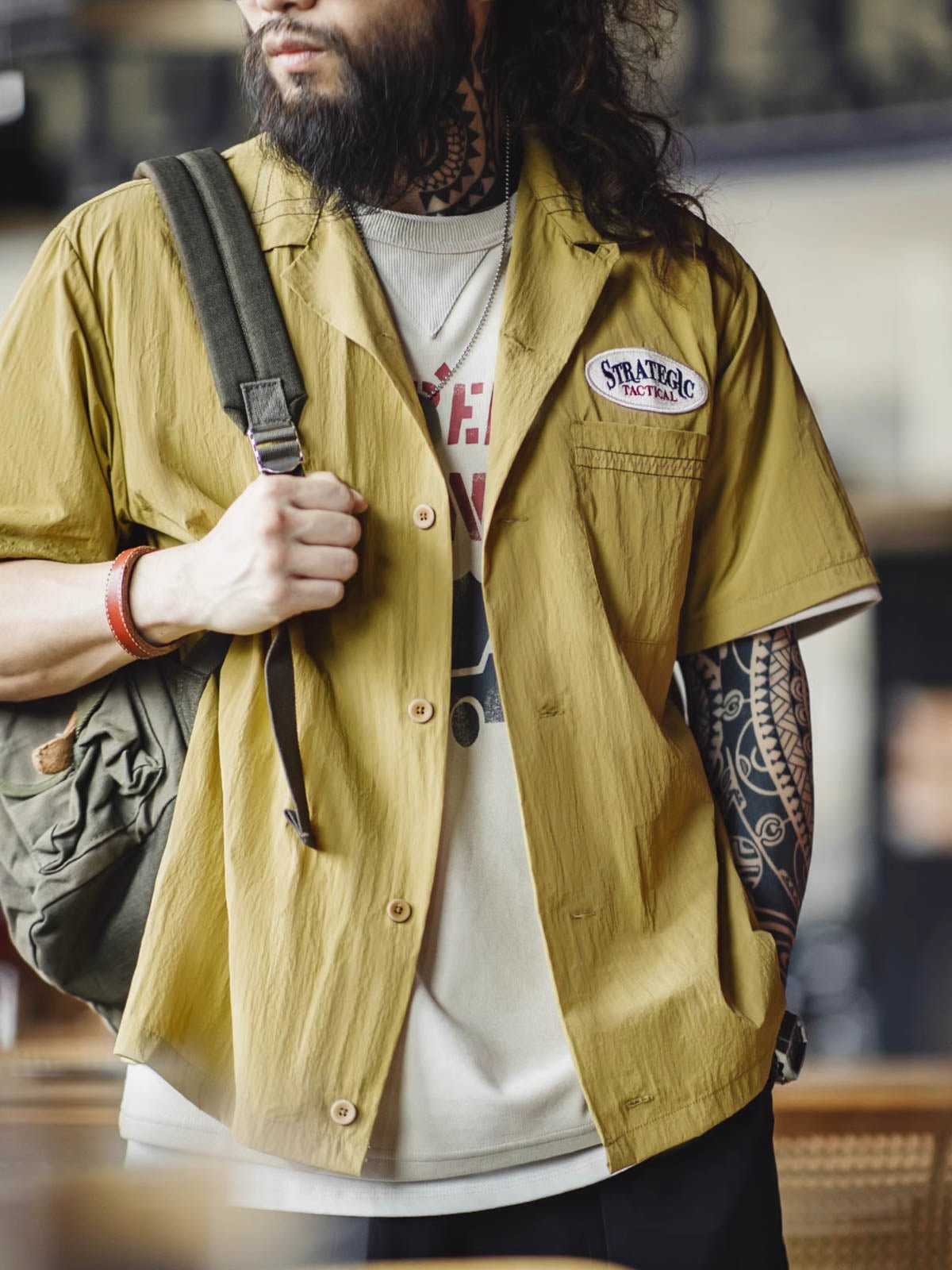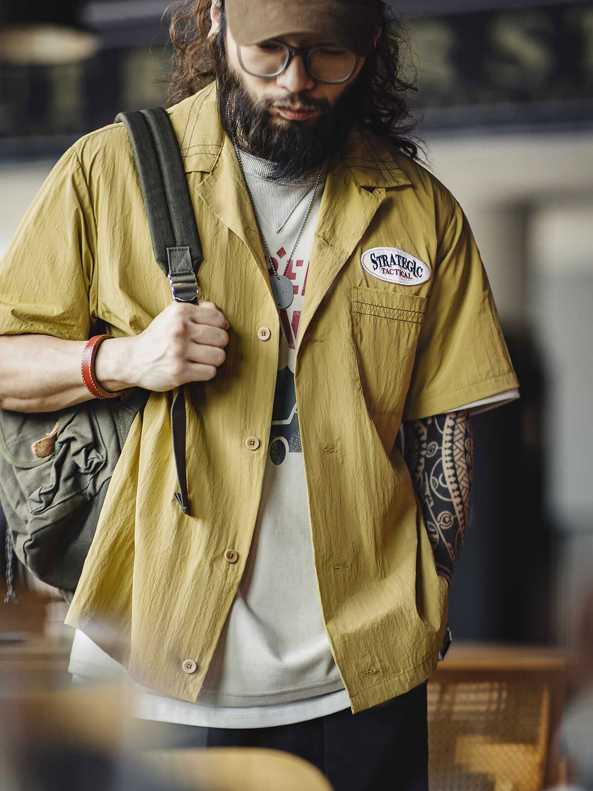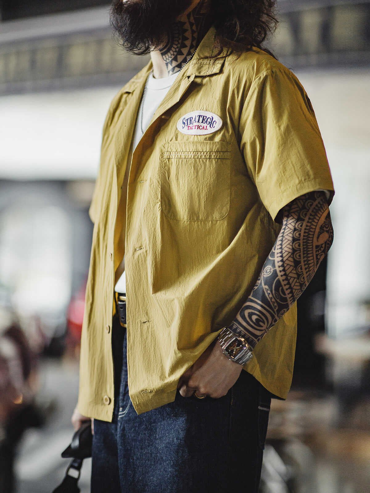 このシャツは、100%ナイロン素材を使用しており、軽量で通気性が抜群です。ウォッシュ加工によるヴィンテージ感が特徴で、クラシックなキューバカラー(開襟)デザインとマスタードイエローの配色が、夏のファッションに彩りを添えます。単独での着用はもちろん、シンプルなTシャツとレイヤードすることで、独特のヴィンテージスタイルを演出します。