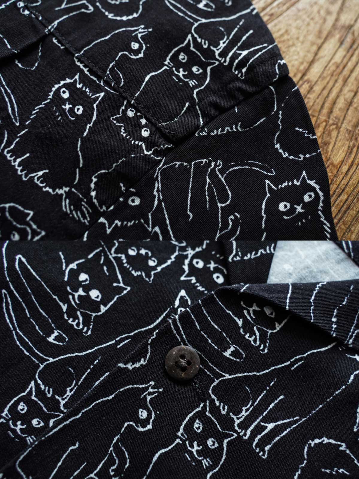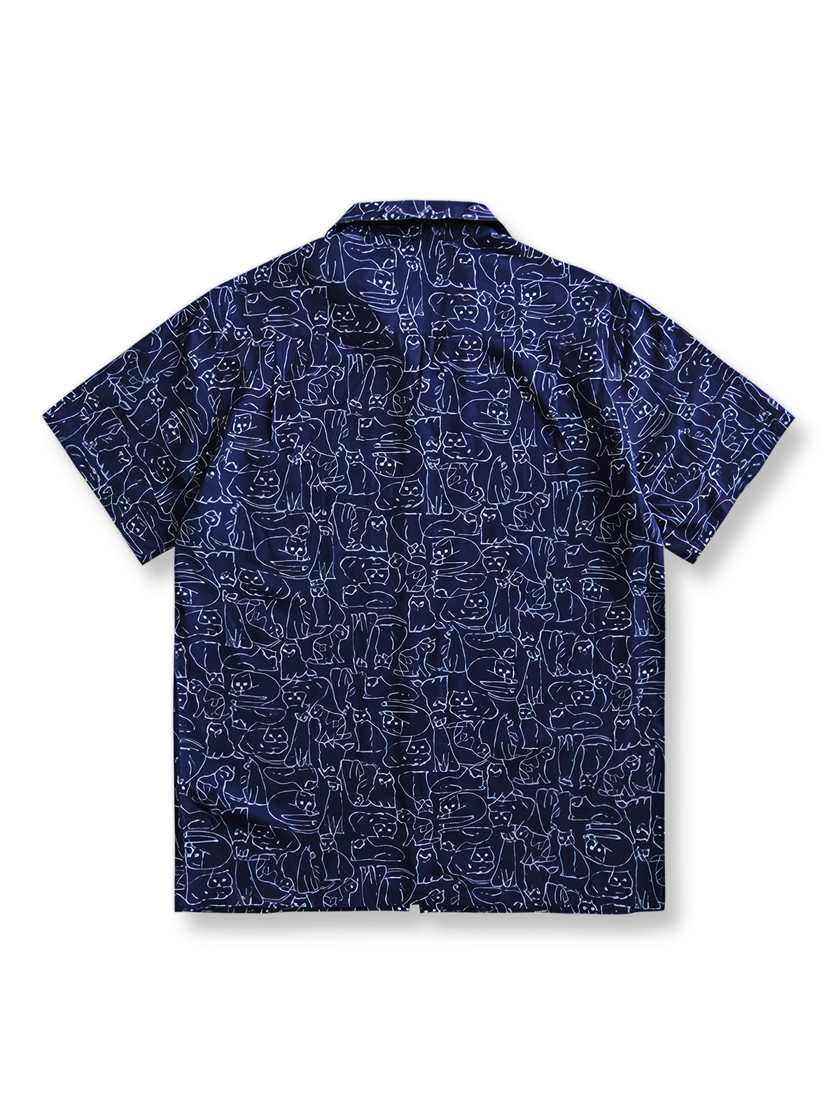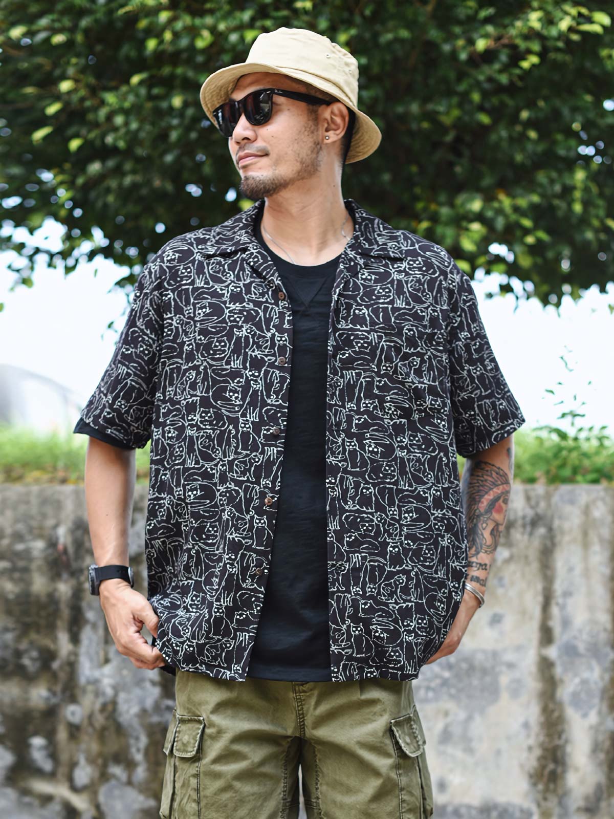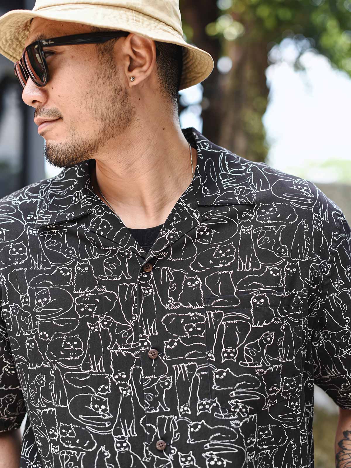 手描き風の猫柄が特徴の、ゆったりとしたハワイアンスタイルの半袖シャツ。