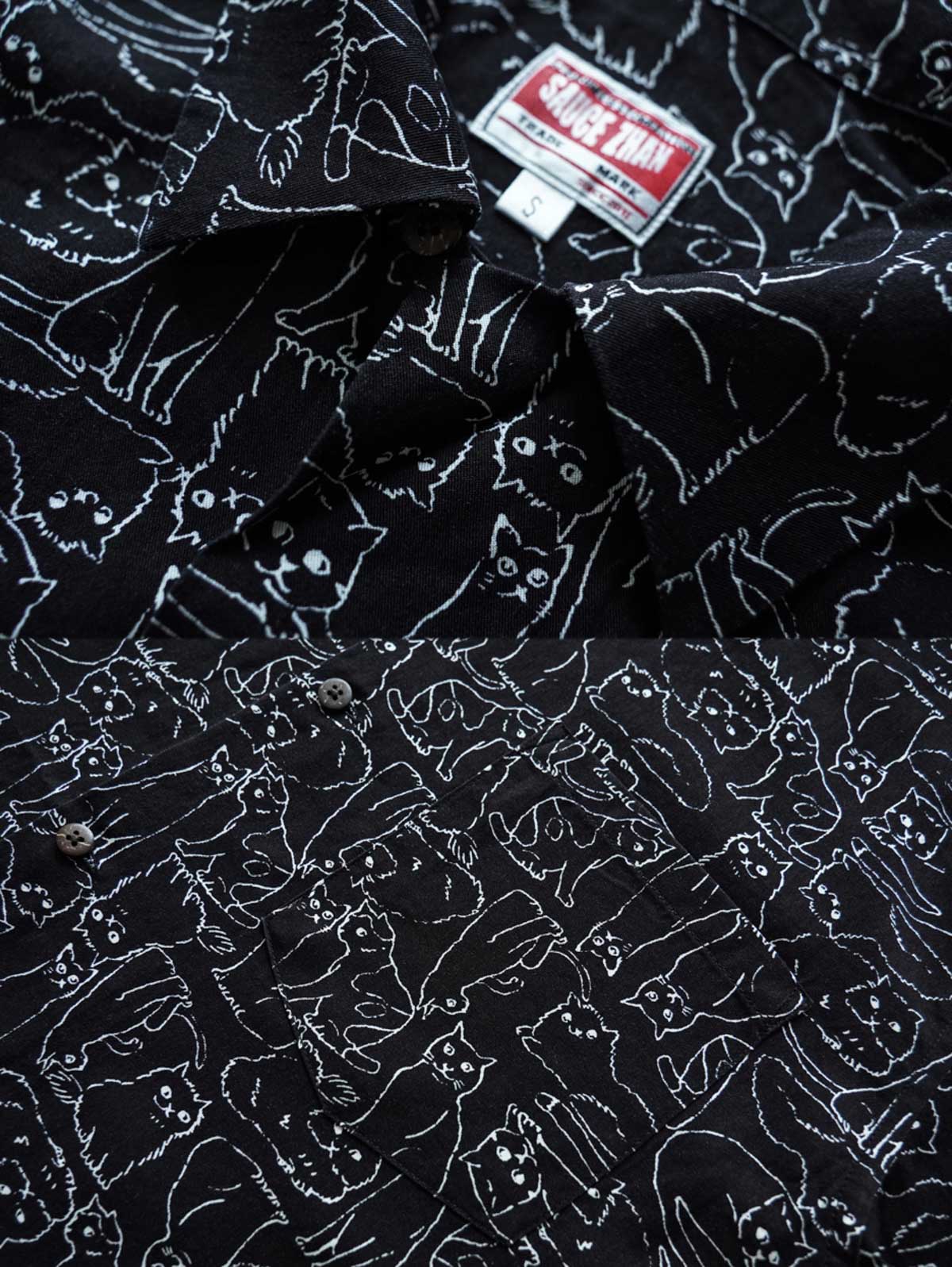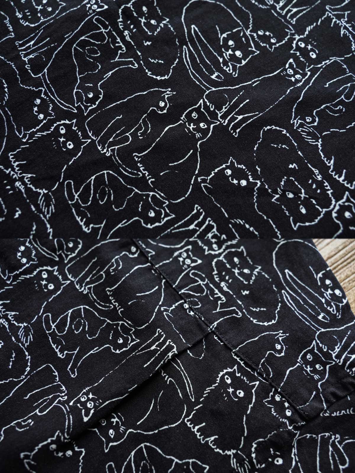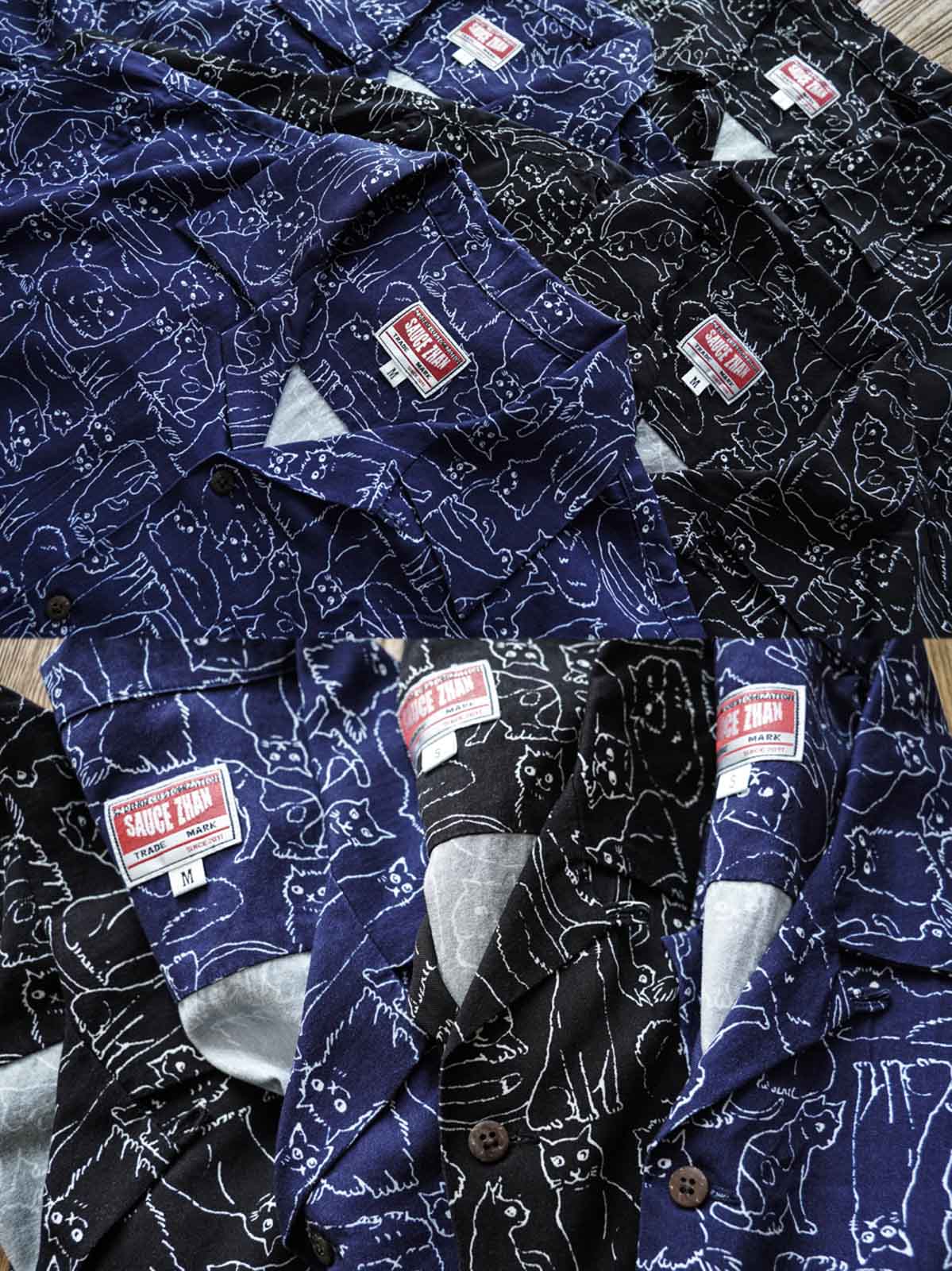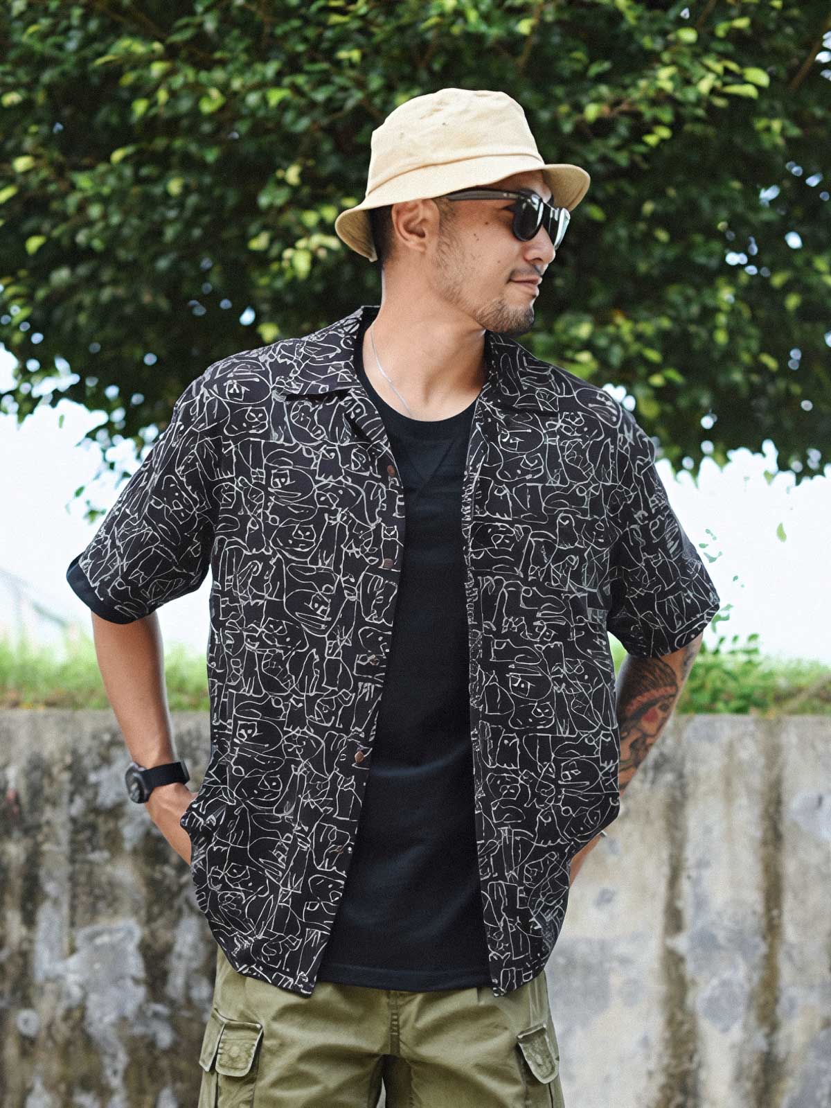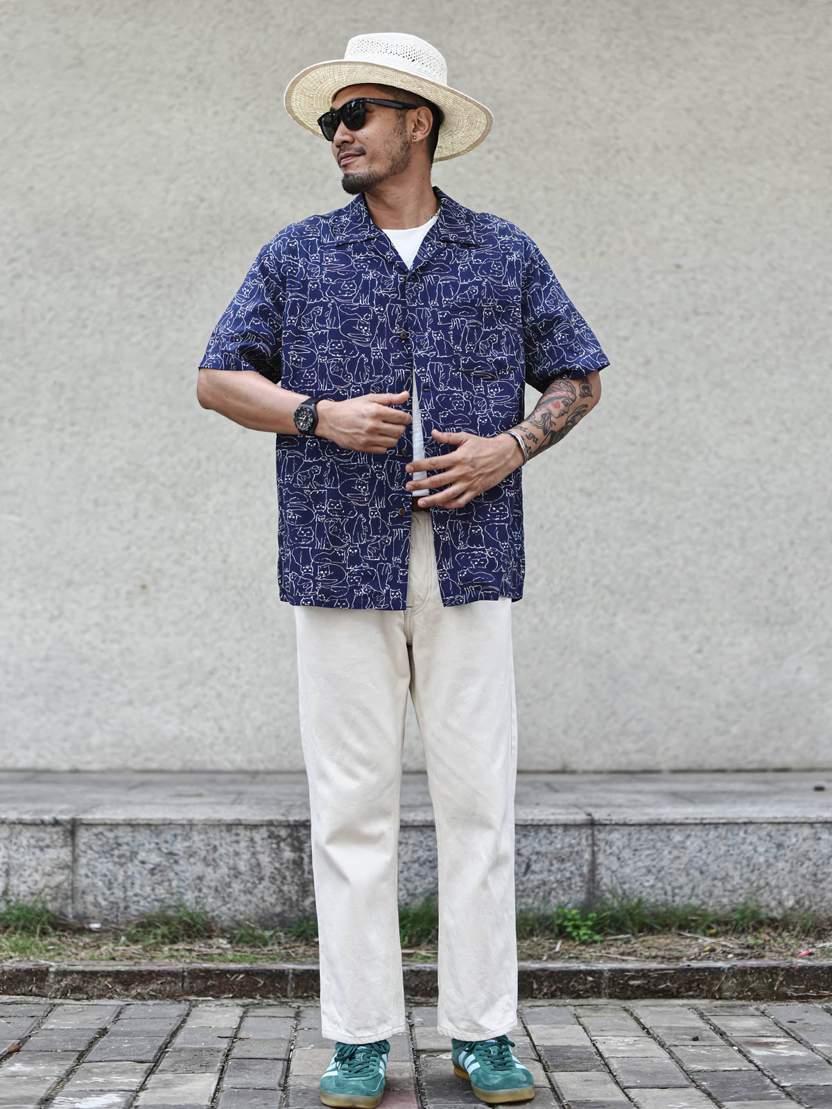 手描き風の猫柄が特徴の、ゆったりとしたハワイアンスタイルの半袖シャツ。