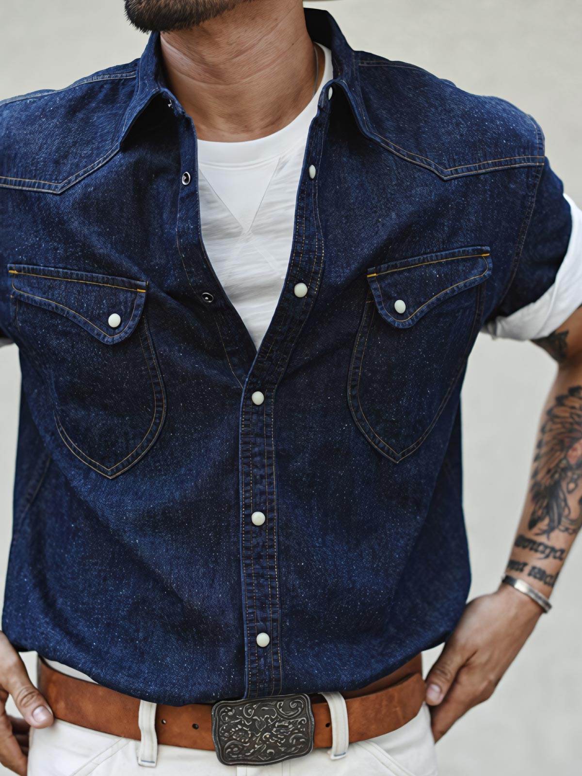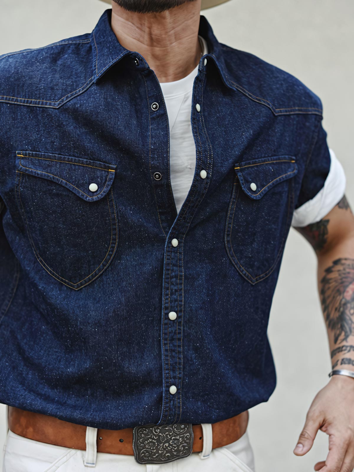 レトロなデザインとコットンリネン素材を組み合わせた、快適でユニークな夏のデニム半袖シャツ。