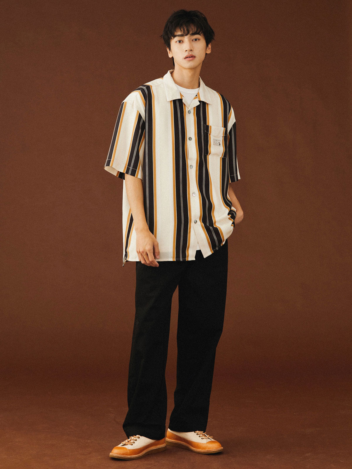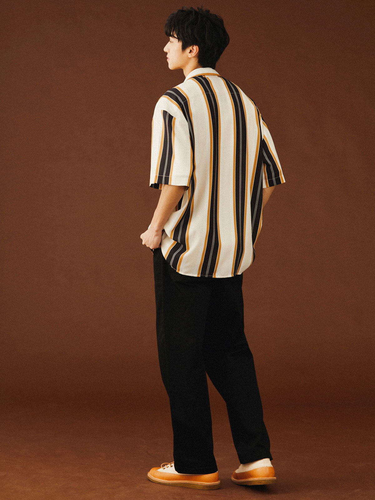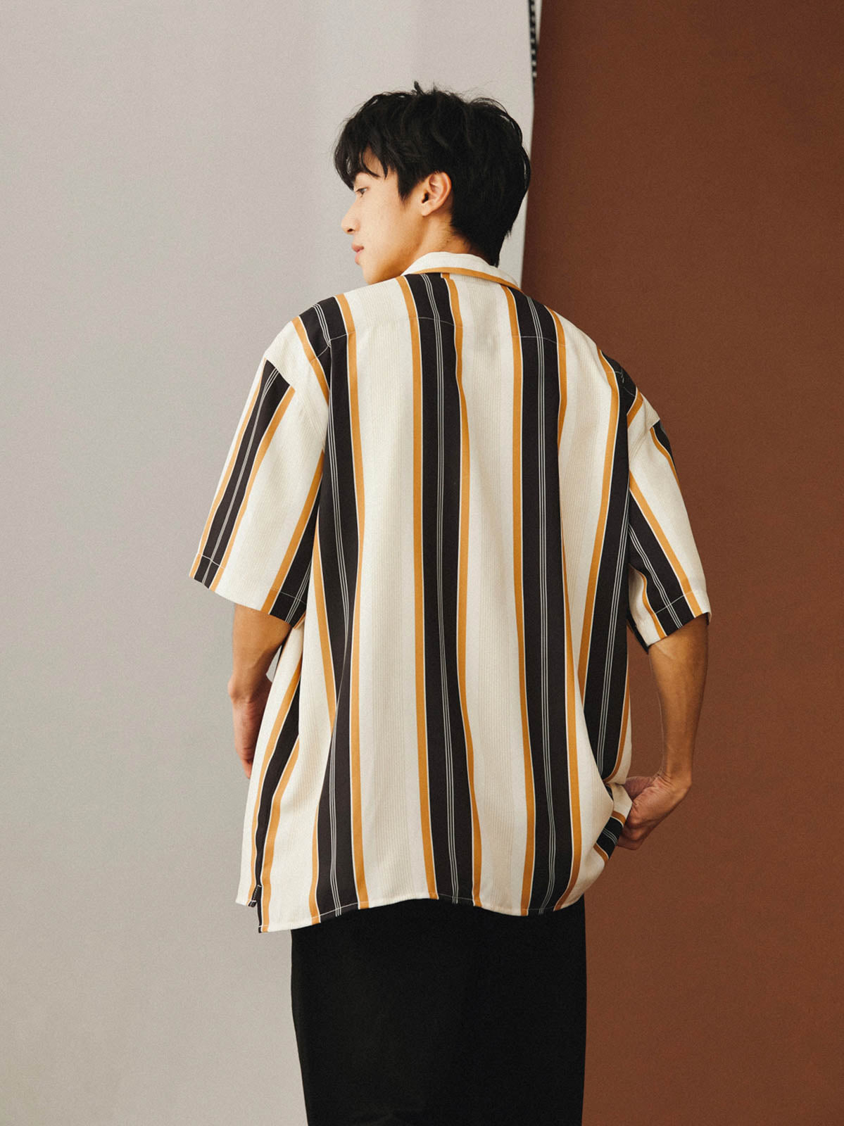 この日本風ストライプハワイアン半袖シャツは、伝統的なハワイアンシャツのリラックスしたデザインに、日本のストリートファッションの要素を融合しています。クラシックなストライプパターンと大胆な色使いで、70年代から80年代のレトロトレンドを反映し、現代の男性にカジュアルで個性的なスタイルを提供します