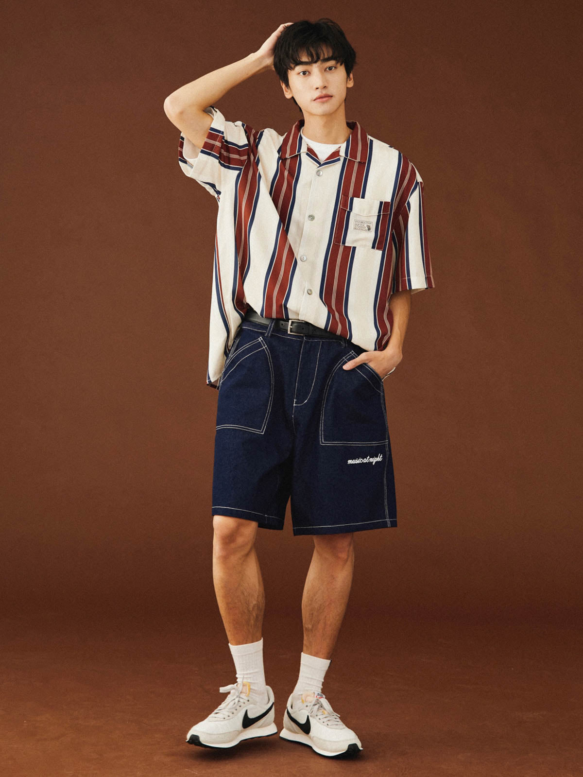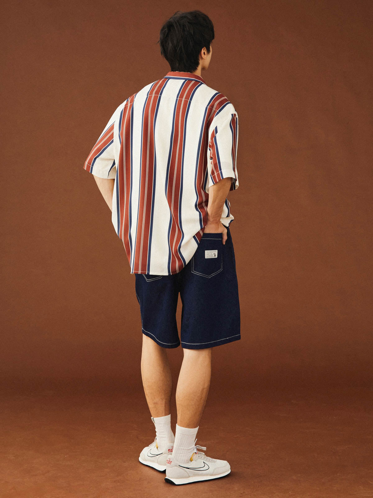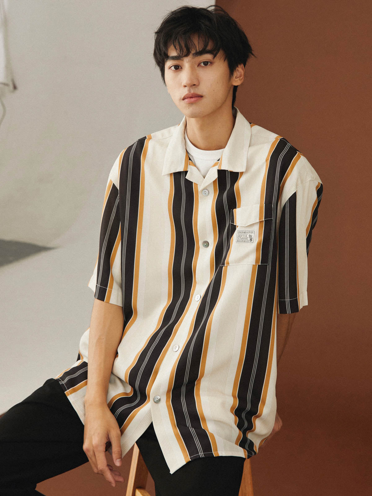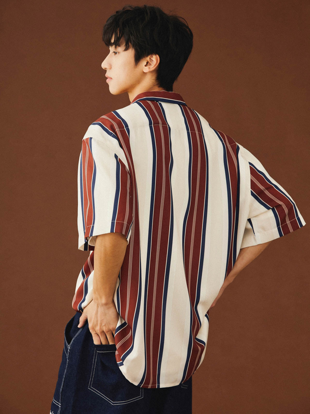 この日本風ストライプハワイアン半袖シャツは、伝統的なハワイアンシャツのリラックスしたデザインに、日本のストリートファッションの要素を融合しています。クラシックなストライプパターンと大胆な色使いで、70年代から80年代のレトロトレンドを反映し、現代の男性にカジュアルで個性的なスタイルを提供します