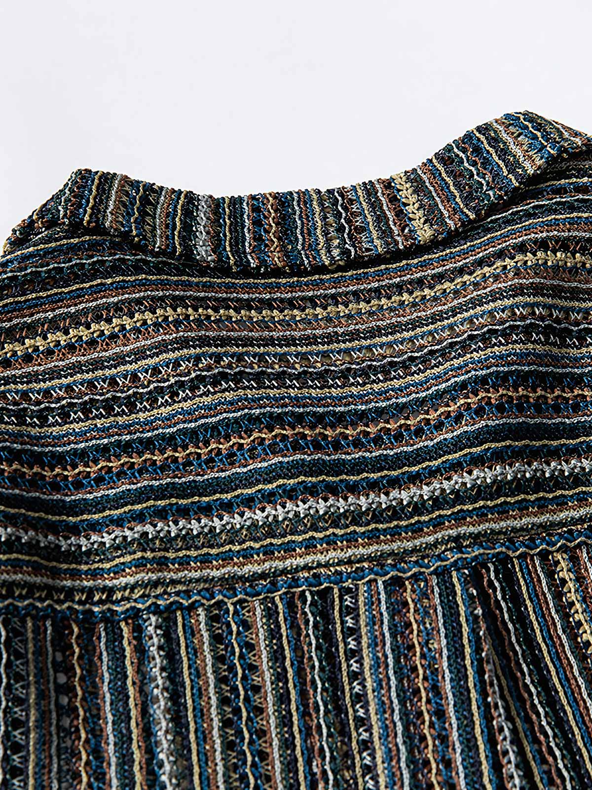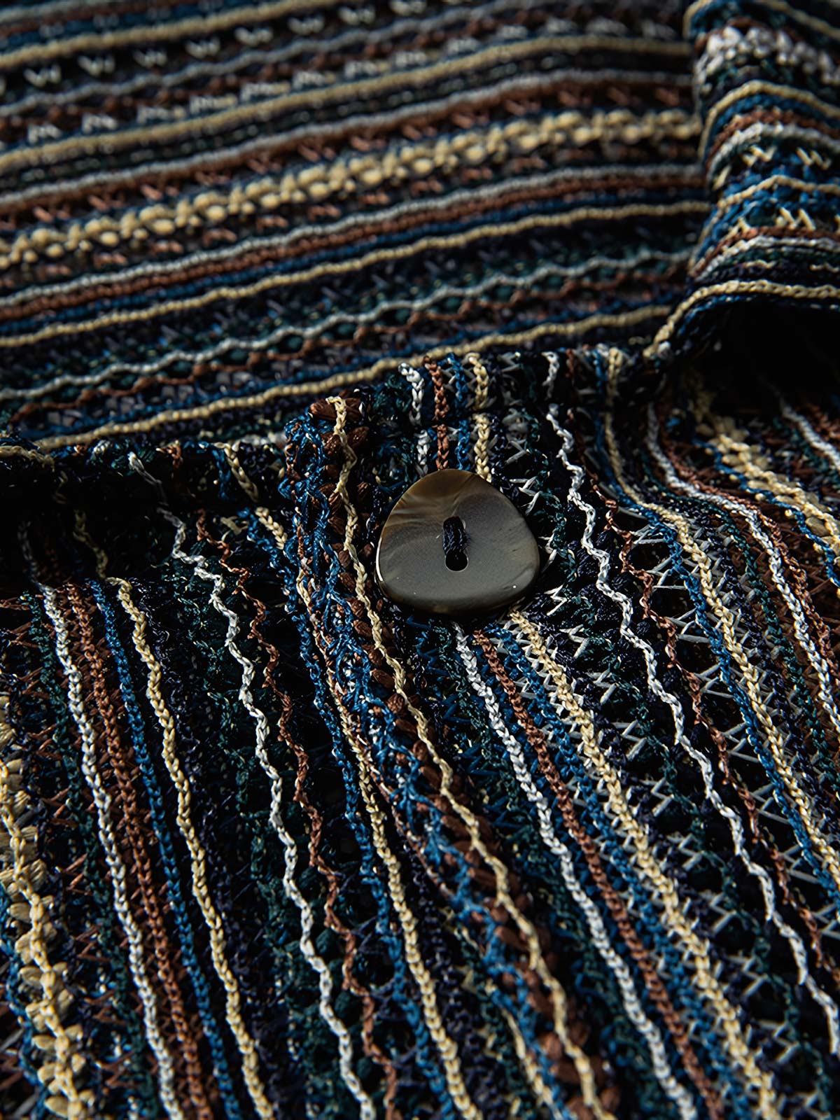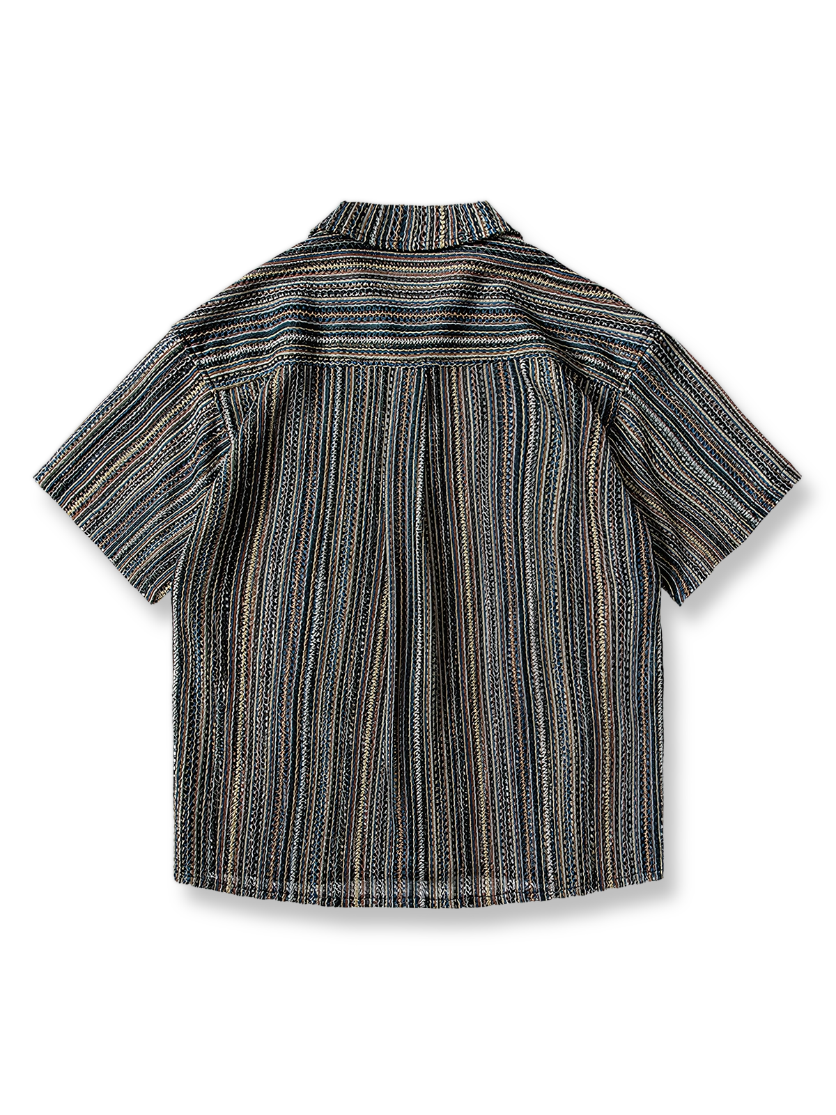 カラフルな縦ストライプデザインとオープンワーク工芸が融合した、独特なヴィンテージスタイルの半袖シャツ。