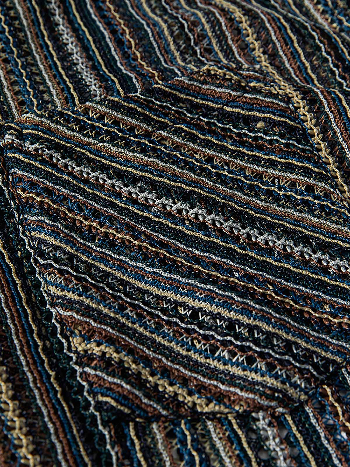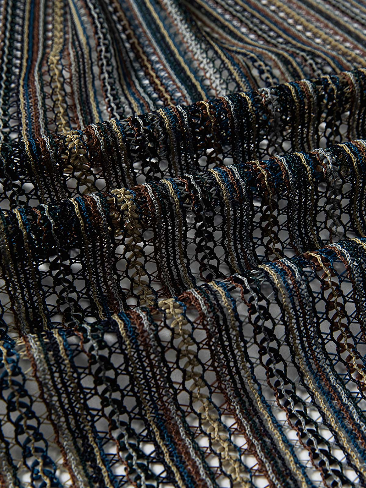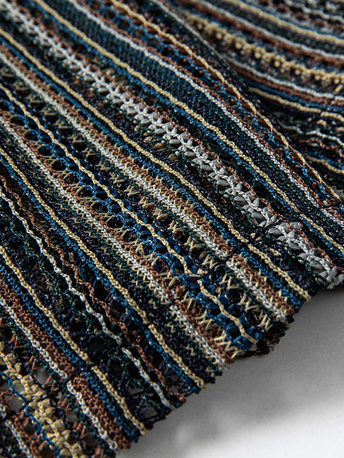 カラフルな縦ストライプデザインとオープンワーク工芸が融合した、独特なヴィンテージスタイルの半袖シャツ。