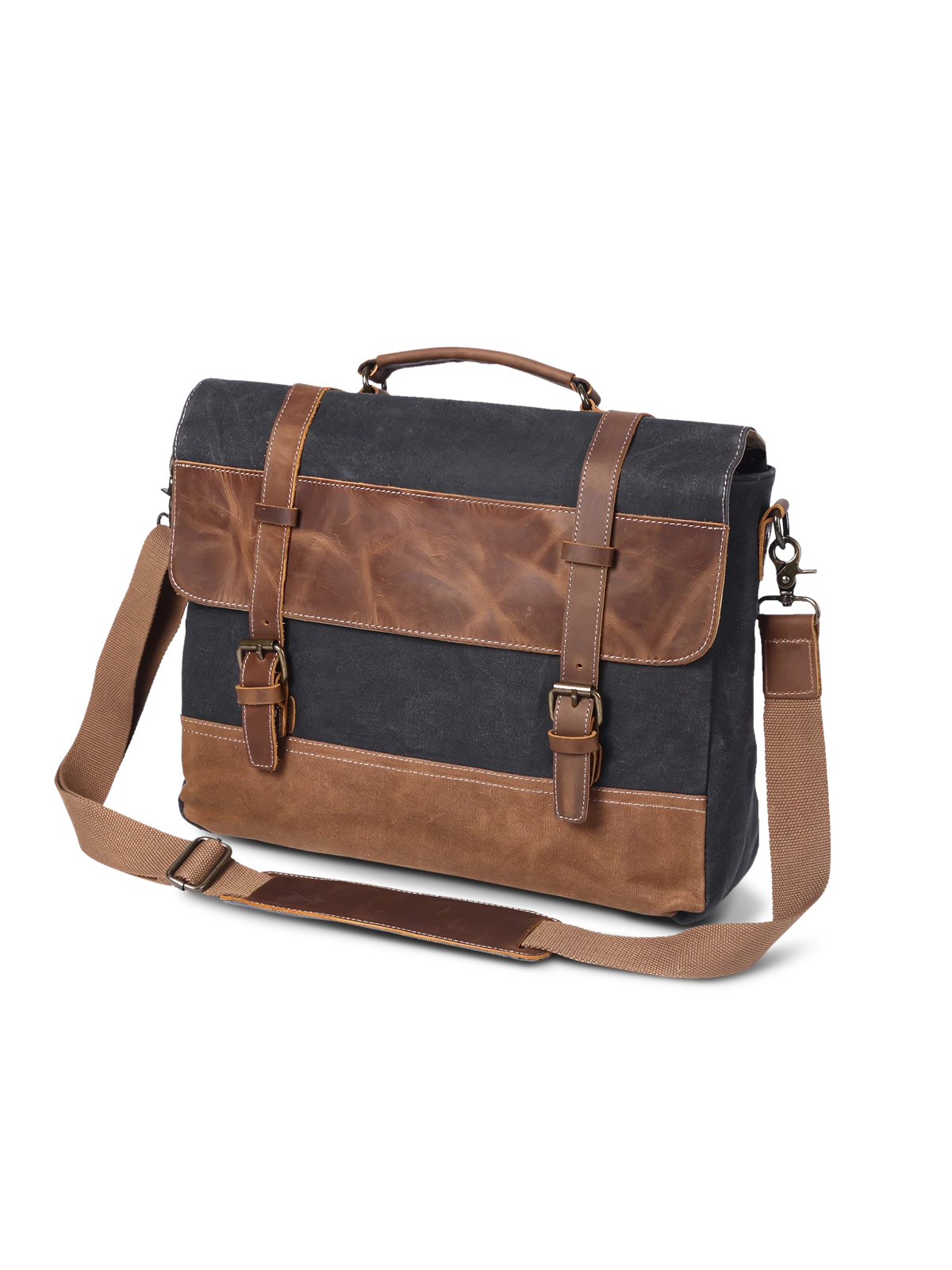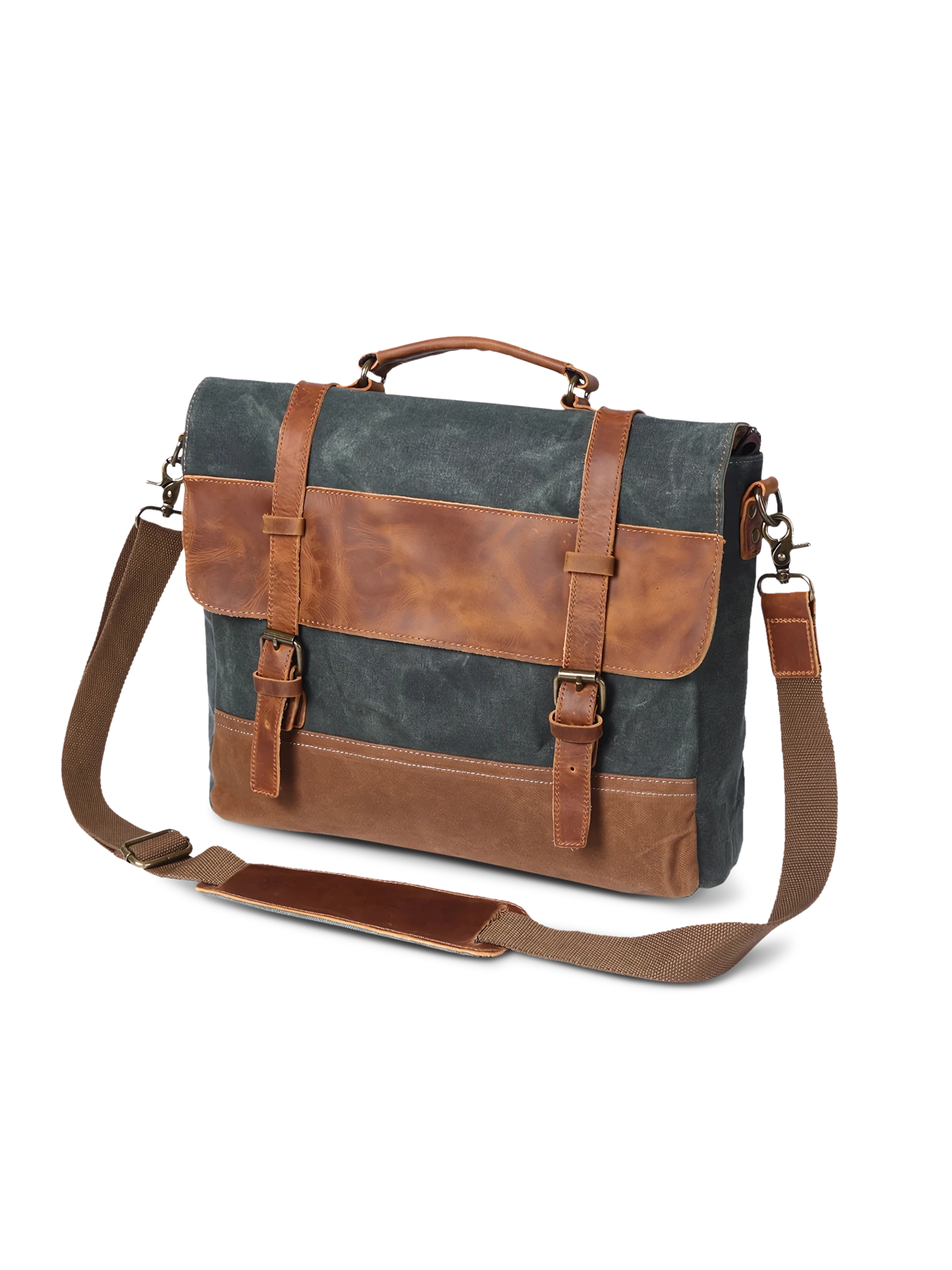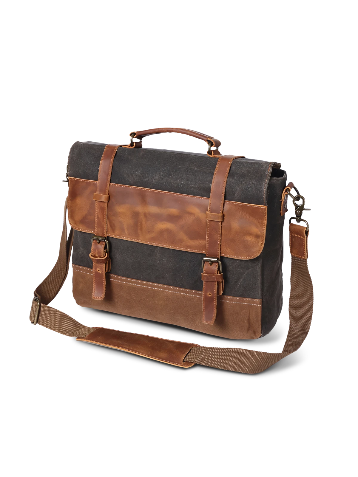 耐久性と防水性に優れたオイルワックスキャンバスと高級レザーを組み合わせたブリーフケース。ビジネスにもカジュアルにも適した一品。