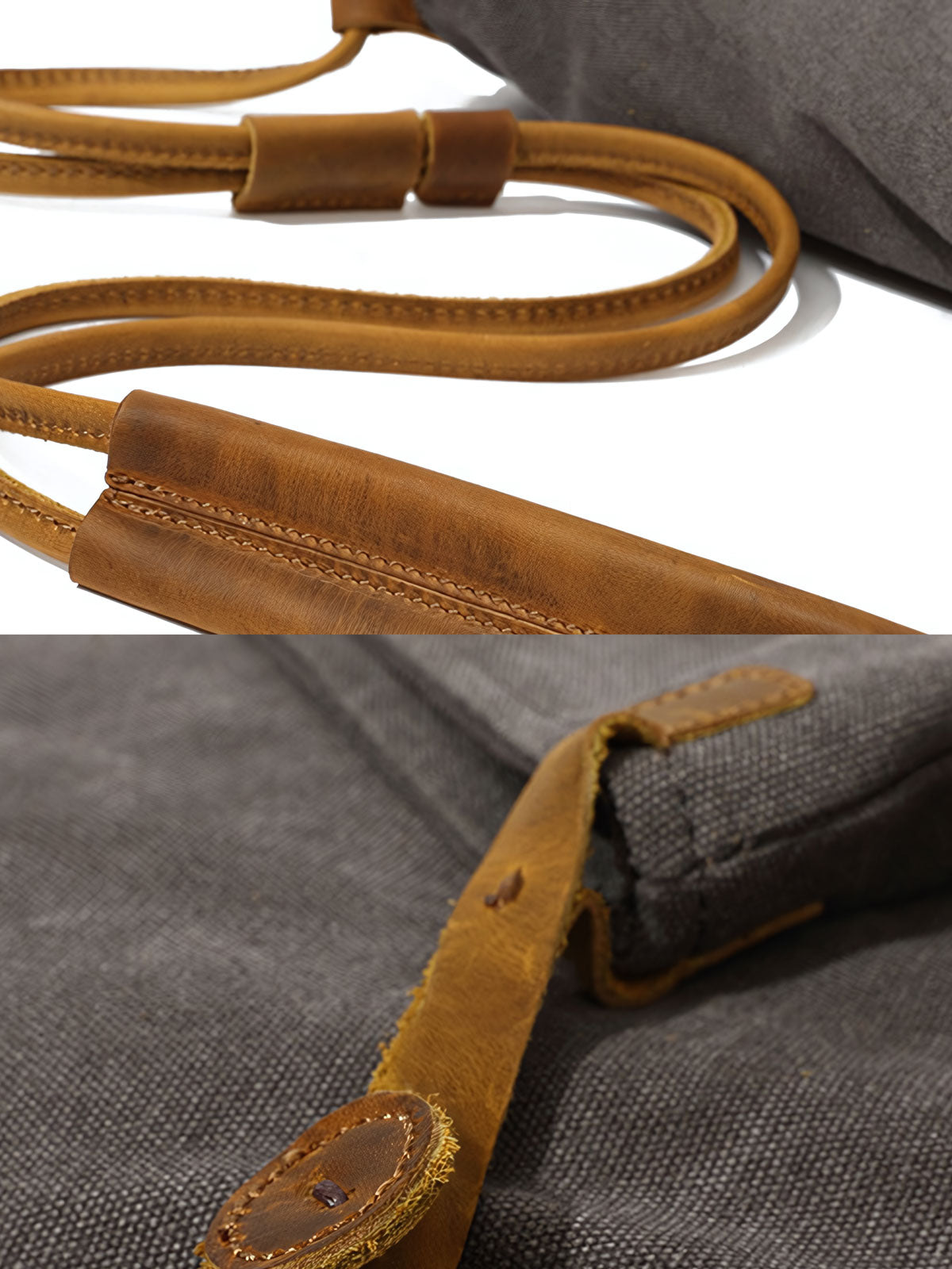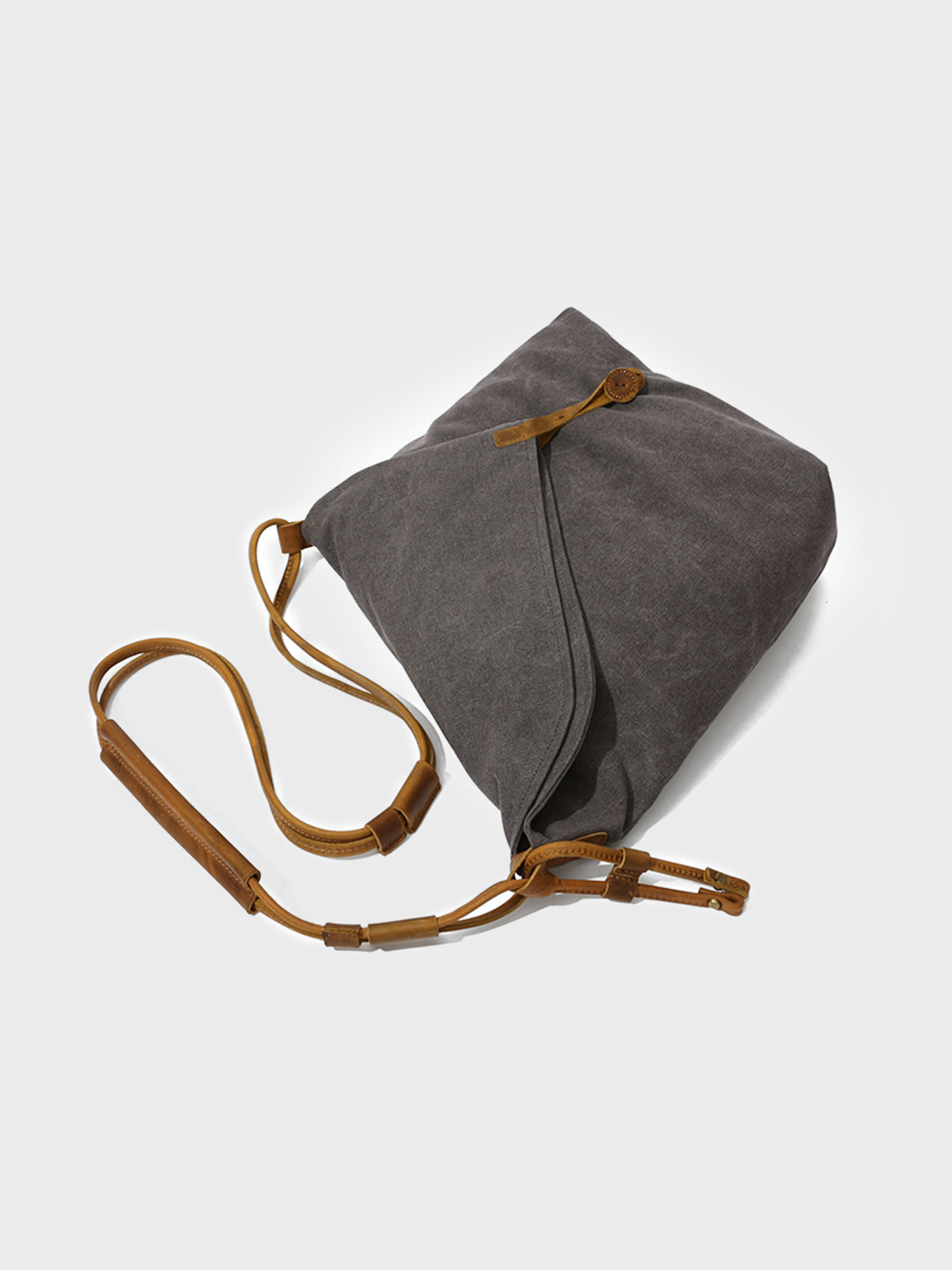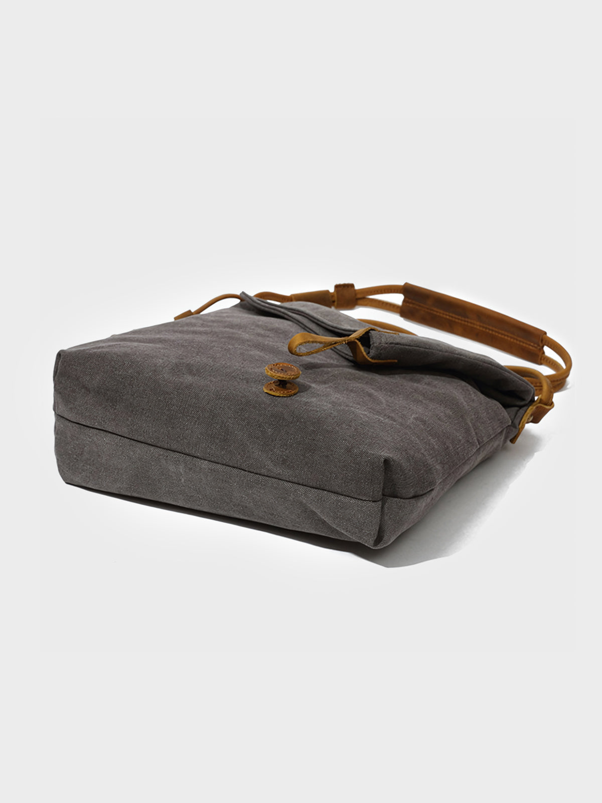 バッグ本体は高密度キャンバスで作られ、茶色のレザーのディテールが全体の耐久性と美観を高めています。シンプルな折り返しフラップとレザーの紐で閉じる方式は、ミニマリストデザイン哲学の追求を体現しています。