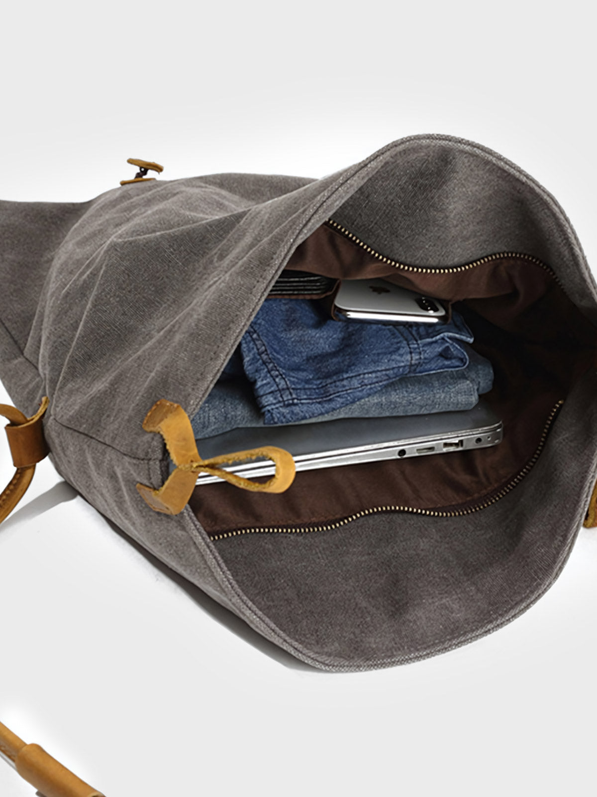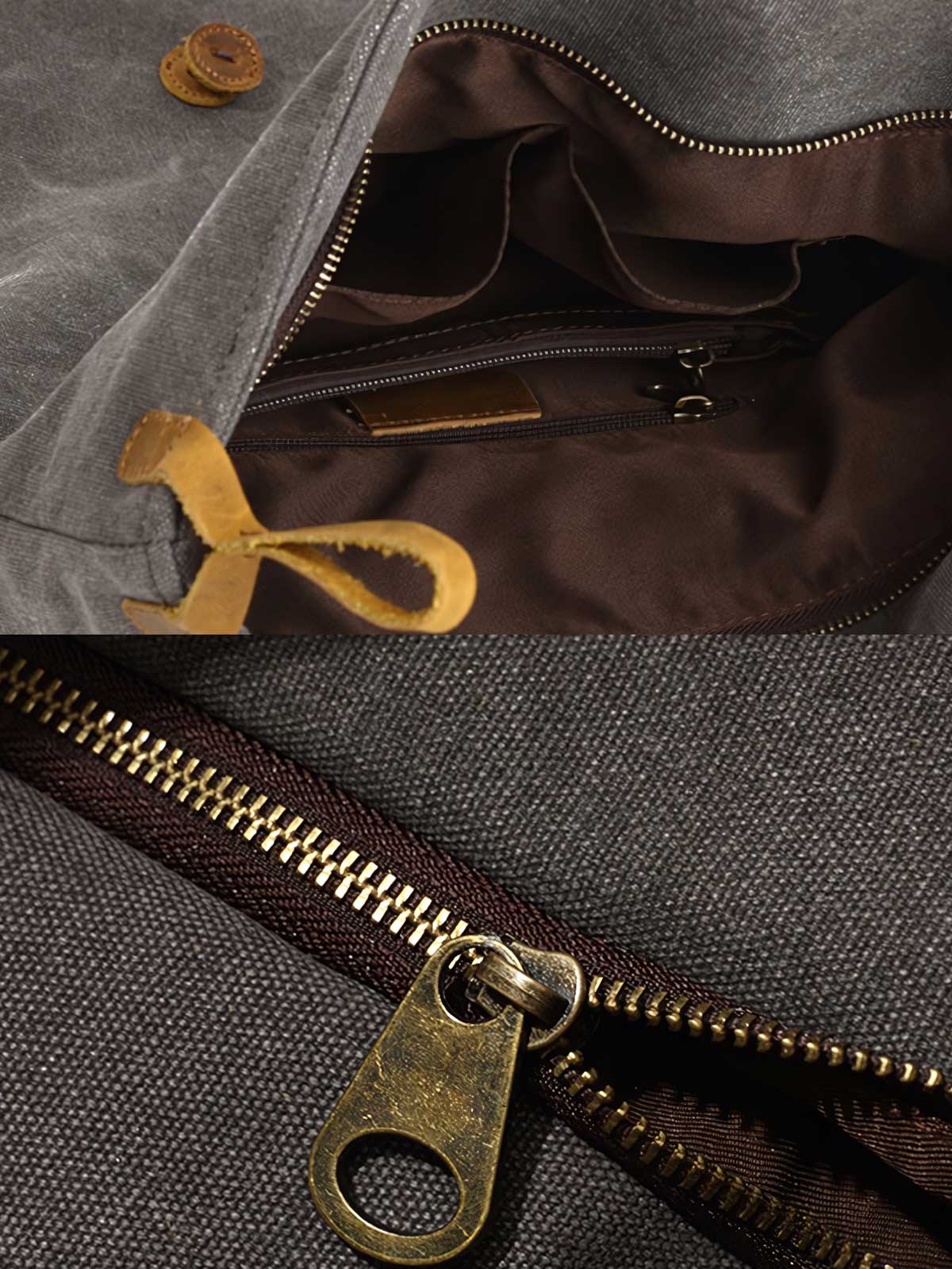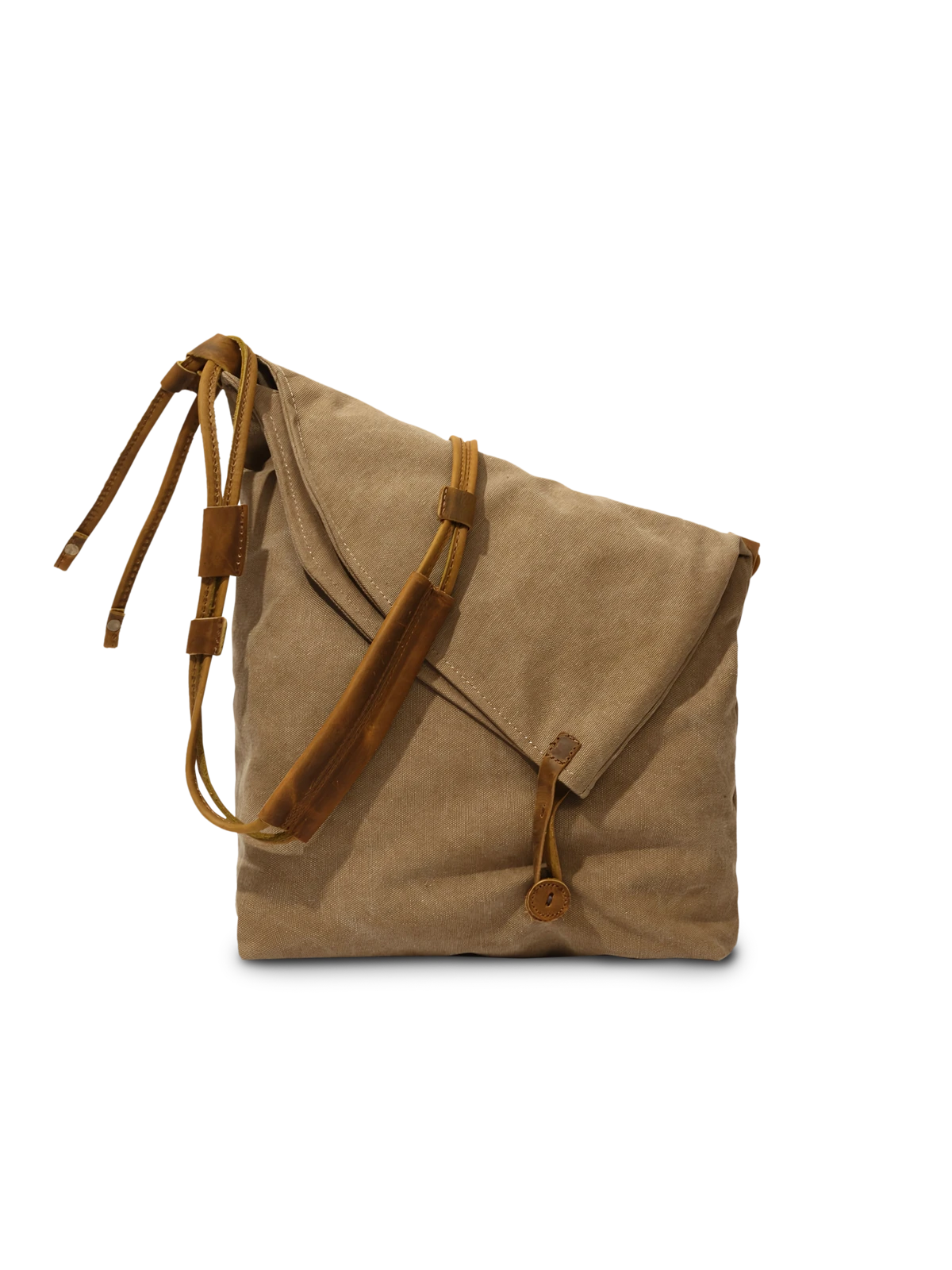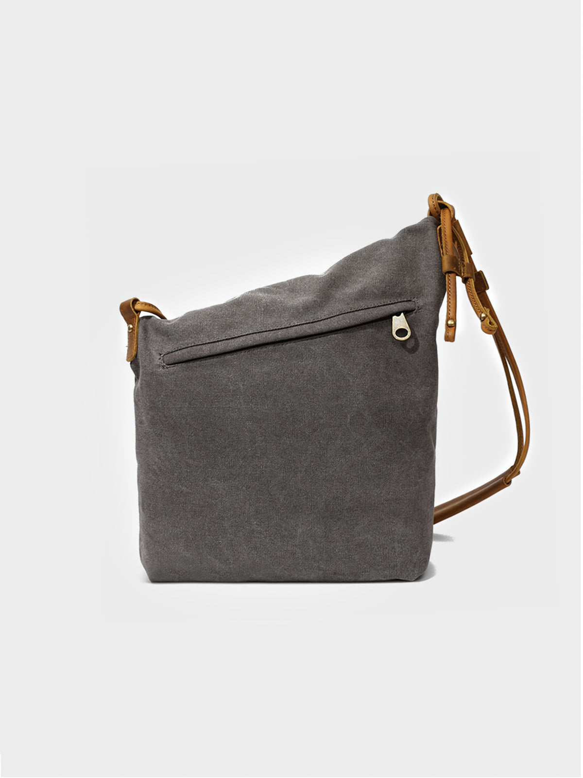 バッグ本体は高密度キャンバスで作られ、茶色のレザーのディテールが全体の耐久性と美観を高めています。シンプルな折り返しフラップとレザーの紐で閉じる方式は、ミニマリストデザイン哲学の追求を体現しています。