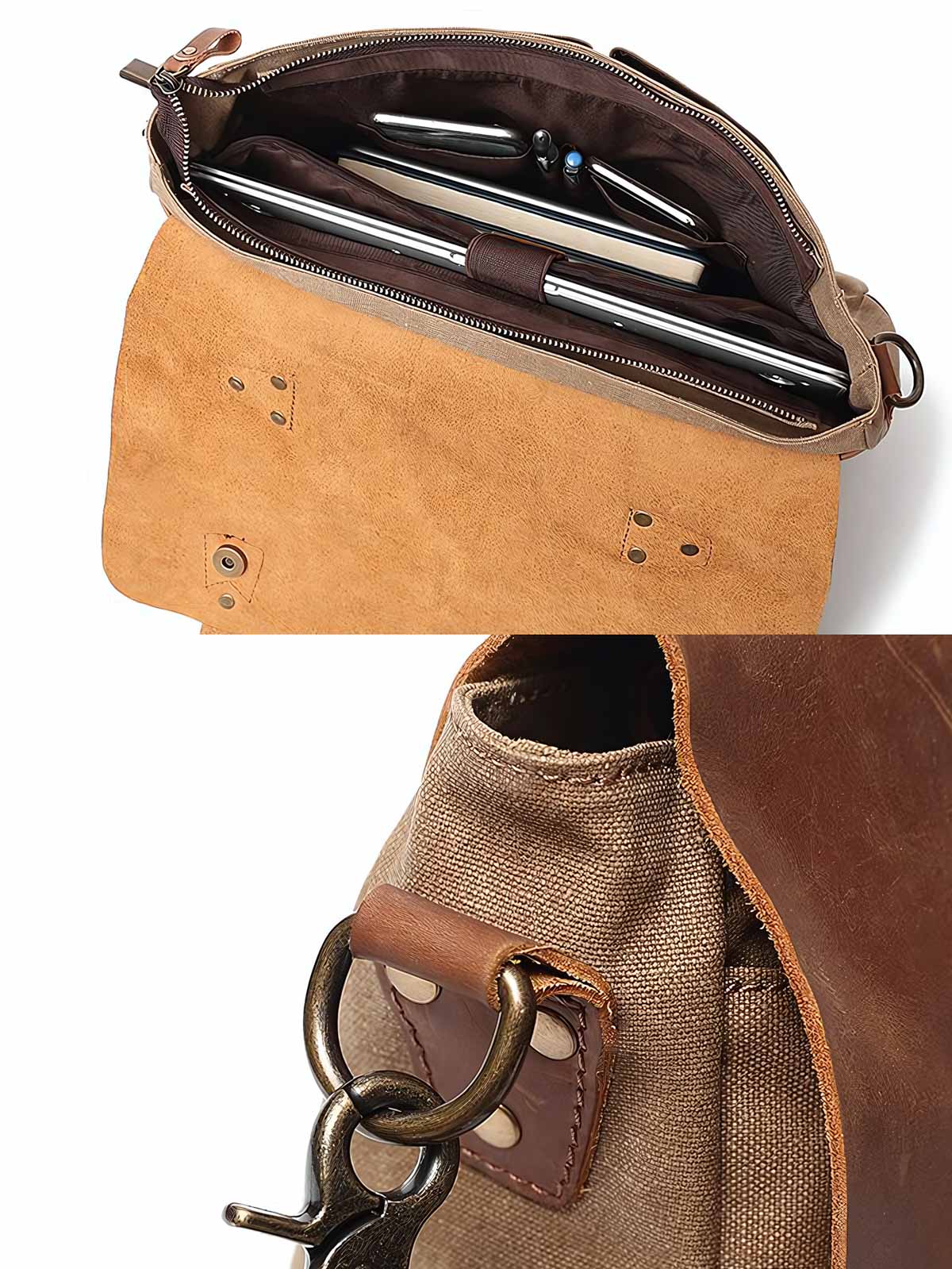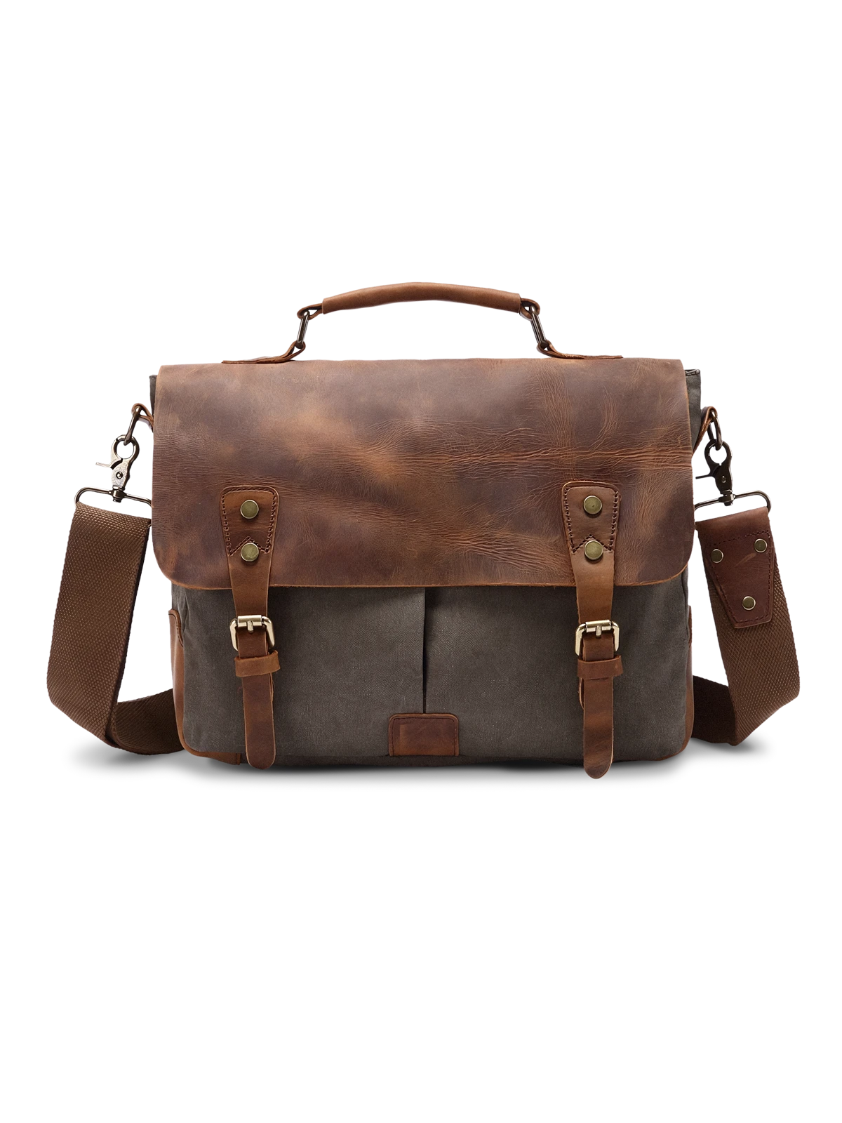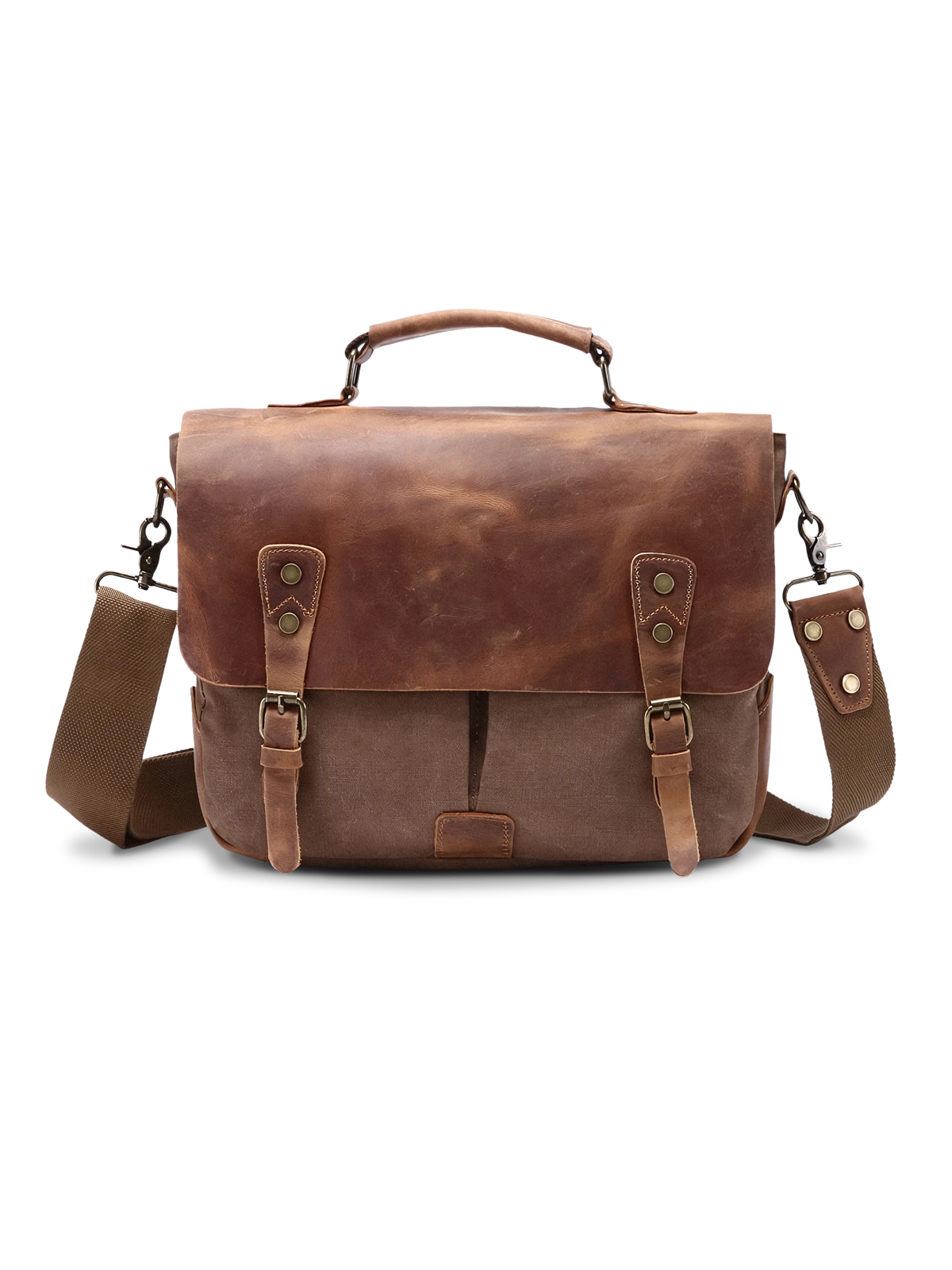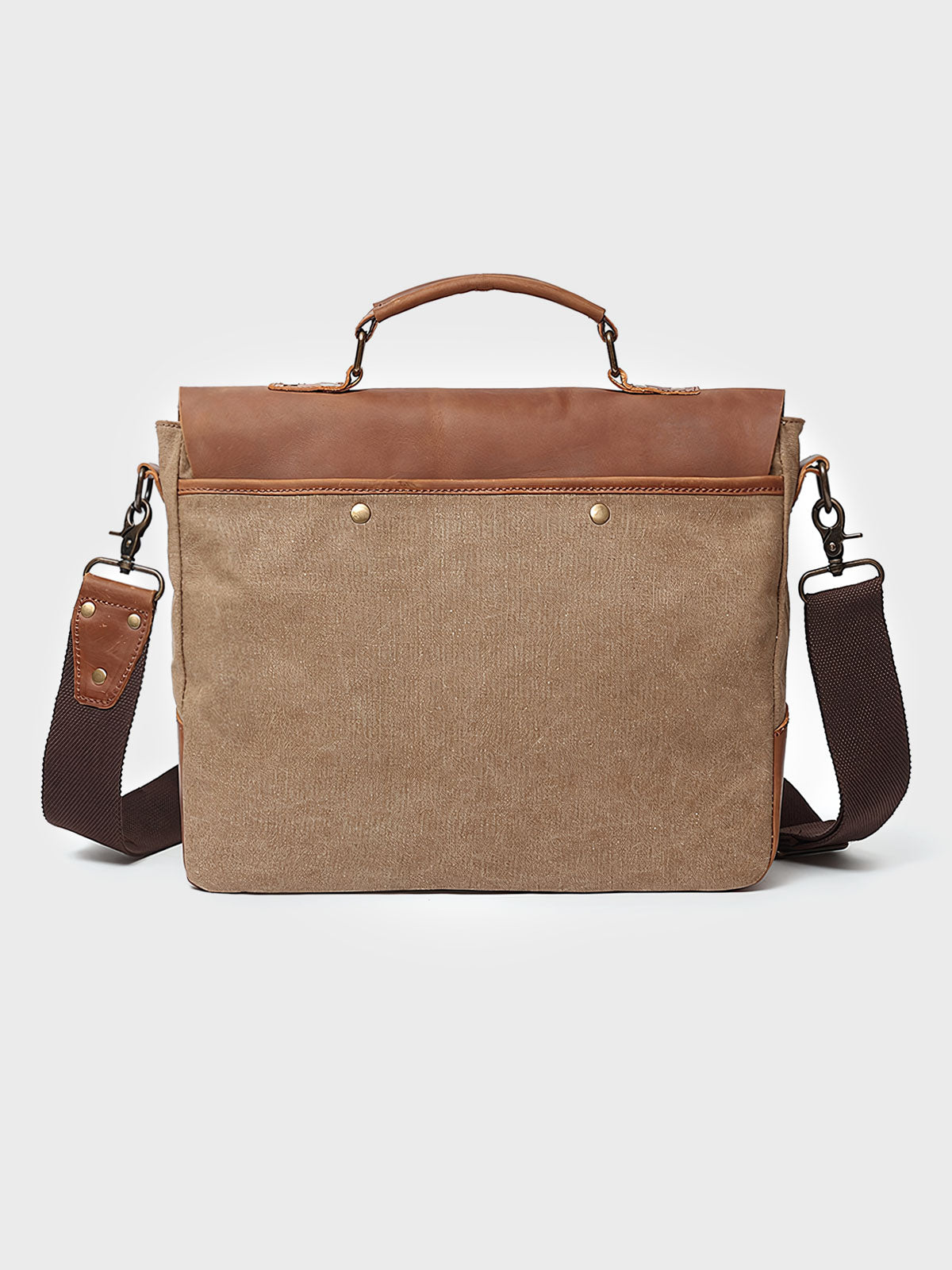 耐久性のあるキャンバス生地と本革の詳細、真鍮の金具が、クラシカルで高級感ある外観を演出します。バッグの各部は精巧に作られ、使い込むほどに味が出る素材を使用しています。ビジネスカジュアルな装いにマッチし、ラップトップや書類などの仕事用アイテムとの組み合わせに適しています。