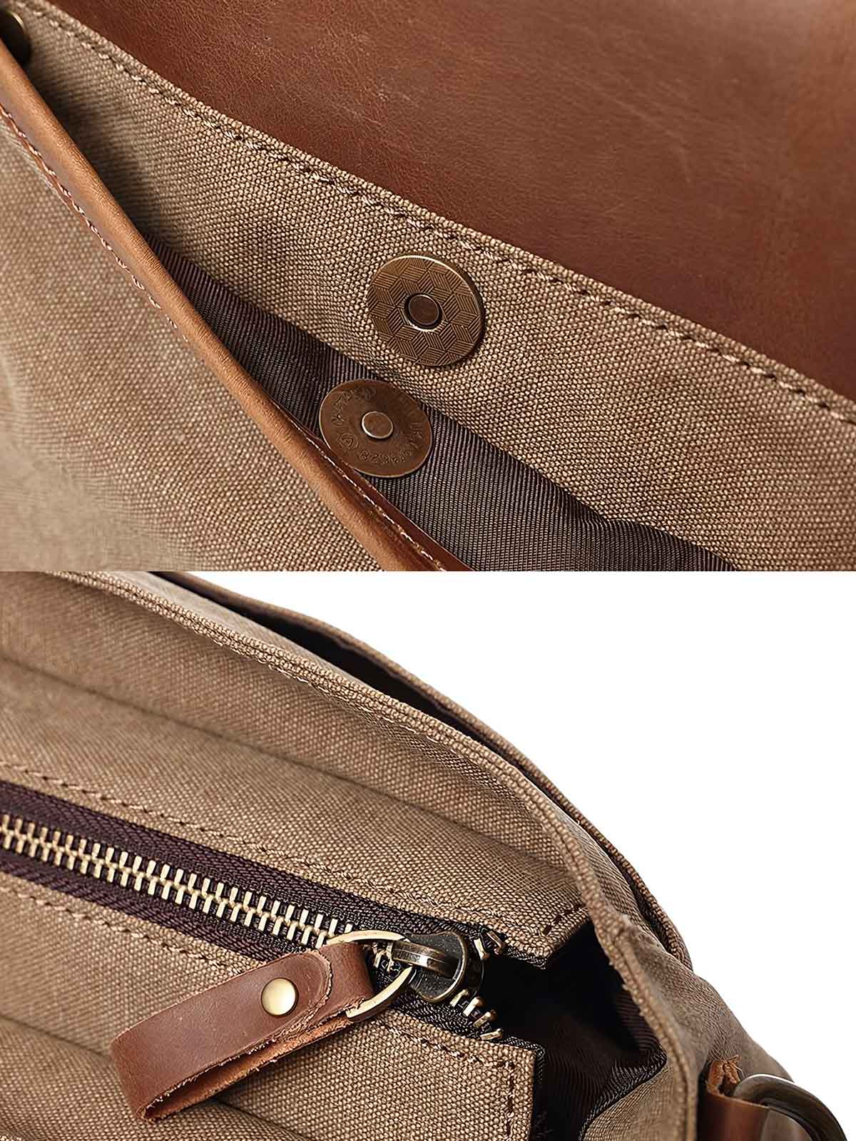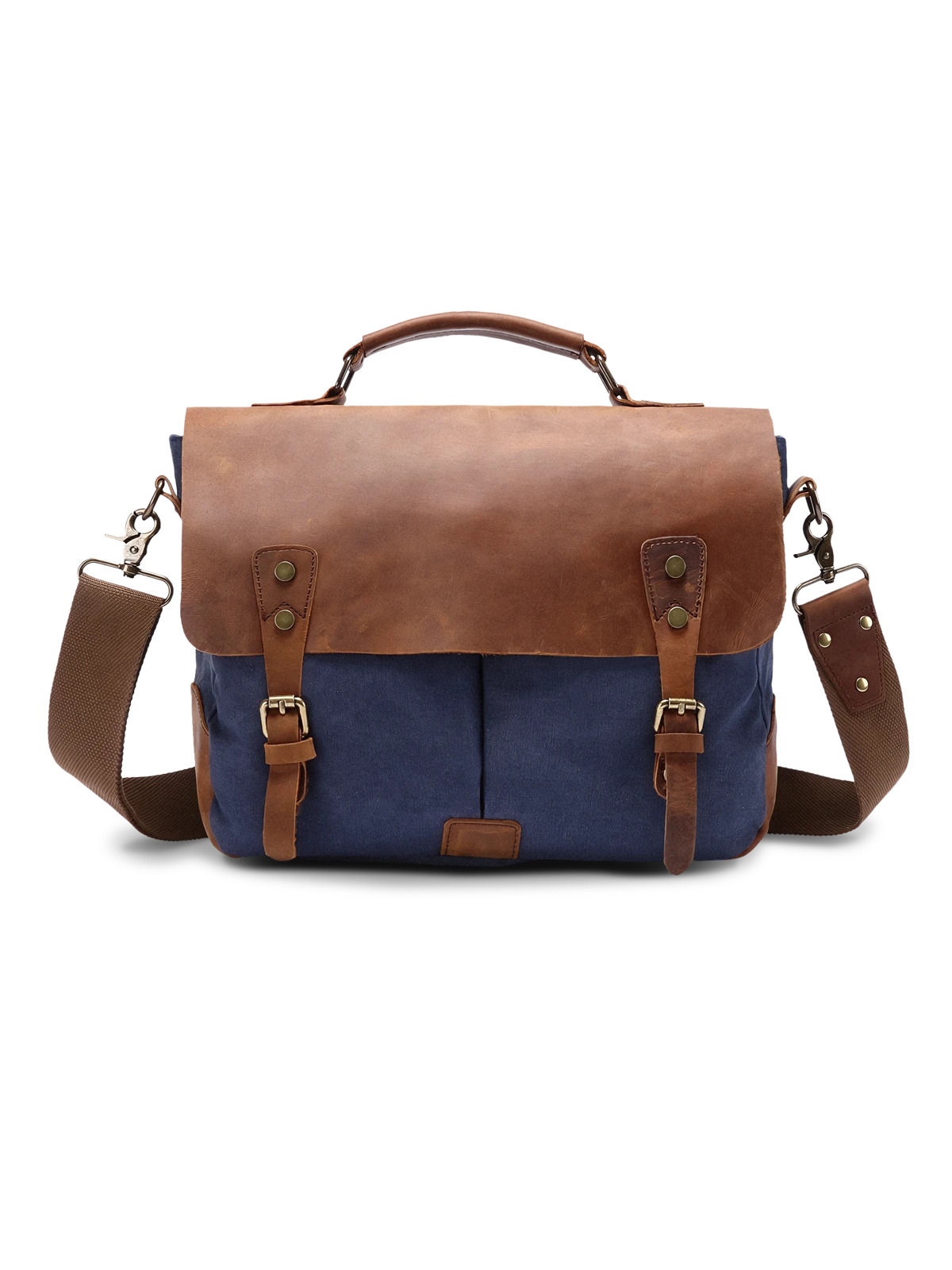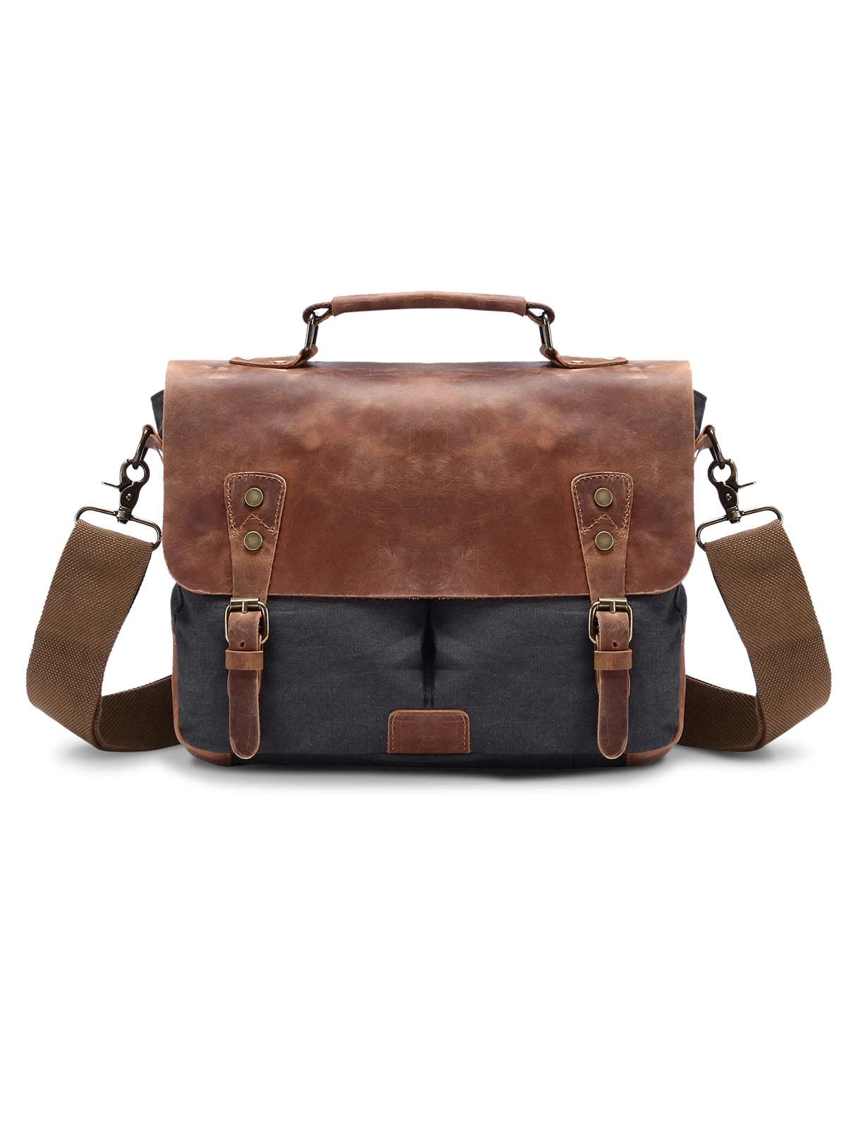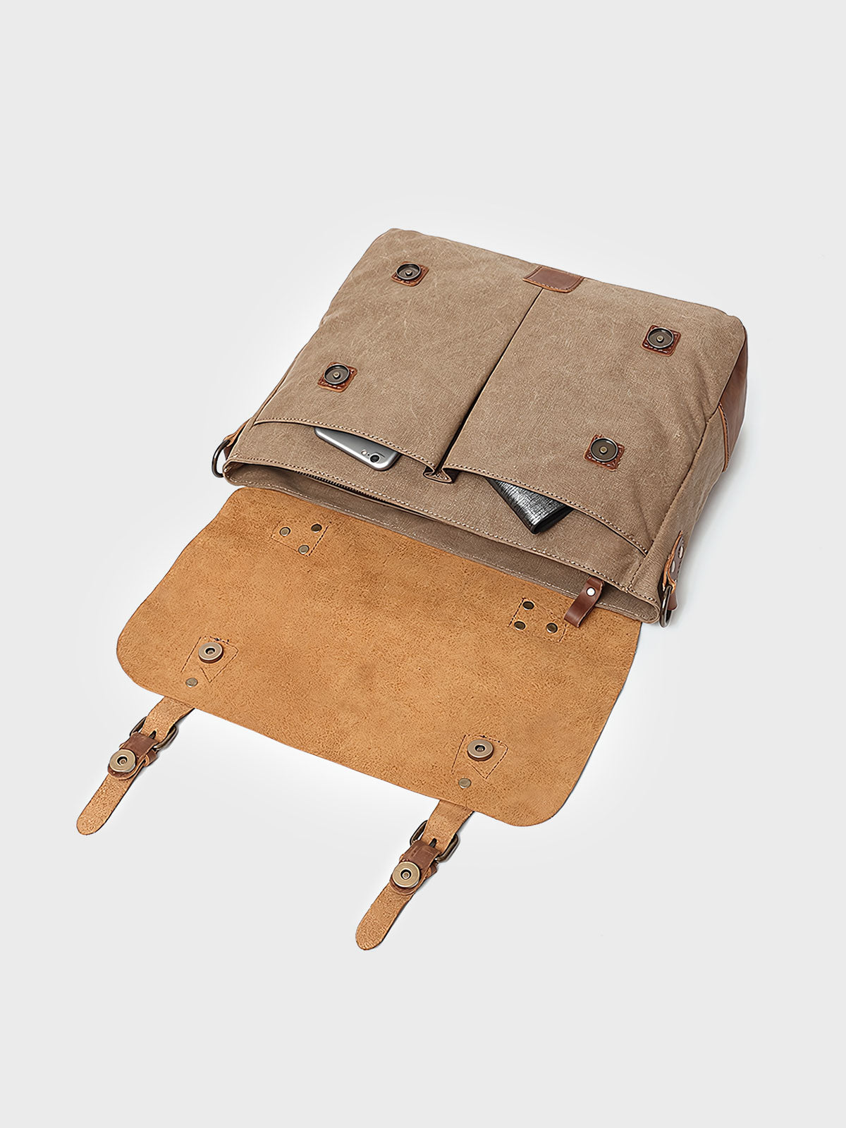 耐久性のあるキャンバス生地と本革の詳細、真鍮の金具が、クラシカルで高級感ある外観を演出します。バッグの各部は精巧に作られ、使い込むほどに味が出る素材を使用しています。ビジネスカジュアルな装いにマッチし、ラップトップや書類などの仕事用アイテムとの組み合わせに適しています。