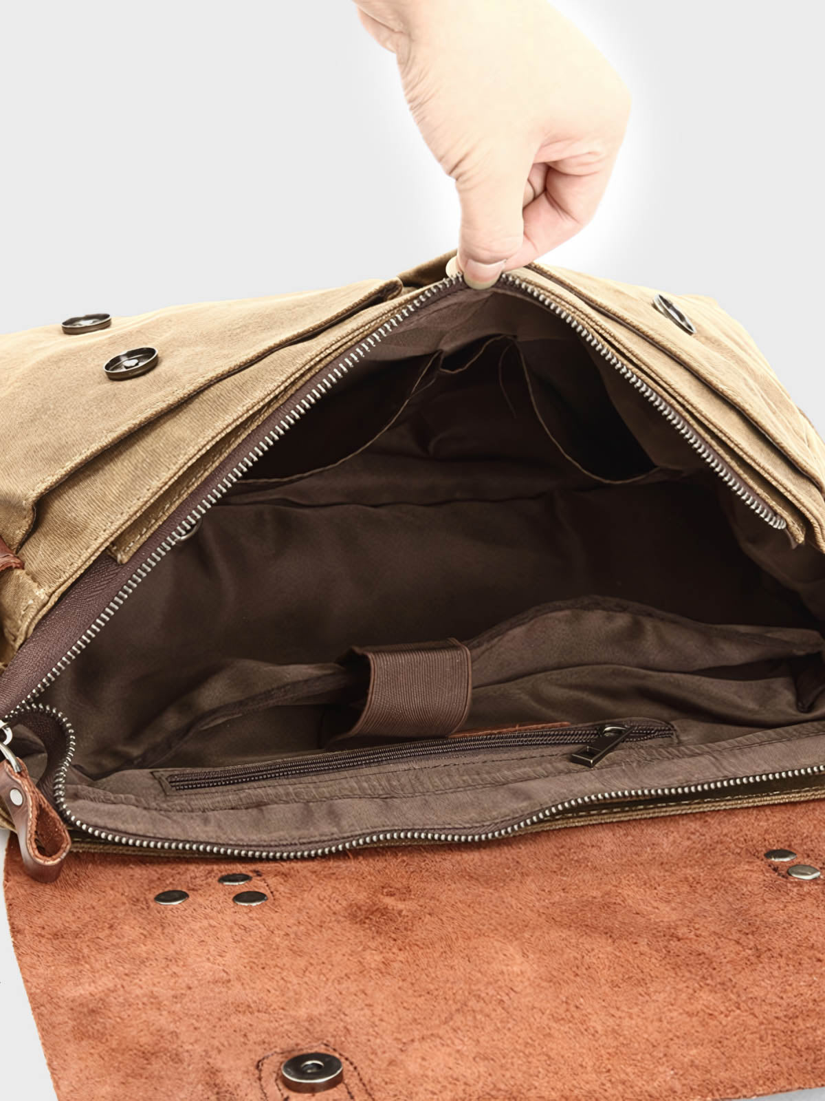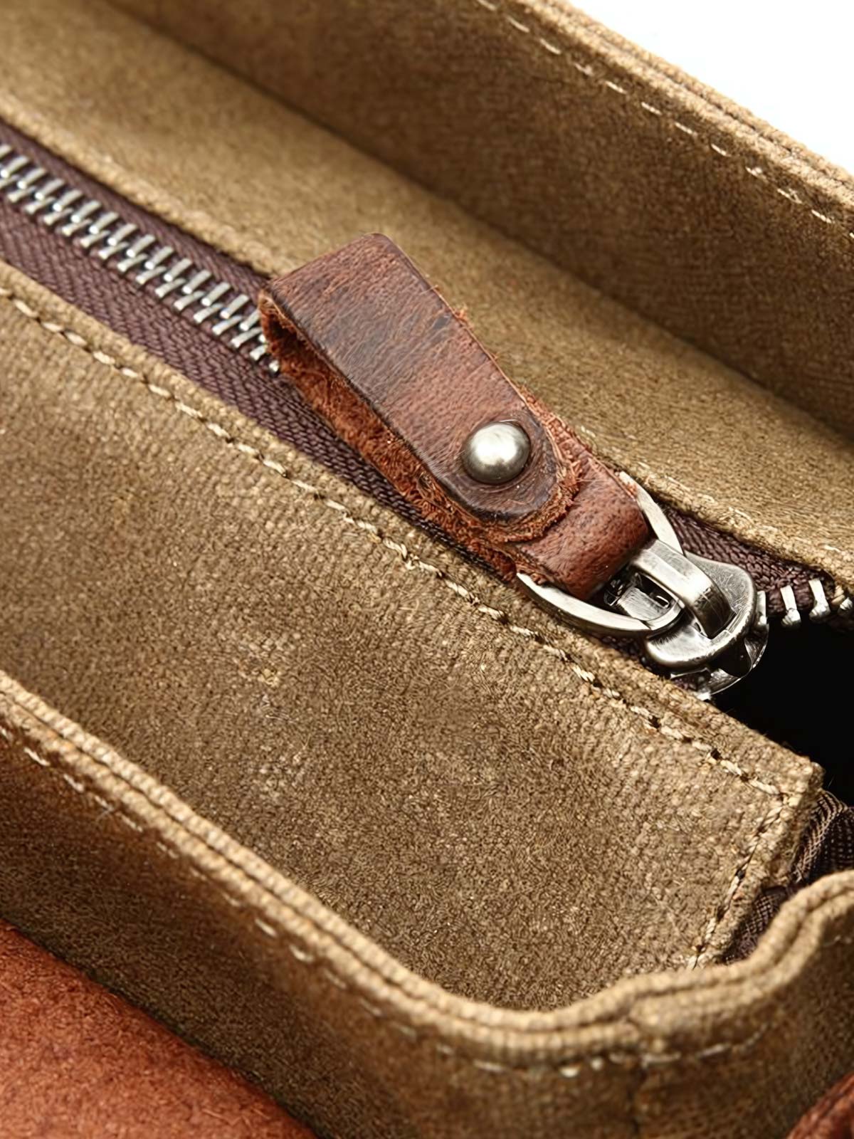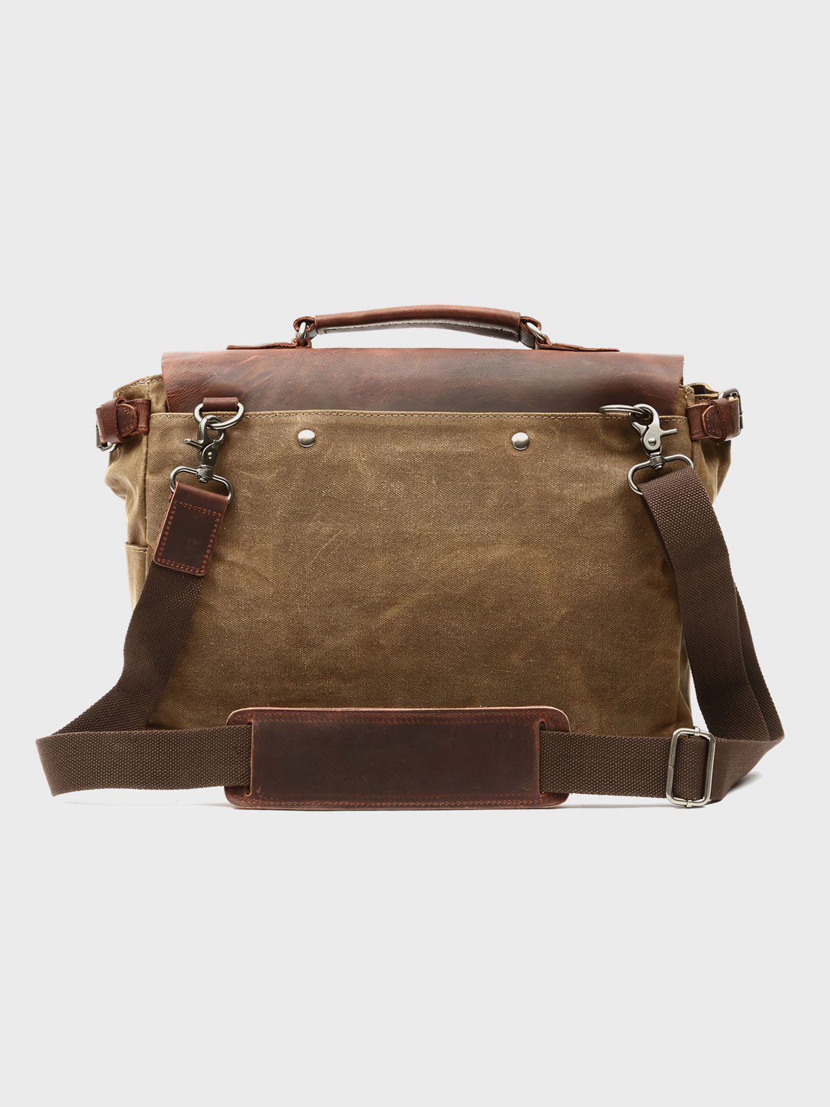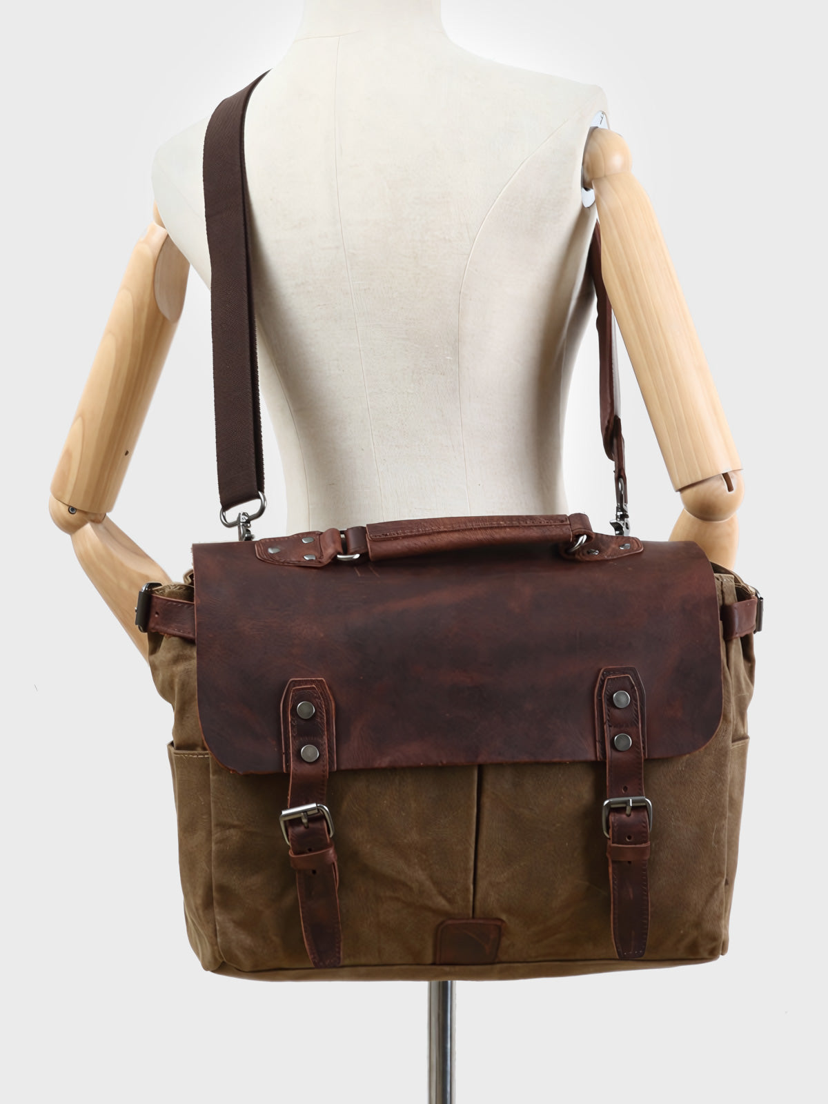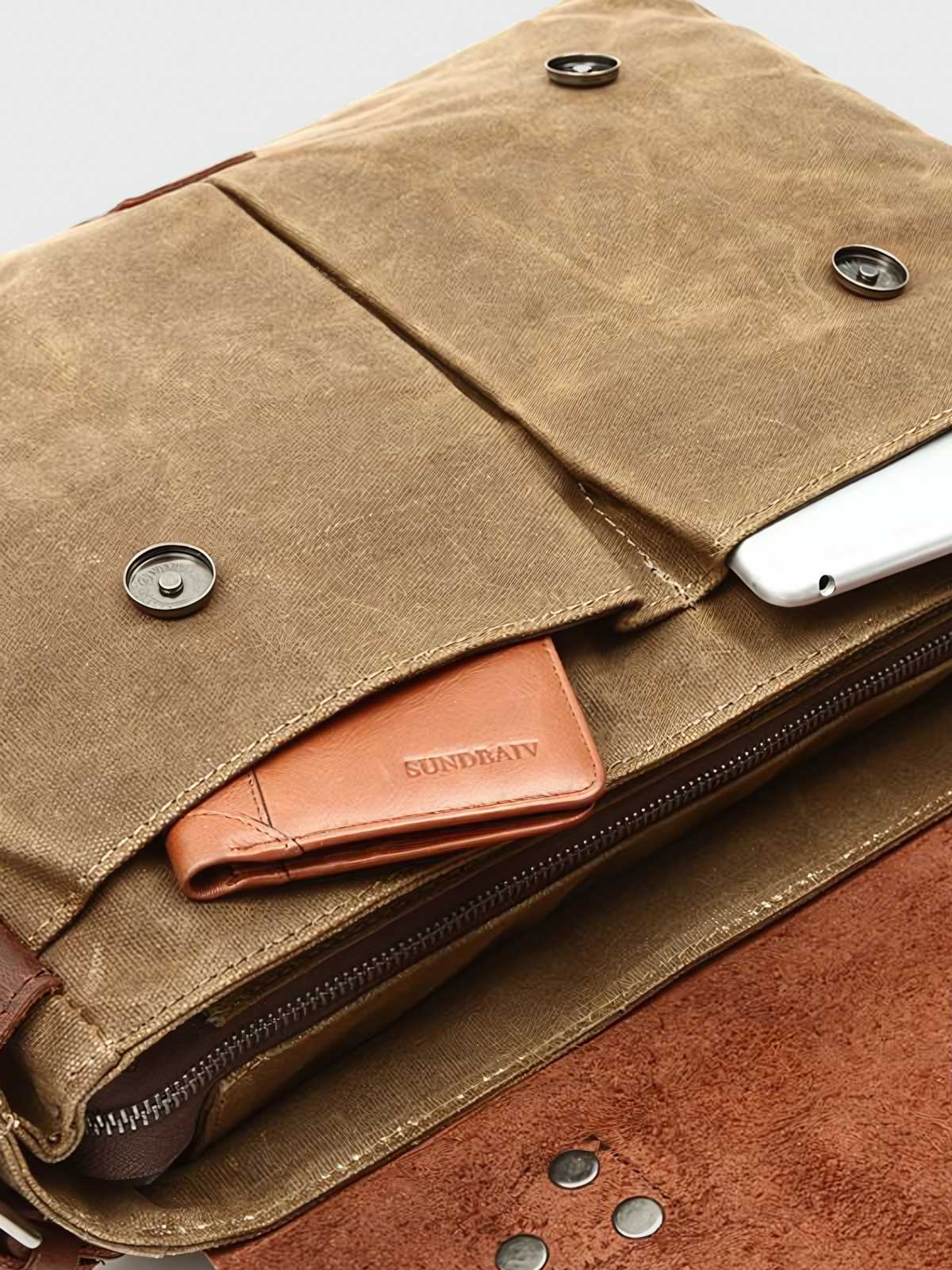 耐久性のあるキャンバス生地と牛革、真鍮の金具が、クラシカルで高級感ある外観を演出します。バッグの各部は精巧に作られ、使い込むほどに味が出る素材を使用しています。ビジネスカジュアルな装いにマッチし、ラップトップや書類などの仕事用アイテムとの組み合わせに適しています。