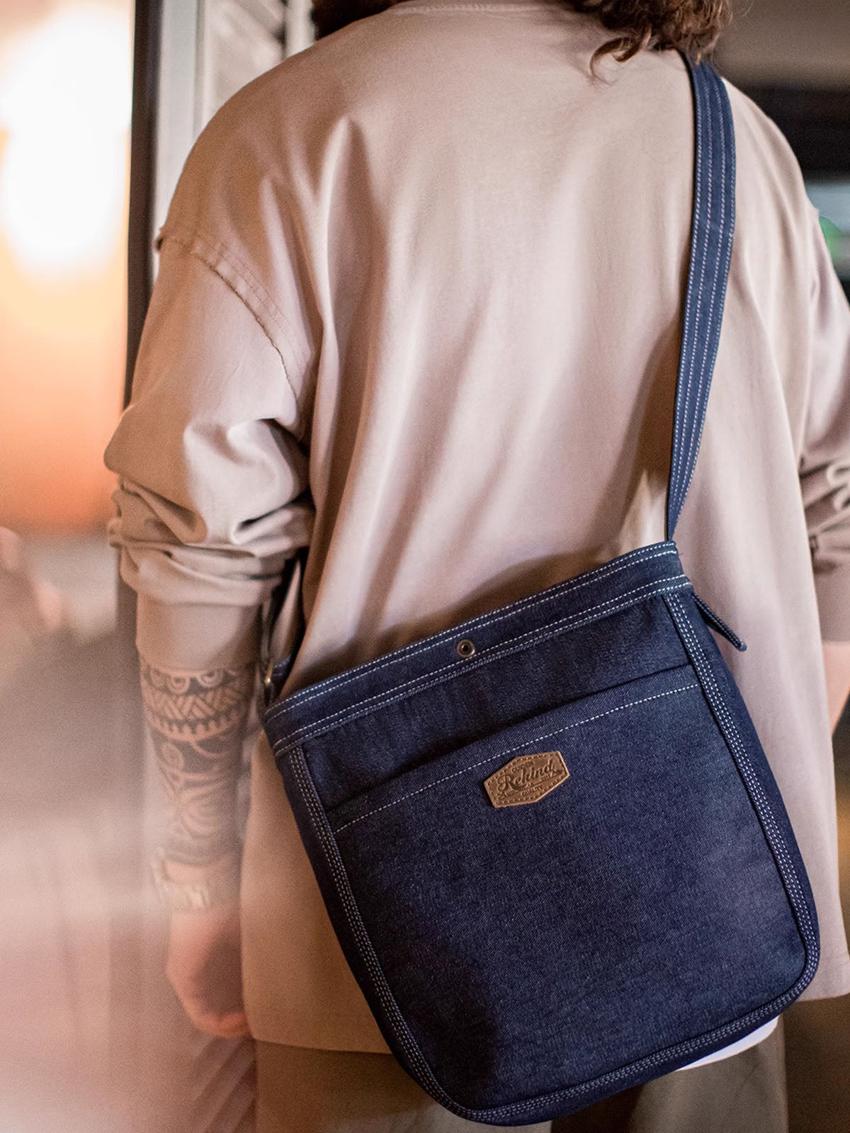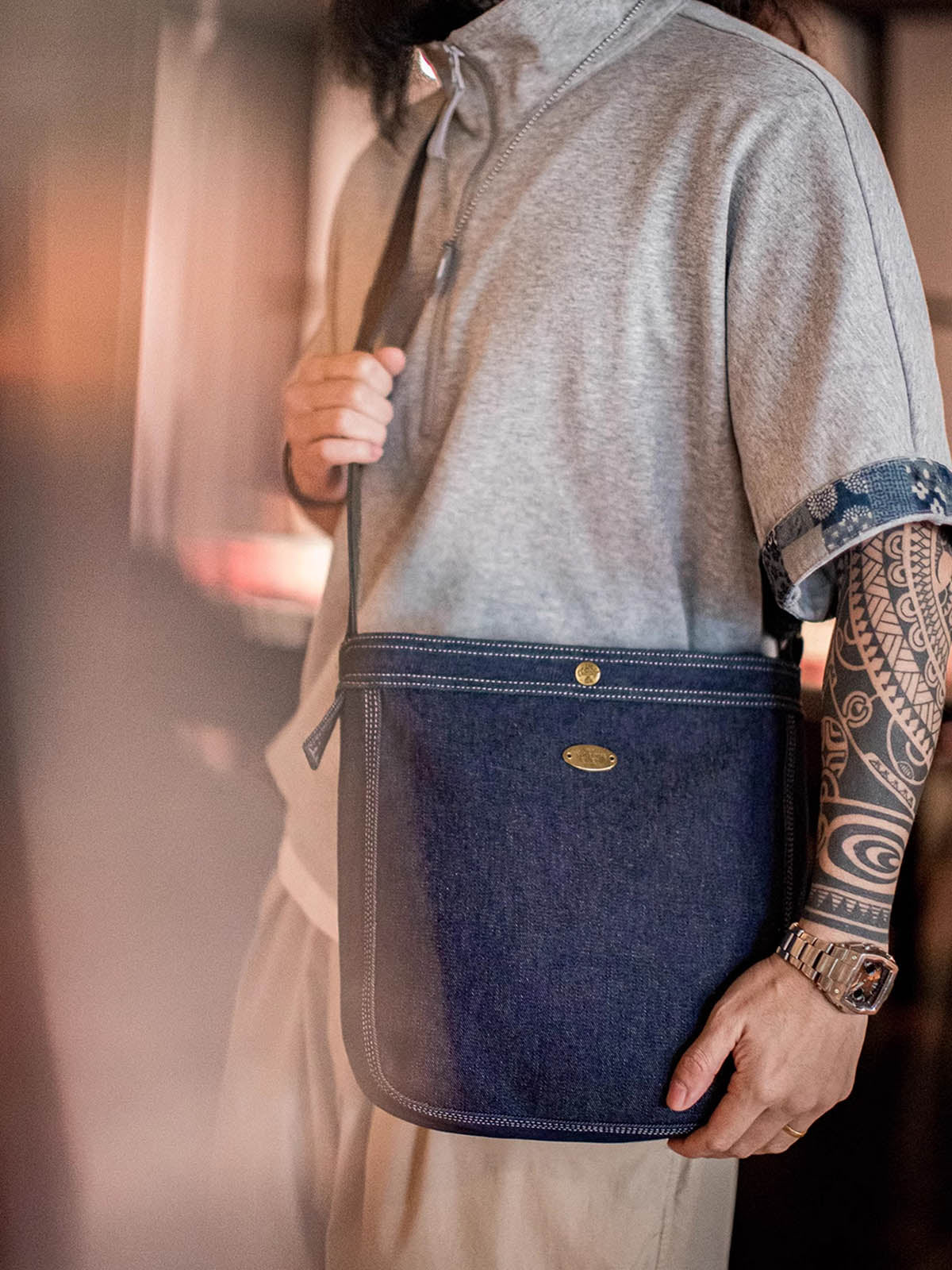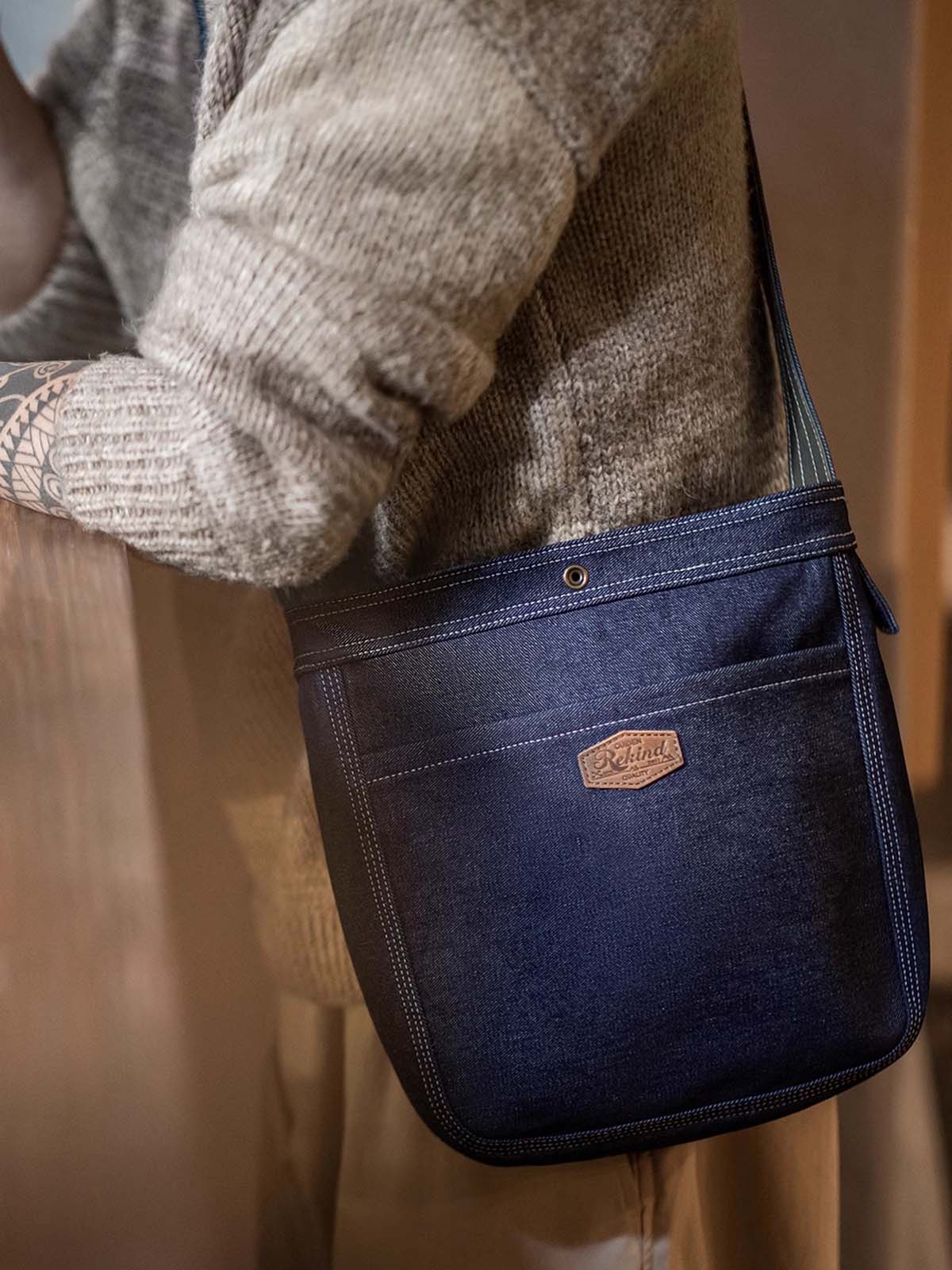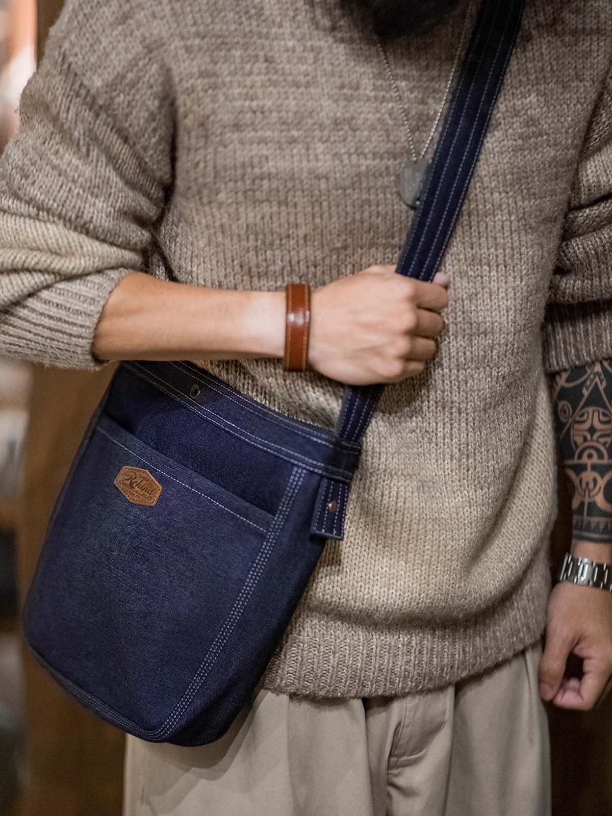 レトロなデザイン: 1940年代の郵便配達用バッグ(ニュースボーイバッグ)をモチーフに製作し、明るめのインディゴデニムや存在感のあるステッチがレトロな雰囲気を強調。