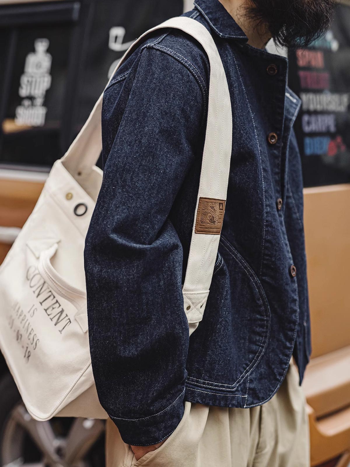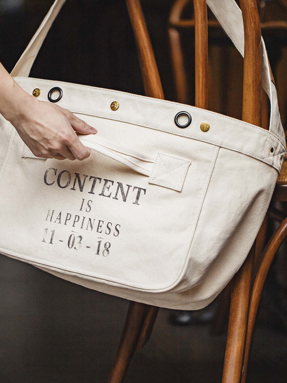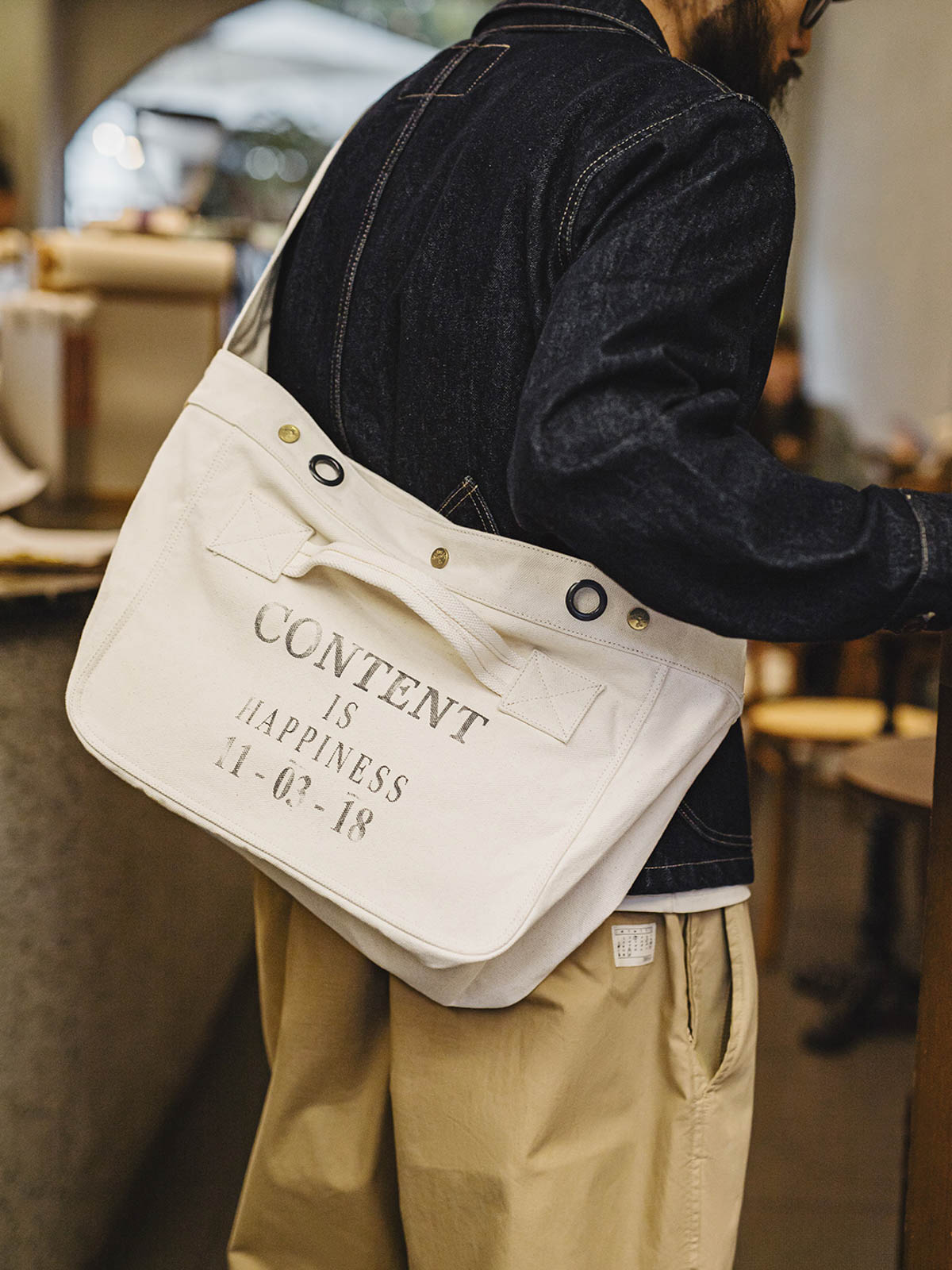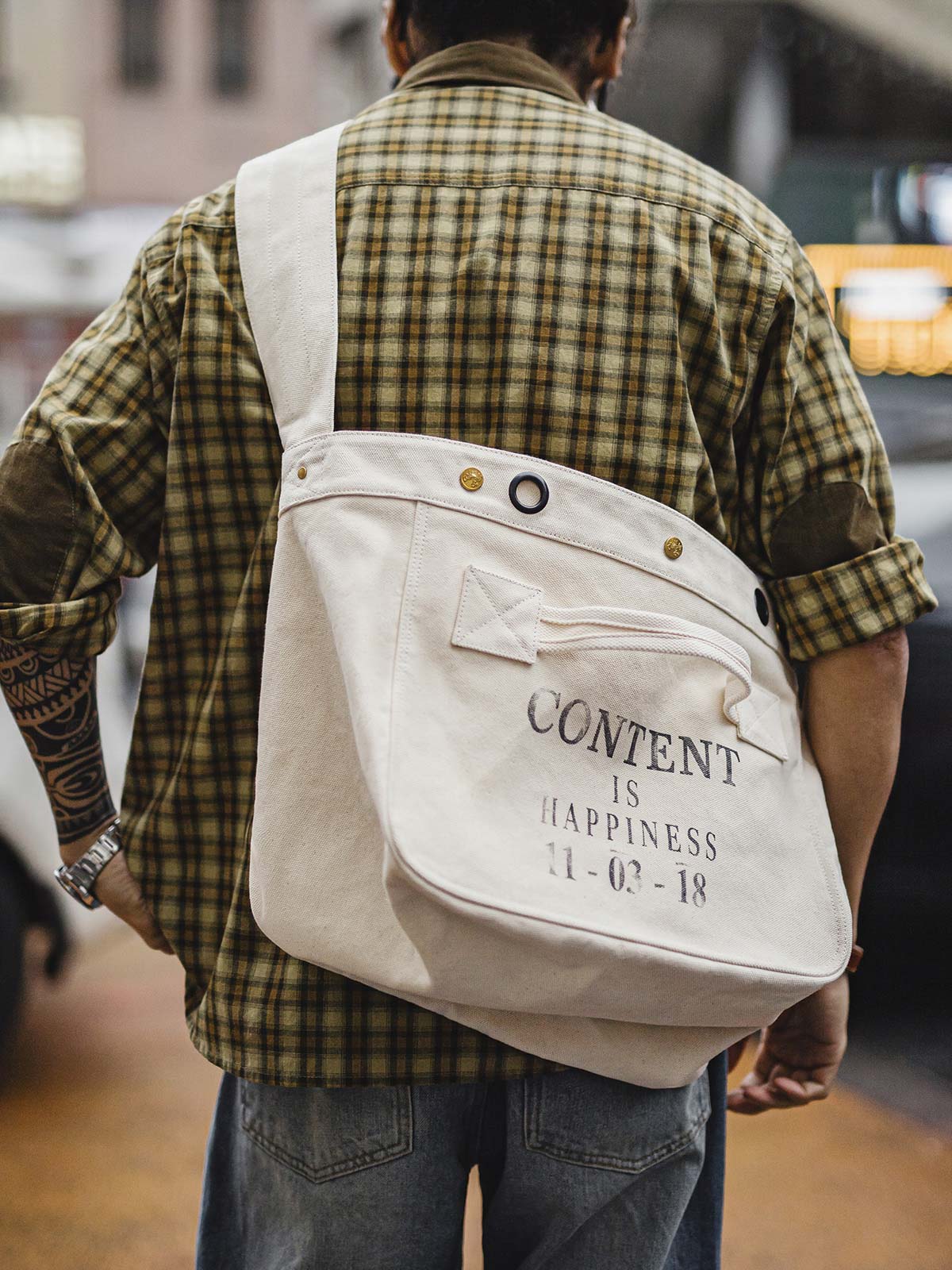 19世紀末のニュースボーイスタイルから着想を得たクラシックなフラップレスのシルエットに、モーターサイクル要素を加えたデザインが特徴です。未染色のコットンキャンバスを採用し、コットンシードや殻が残るナチュラルな風合いを活かしながら、ヴィンテージ加工のプリントを施すことで視覚的インパクトを高めました。金属スナップボタンやハトメ入りベルトを配したディテールが、アイテムの実用性とDIYアレンジの楽しさを両立。大容量のメインコンパートメントは、書籍やiPad、ミラーレスカメラなどの必需品をしっかり収納でき、内側の仕切りポケットが整理整頓をサポートします。肩紐は幅広でクッション性があり、負荷を軽減。さらに、アンティーク調のブロンズ金具やレザーパッチを配し、耐久性とレトロな魅力を両立させています。硬めのキャンバス生地がフォルムをキープするため、通勤からカジュアルな外出まで、実用性とヴィンテージバイクスタイルを同時に演出できるアイテムです。