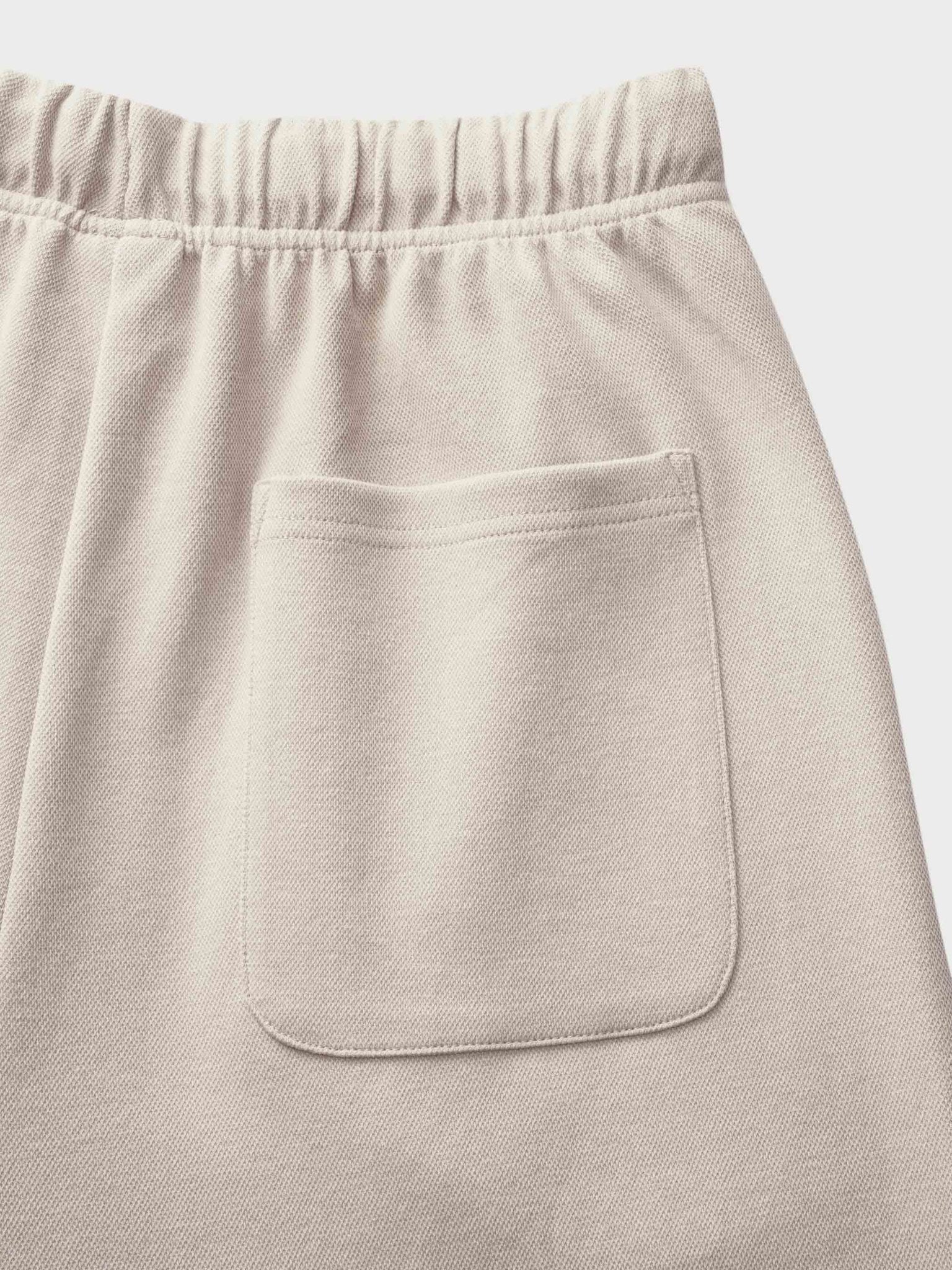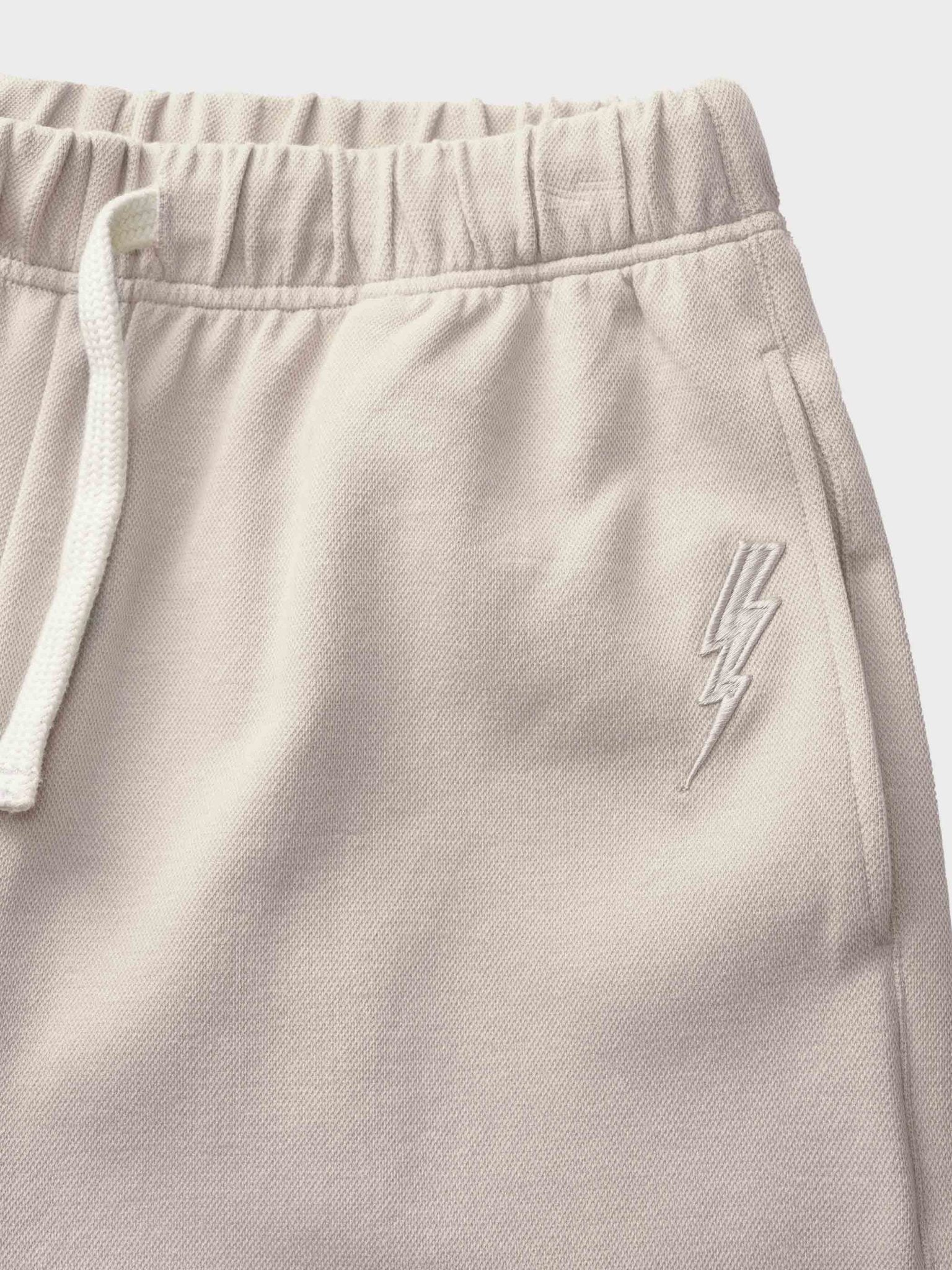短パンのウエスト部分には、同系色の小さなウェーブ編みのベルトを採用し、全体的なファッション感を高めています。雷柄の刺繍は、短パンの個性と特徴を際立たせます