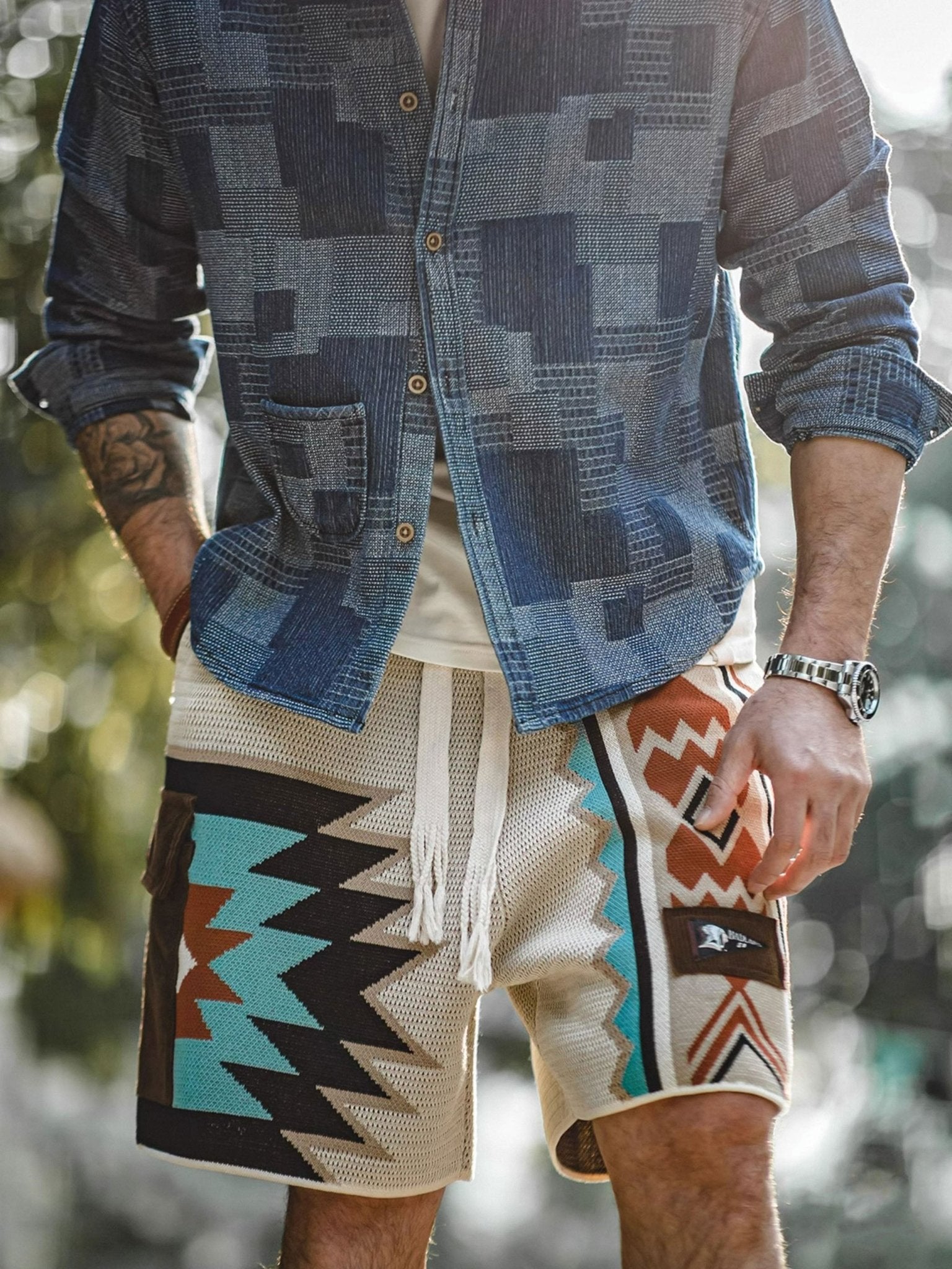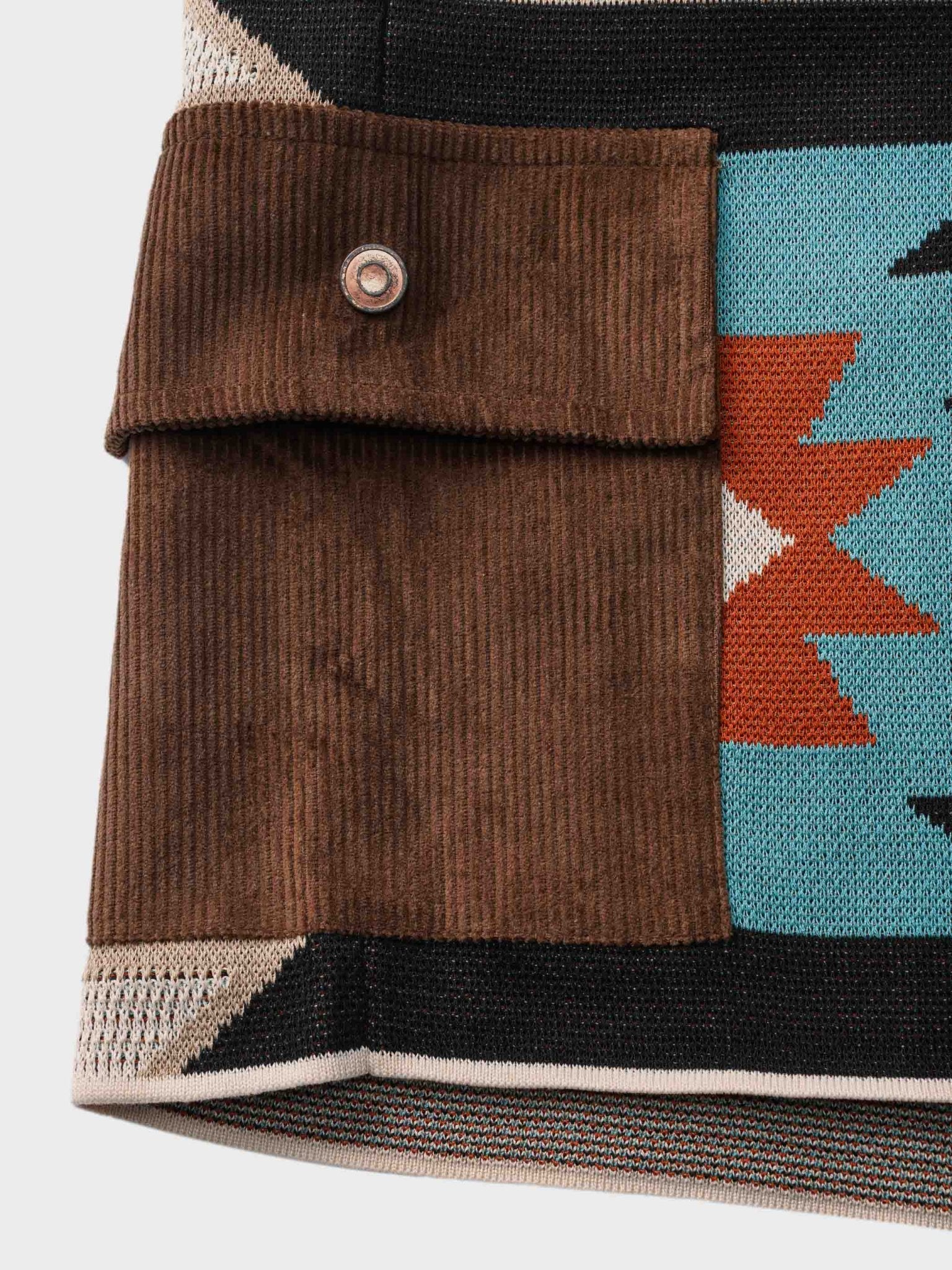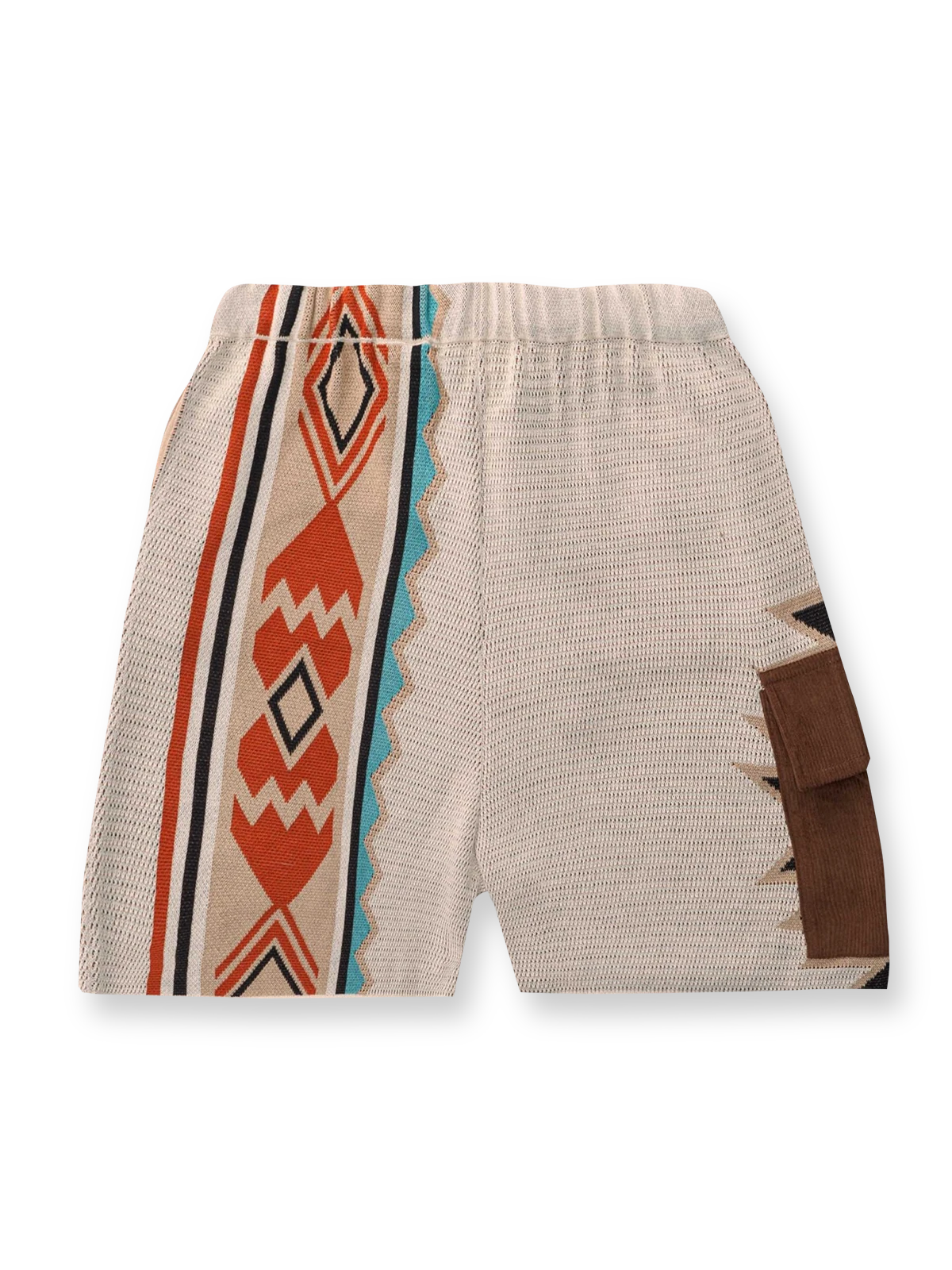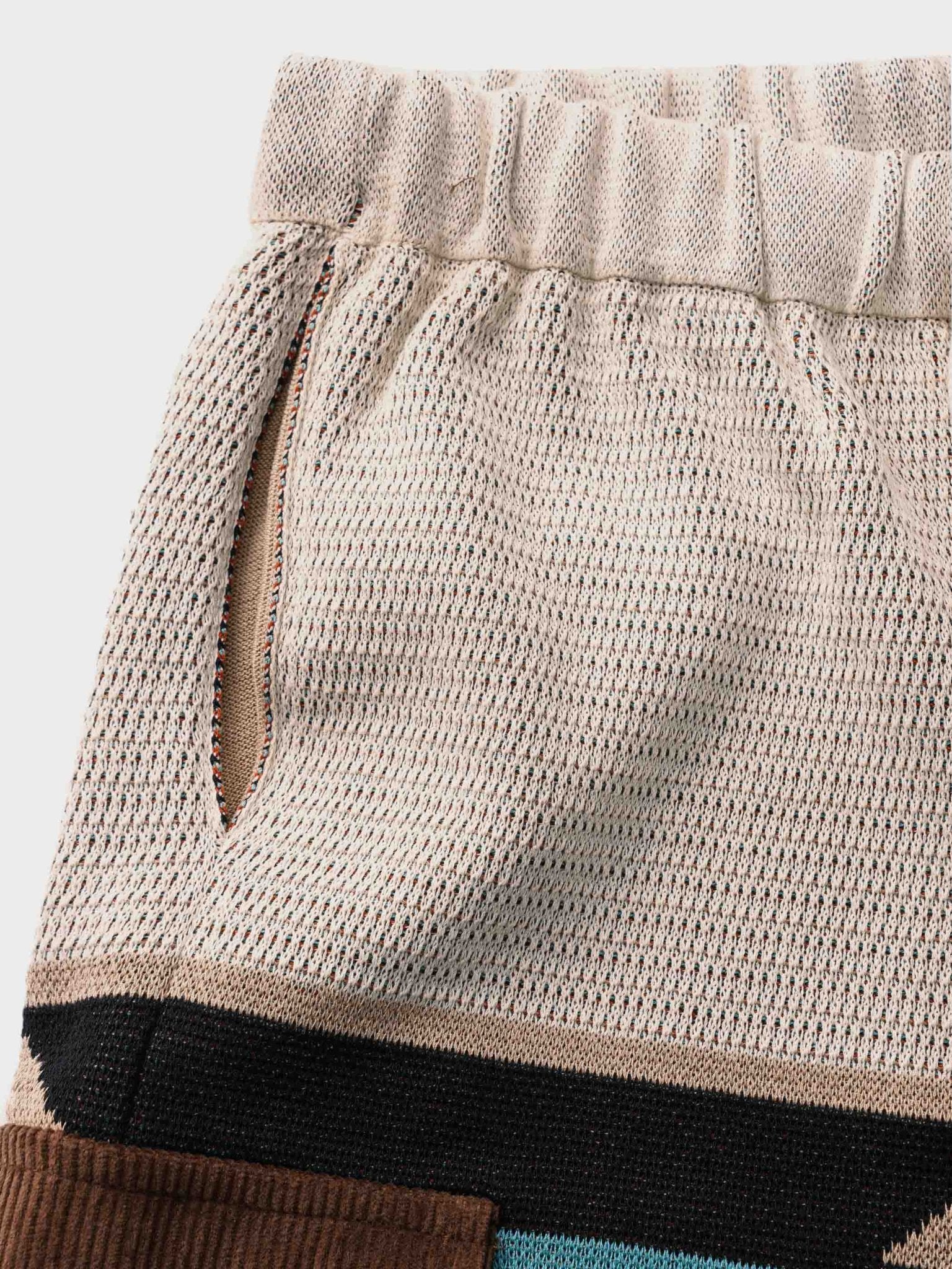 このニットのショートパンツは、複数のコントラストカラーを組み合わせ、活気あるファッションスタイルを演出します。