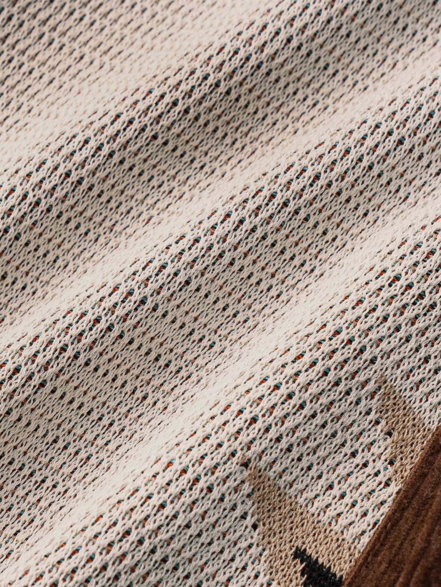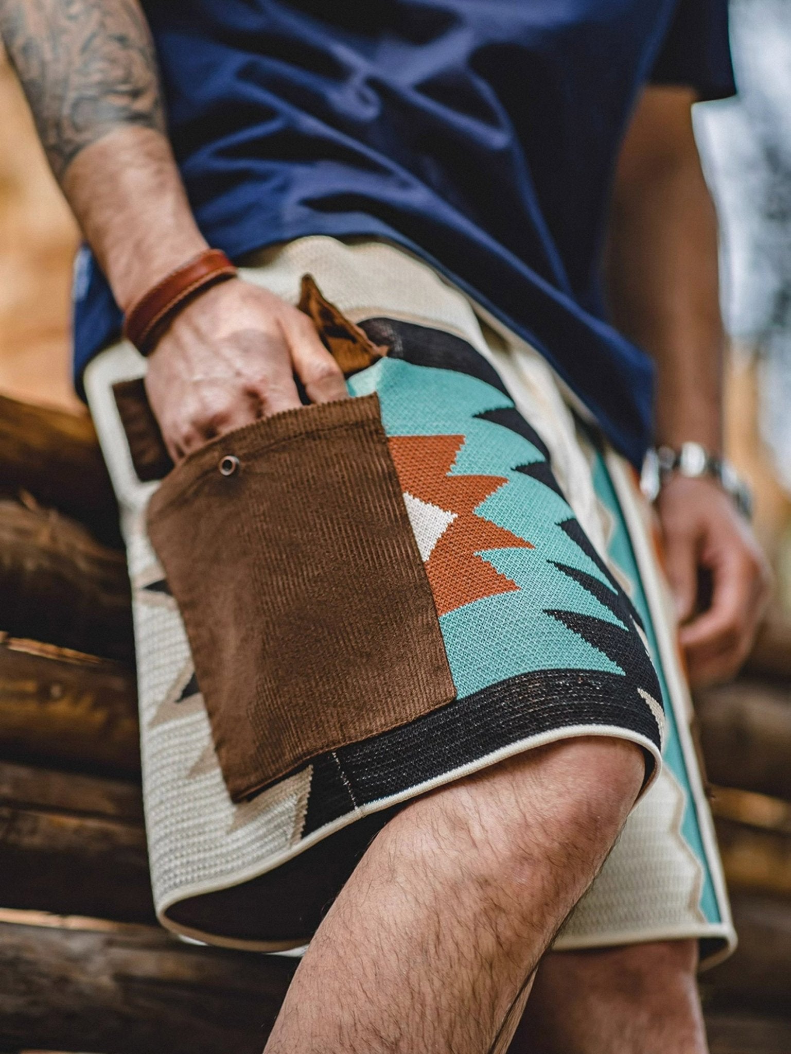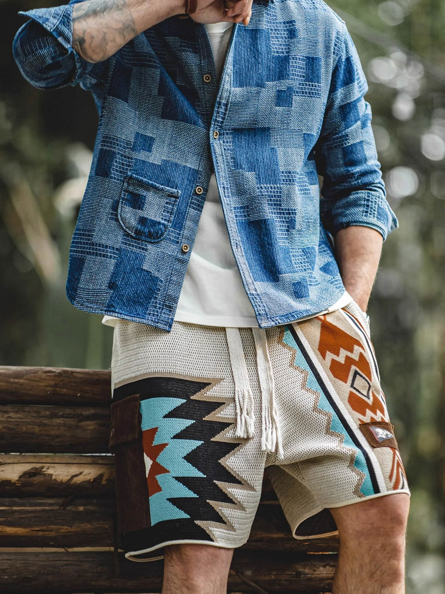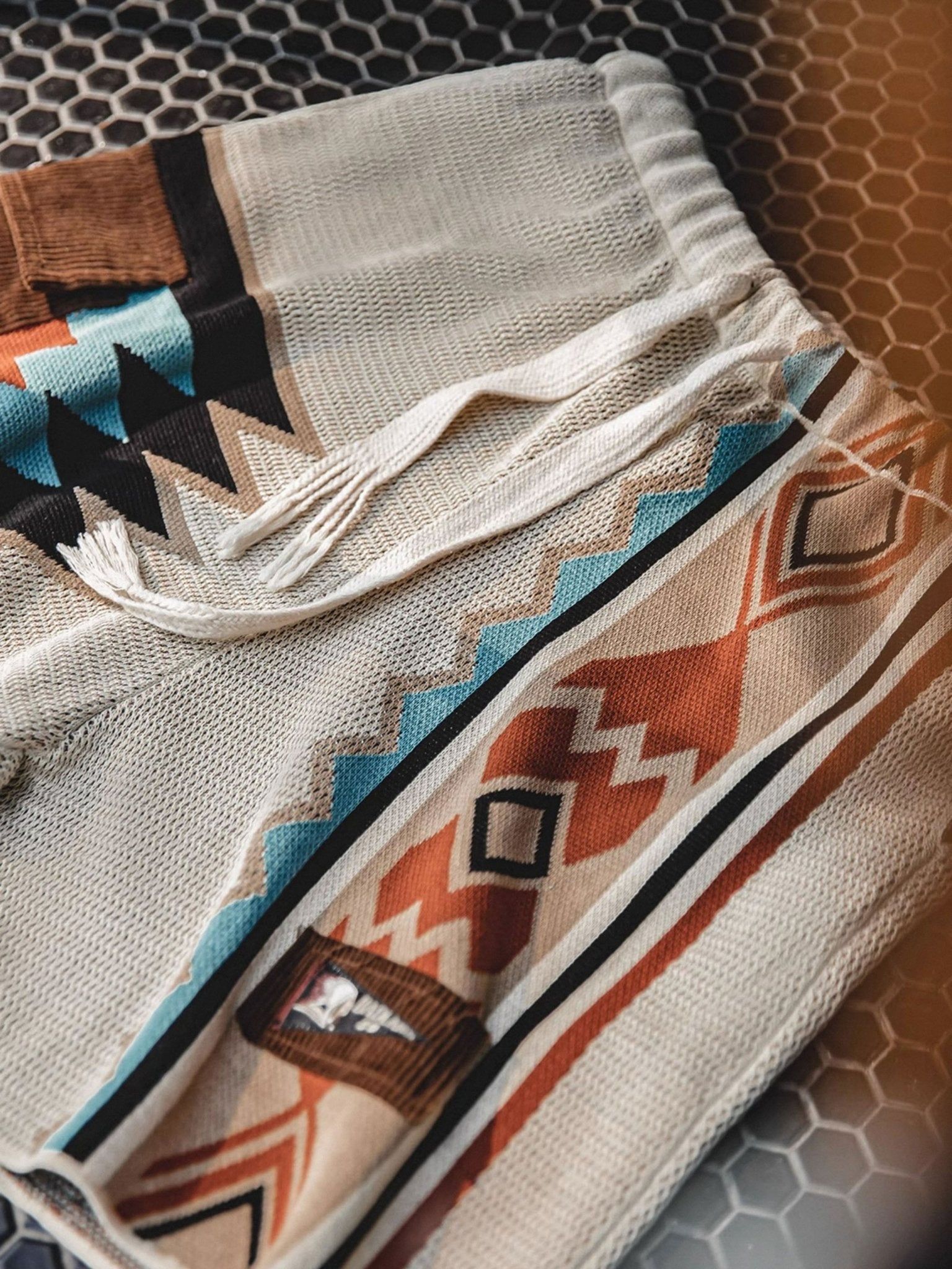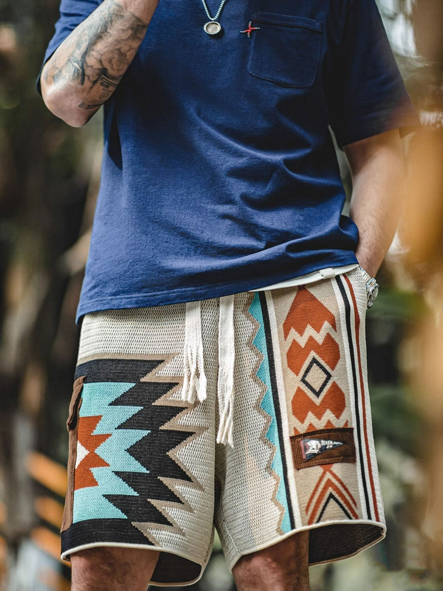 このニットのショートパンツは、複数のコントラストカラーを組み合わせ、活気あるファッションスタイルを演出します。