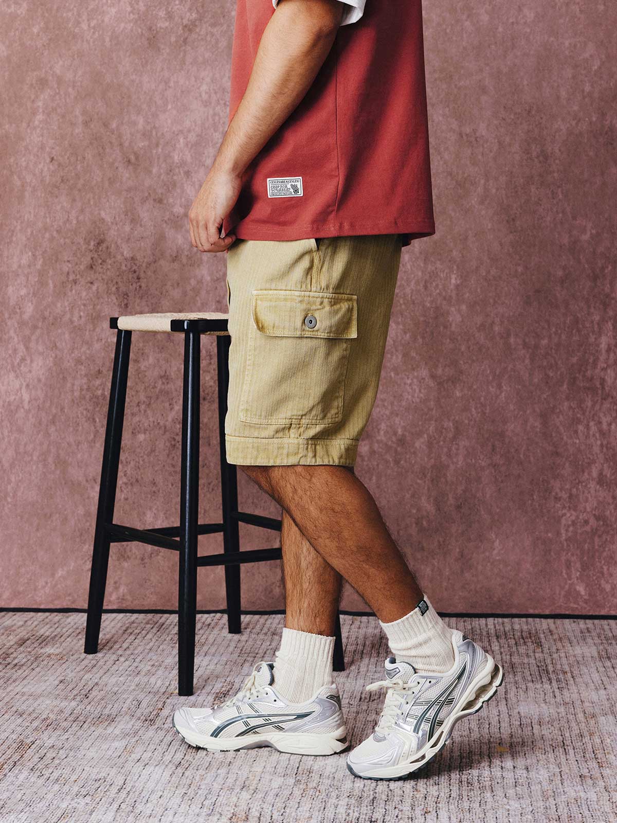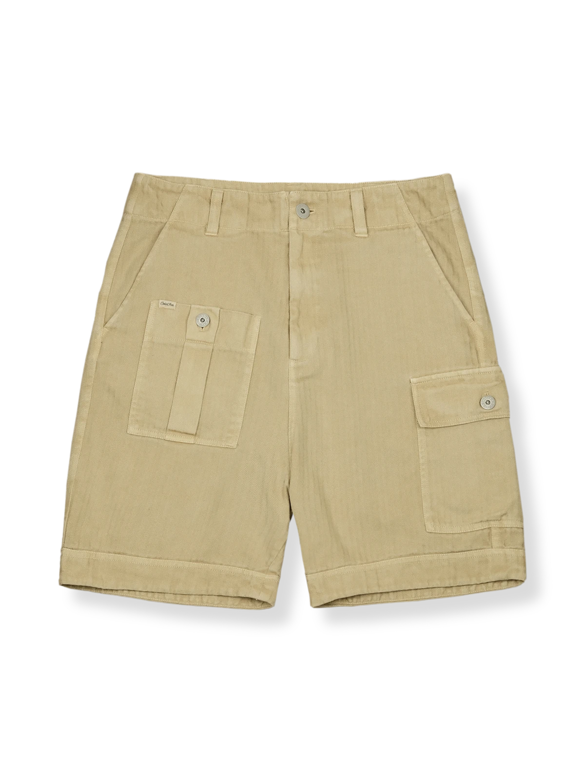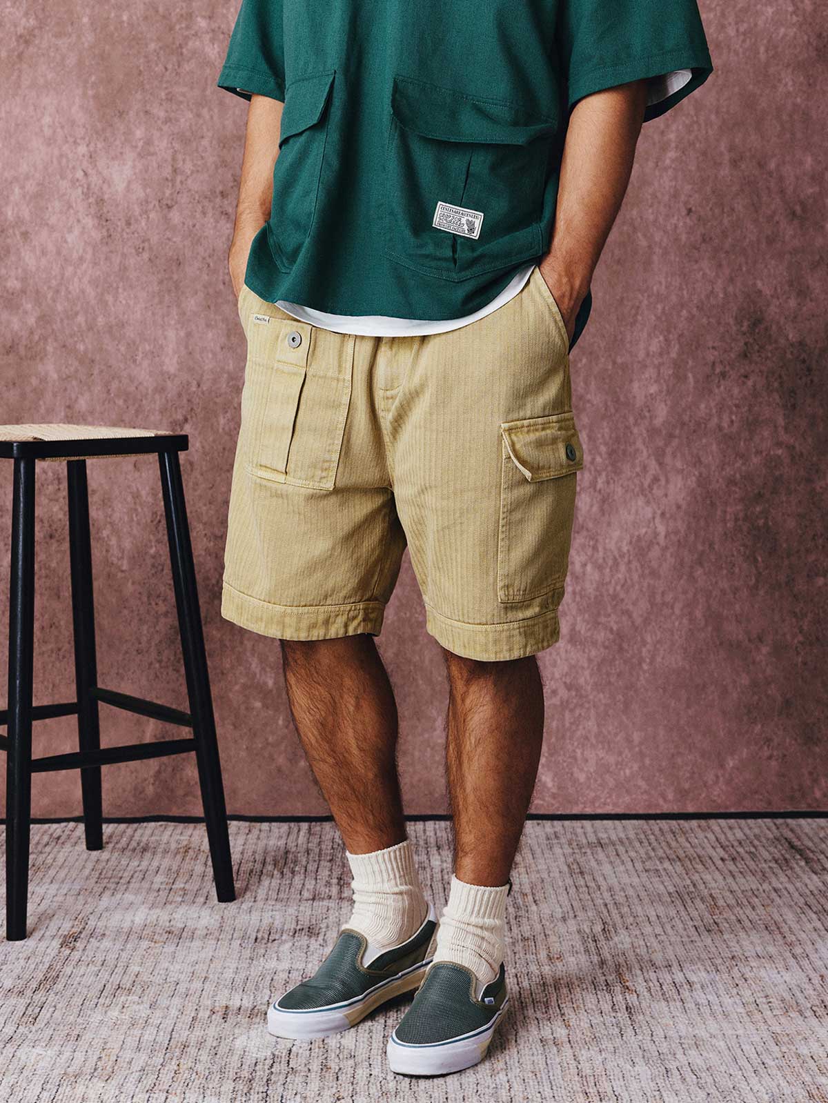 このショートパンツはクラシックなU.K. Army Pantsからインスピレーションを得て、ミリタリー要素と現代のカジュアルワークウェアスタイルを融合しています。スペイン製の活性染料を使用したガーメントダイ技術により、薄れた白のヴィンテージ加工を施し、独特のレトロ感と時代の魅力を表現しています。