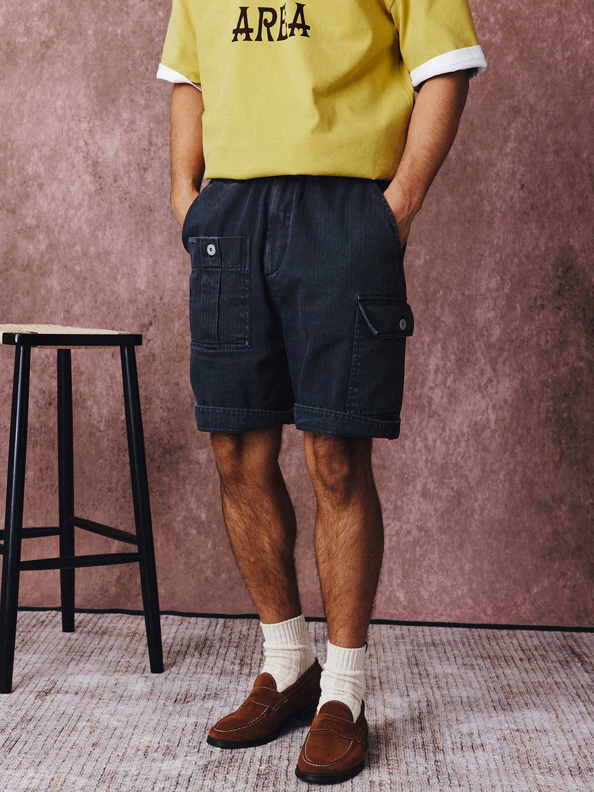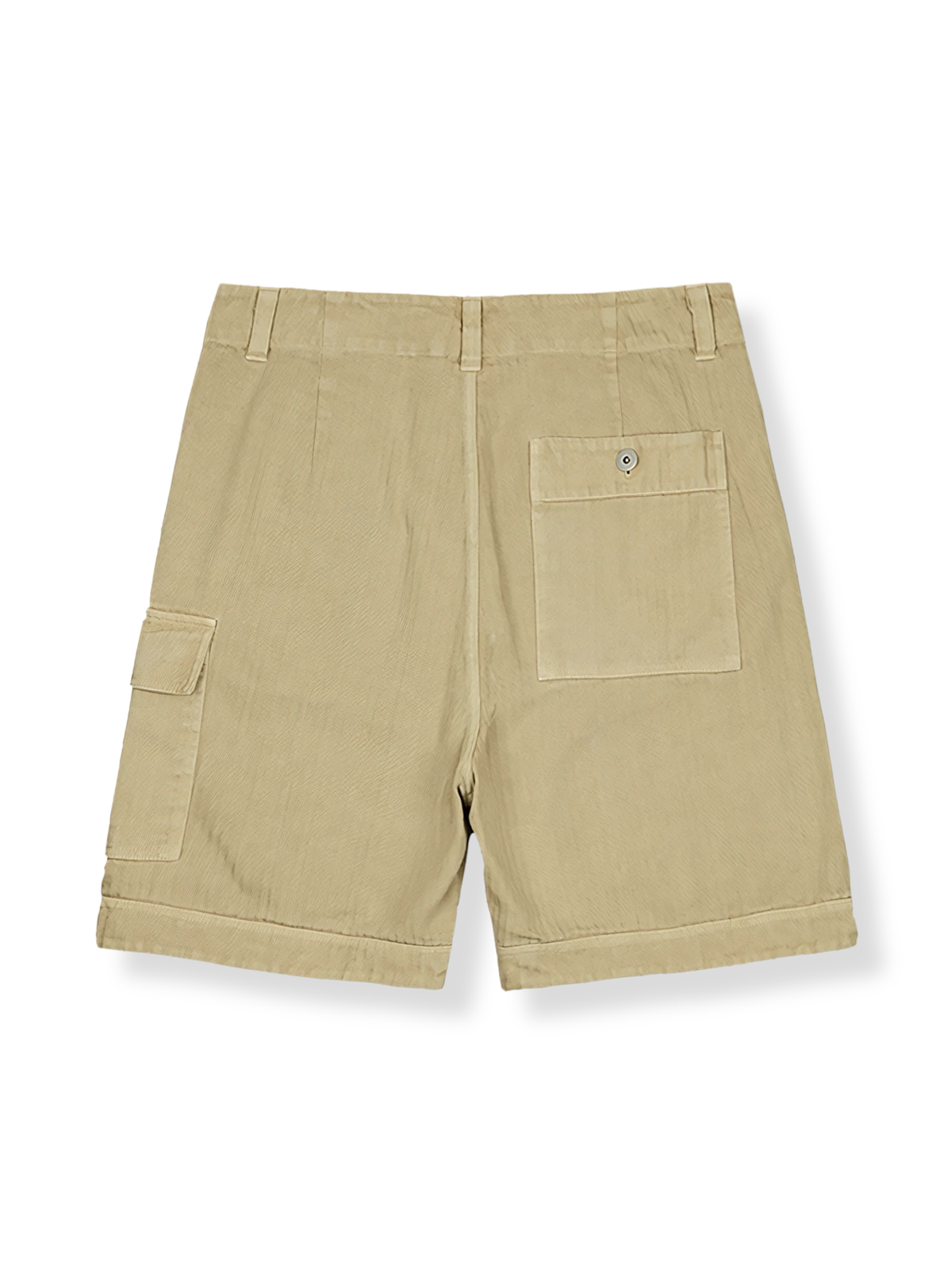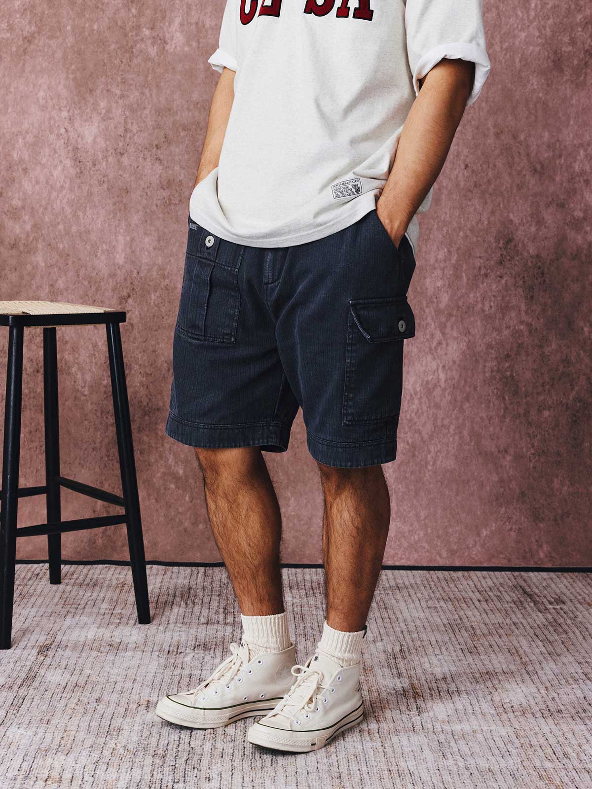 このショートパンツはクラシックなU.K. Army Pantsからインスピレーションを得て、ミリタリー要素と現代のカジュアルワークウェアスタイルを融合しています。スペイン製の活性染料を使用したガーメントダイ技術により、薄れた白のヴィンテージ加工を施し、独特のレトロ感と時代の魅力を表現しています。