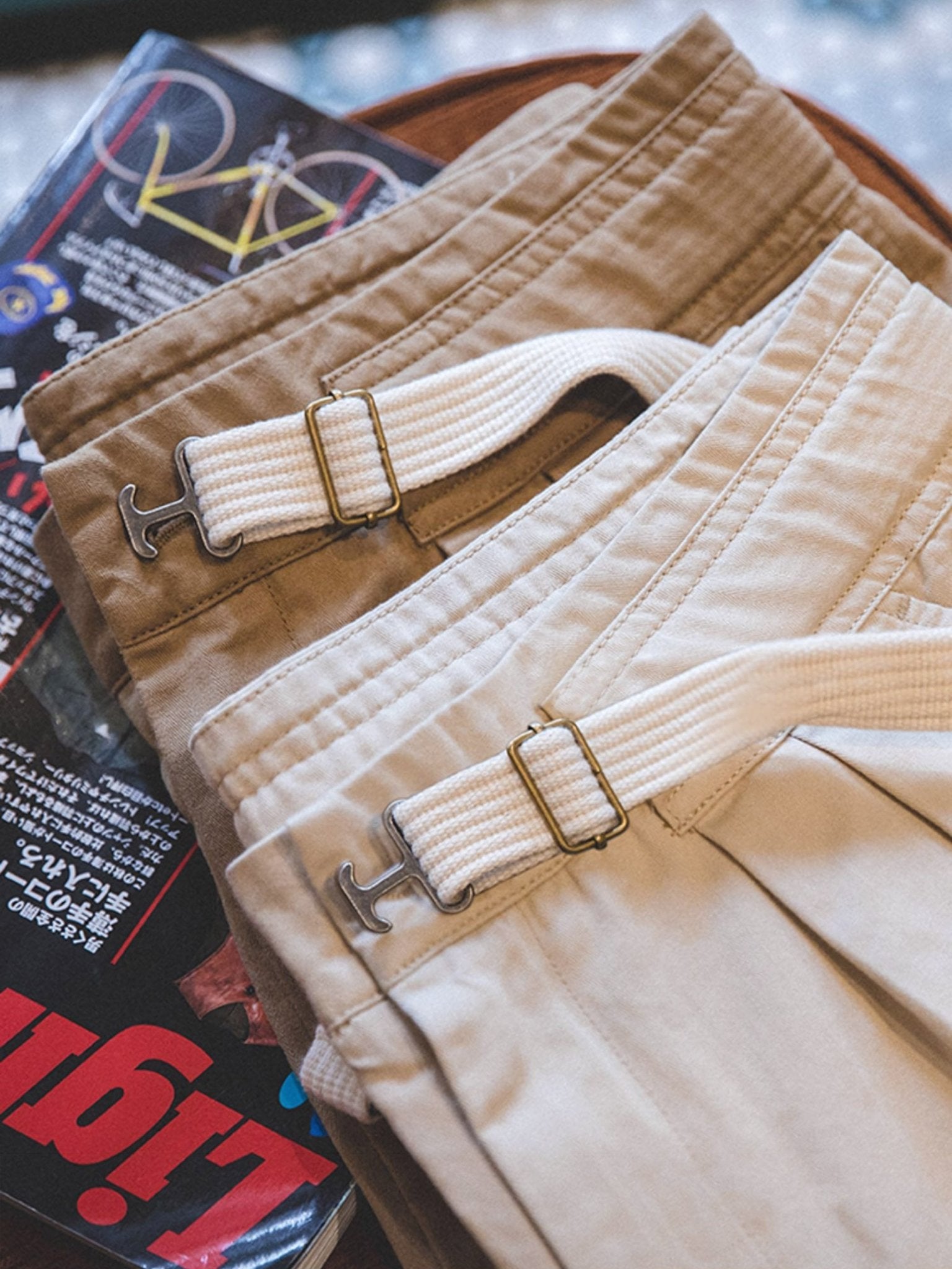 ウエスト部分には非常に使い勝手の良いコットンベルトを装備し、サイズの調整や着脱も快適に行えます。フロント部分に見られる錨型引掛け金具「ビット」と呼ばれるデザインは大胆で、長さの調整は背面で行える方式が主流です。シンプルで合わせやすく、程よいアクセントになっています。