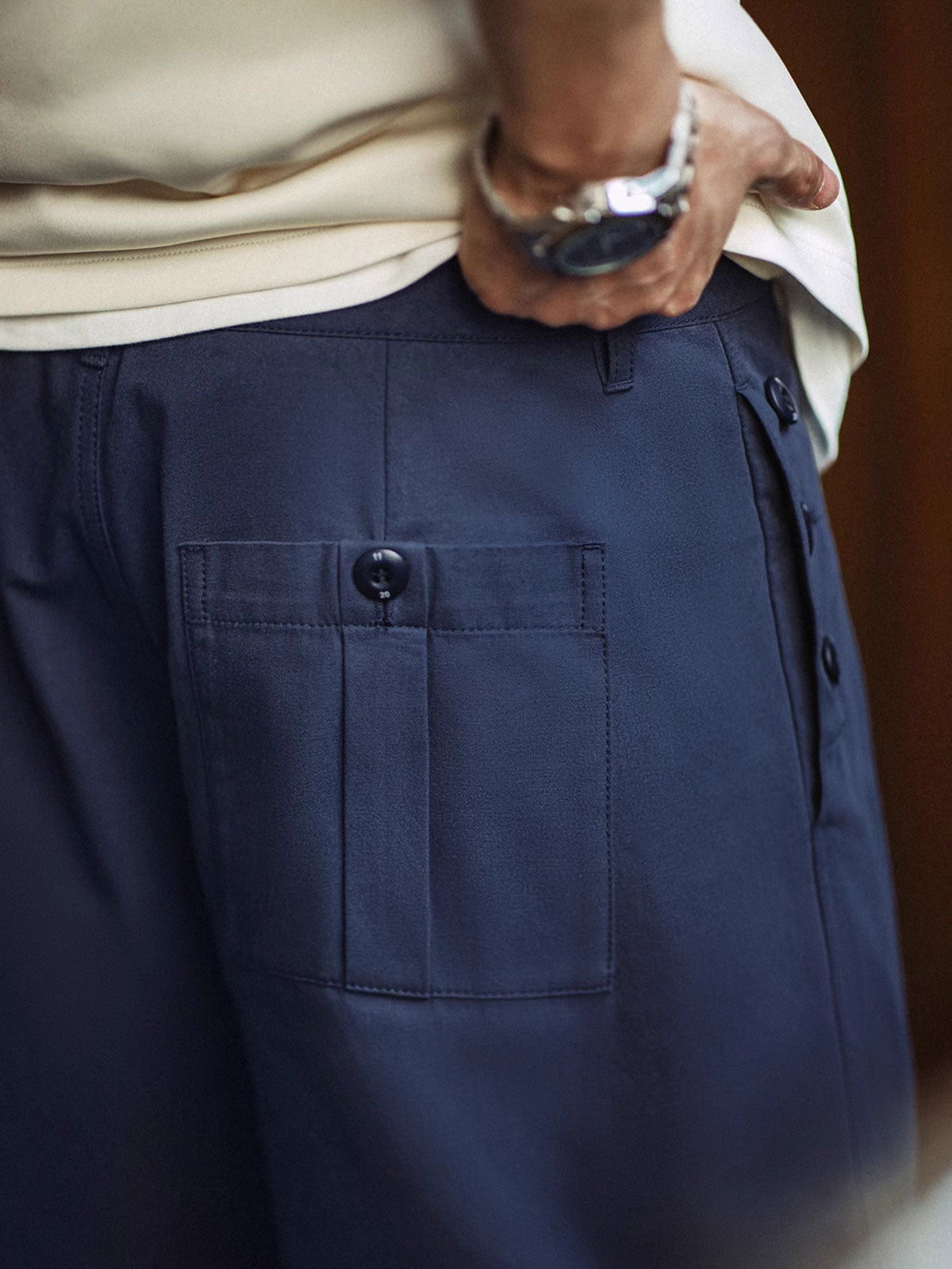 このショートパンツはミリタリーパンツをインスパイアし、クラシックなダブルプリーツデザインを取り入れ、现代のファッション要素を融合させたシンプルでタフなスタイルを特徴としています。97.4%コットンと2.6%レーヨンの混紡素材を使用しており、柔らかく通気性が良く、夏に最適です。ショーツには3つのポケットと7つのボタンがあり、実用的で美しいです。複数のボタン付きのポケットデザインがワークスタイルのユニークなディテールを追加しています。精巧なアローマークリベット装飾が全体のデザインを引き立てています。カジュアルな外出や日常のコーディネートに最適で、クールなガイの独特な魅力を演出します。