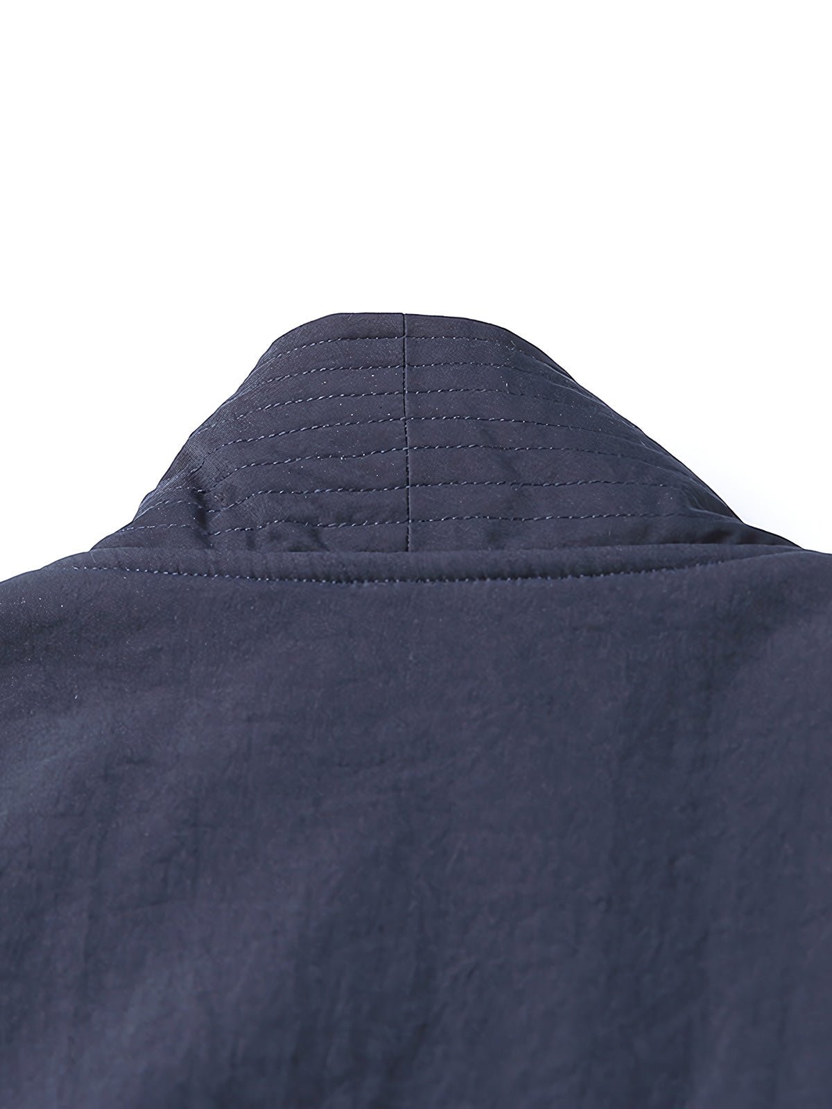 この袢纏ジャケットは、ポリエステルとポリウレタンの混紡素材を使用しており、耐久性と適度な伸縮性を兼ね備え、動きやすく快適な着心地を実現しています。ワークウェア風のカラーブロックデザインが、視覚的に魅力的な層次感を生み出し、Vネックスタイルはヴィンテージ感とモダンな要素を組み合わせたデザインです。大きめのポケットが利便性を高め、機能性とデザイン性のバランスが絶妙です。カジュアルな日常着やアウトドアでの着用に適しており、レイヤードスタイルでも単独でも活躍できる万能アイテムです。