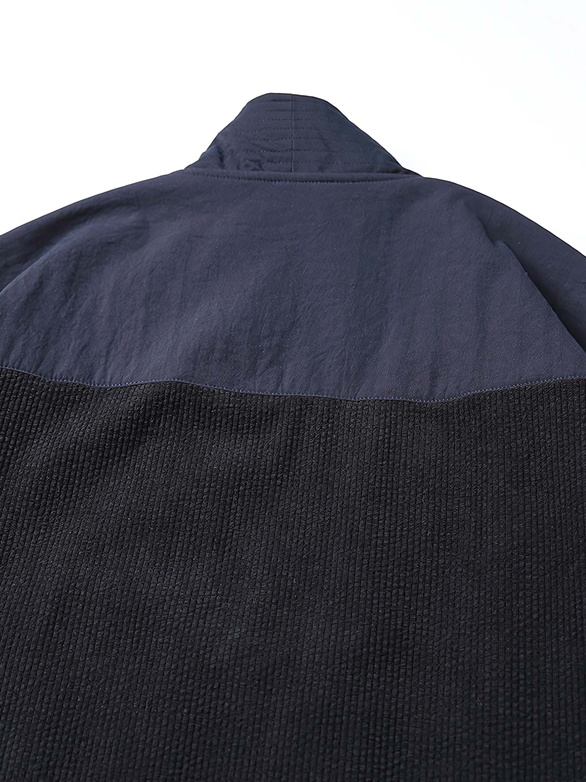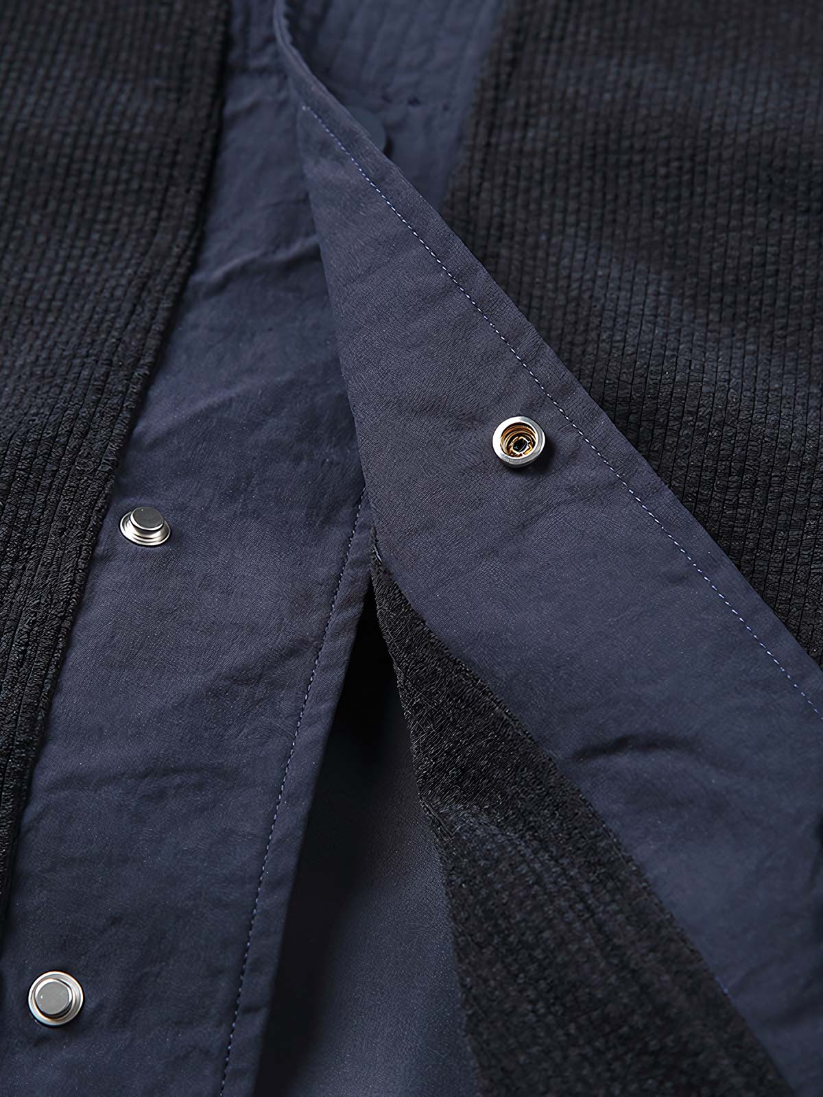 カラーブロックデザインとヴィンテージ風のVネックスタイルが融合した、機能性に優れた袢纏ジャケット。