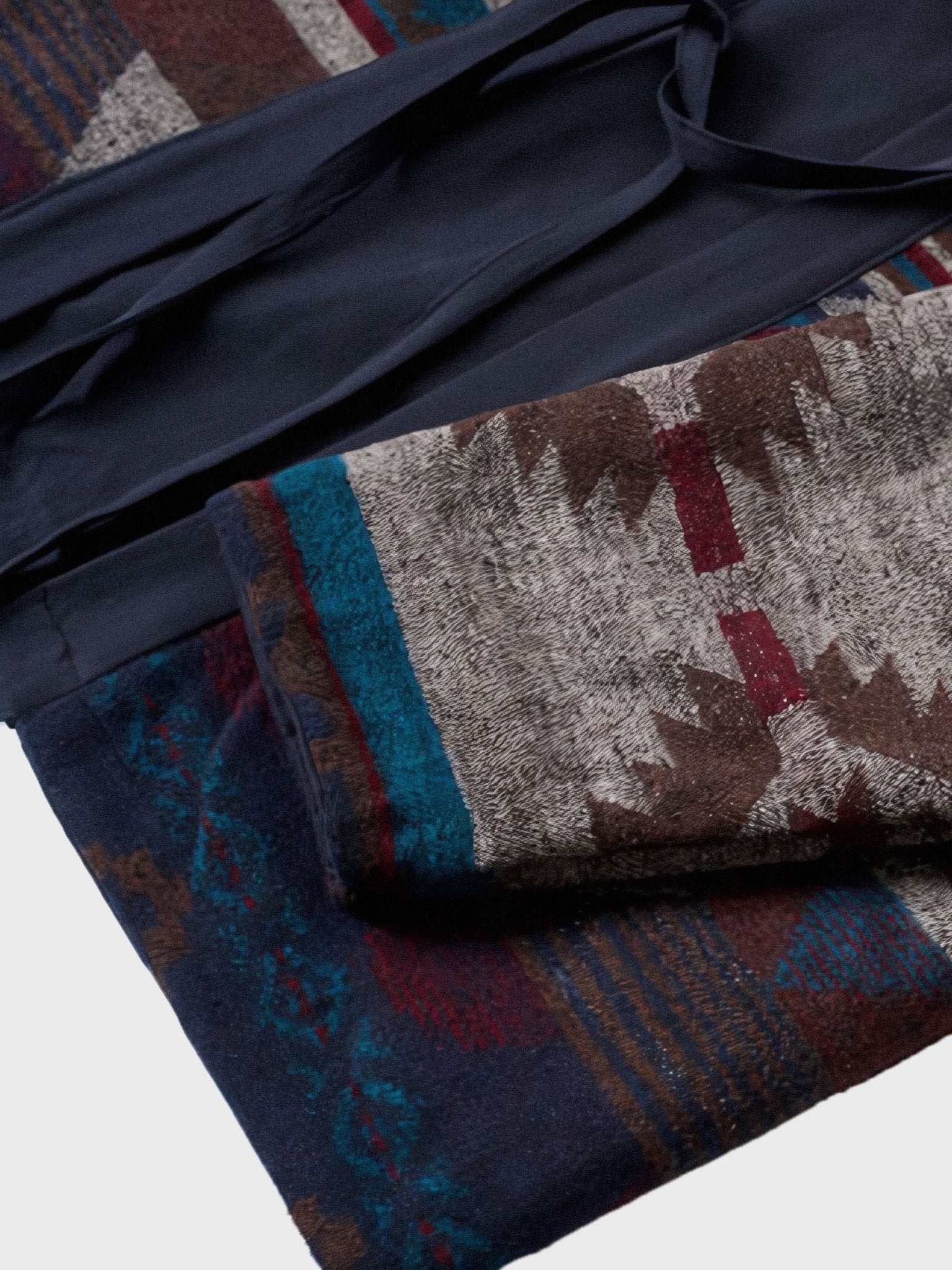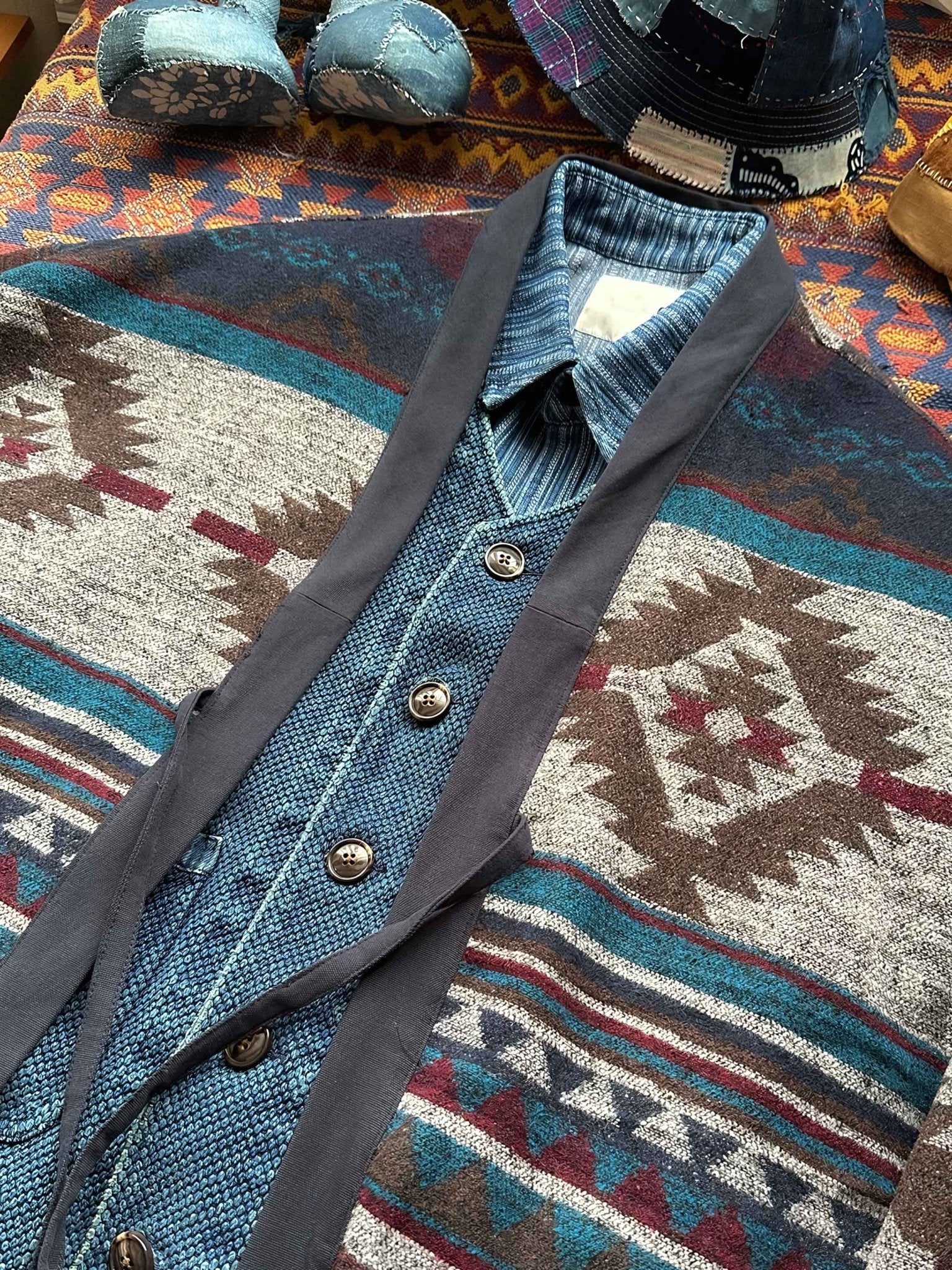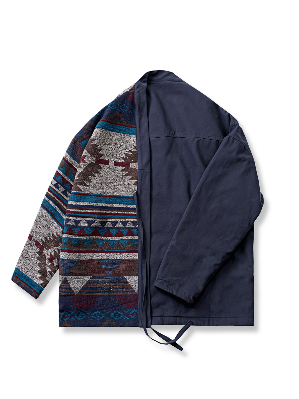 ナバホ織り側は伝統的な技法に基づいており、幾何学的な模様や鮮やかな色彩が特徴です。独自のデザインは目を引き、個性的なスタイルを演出します。ナバホ織りのデザインには文化的な意味や物語が込められていることもあり、着る人に豊かな魅力を与えます。無地側はシンプルなデザインであり、ネイビーの生地が使用されています。無地のデザインはクラシックでありながらも洗練された印象を与え、シンプルながらも重厚感を持っています。