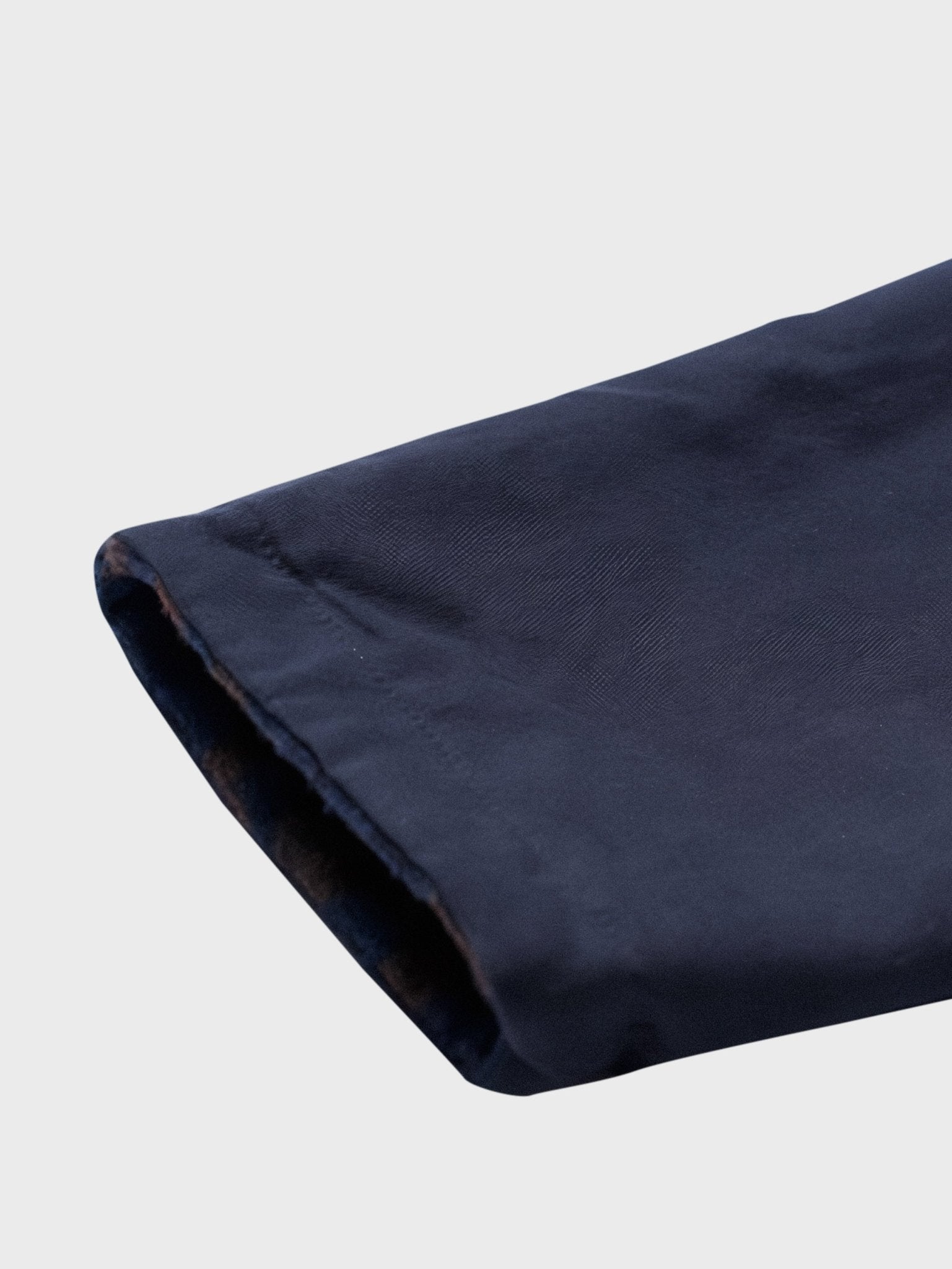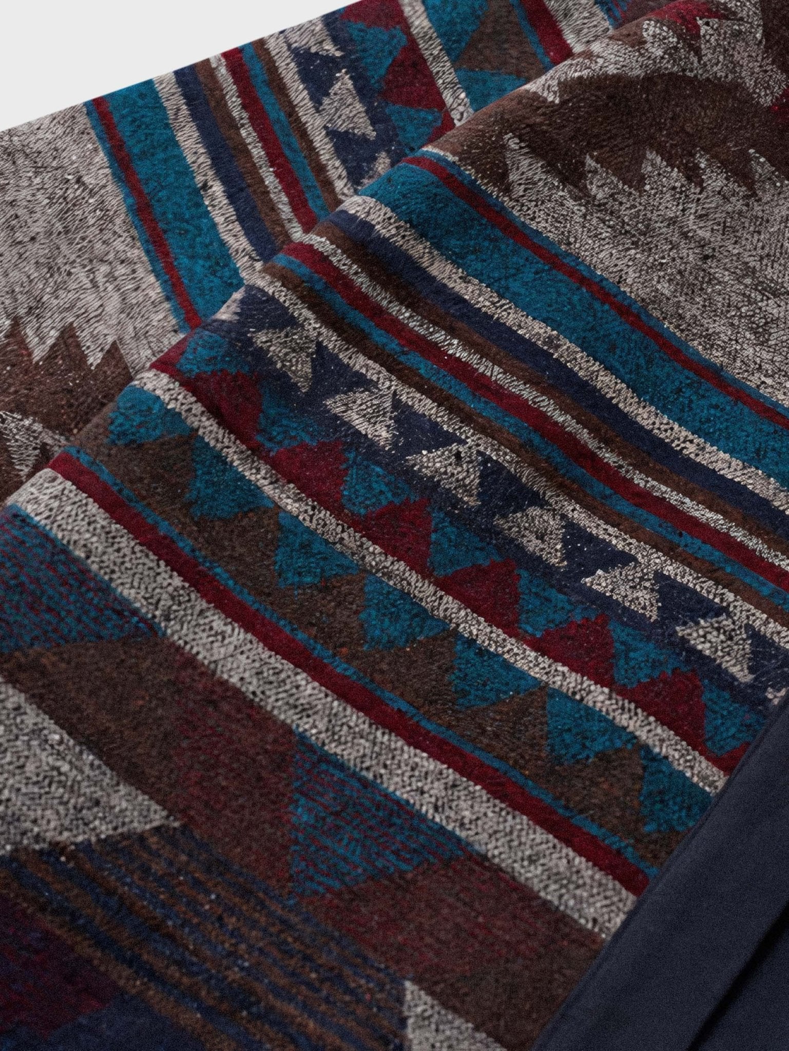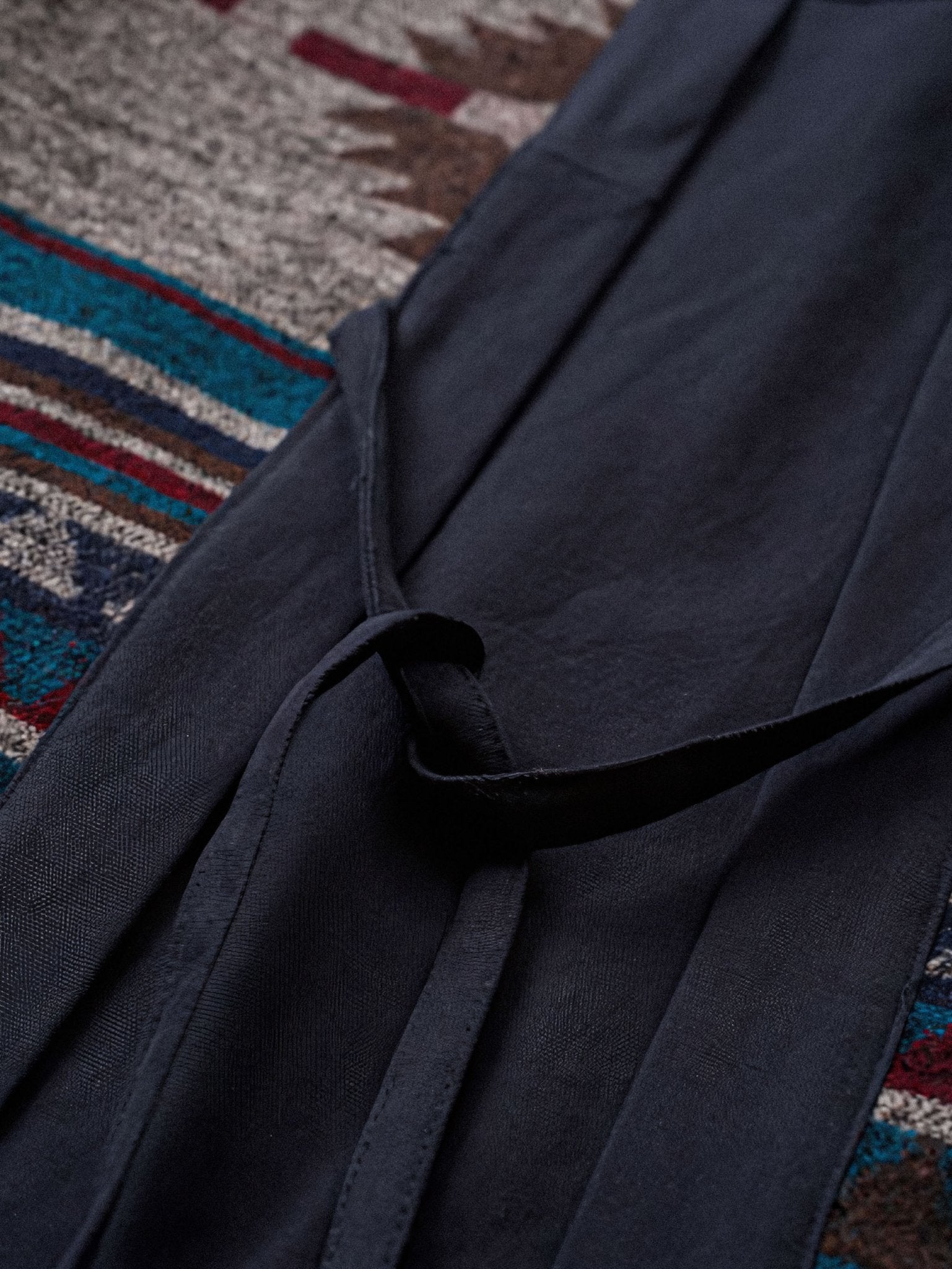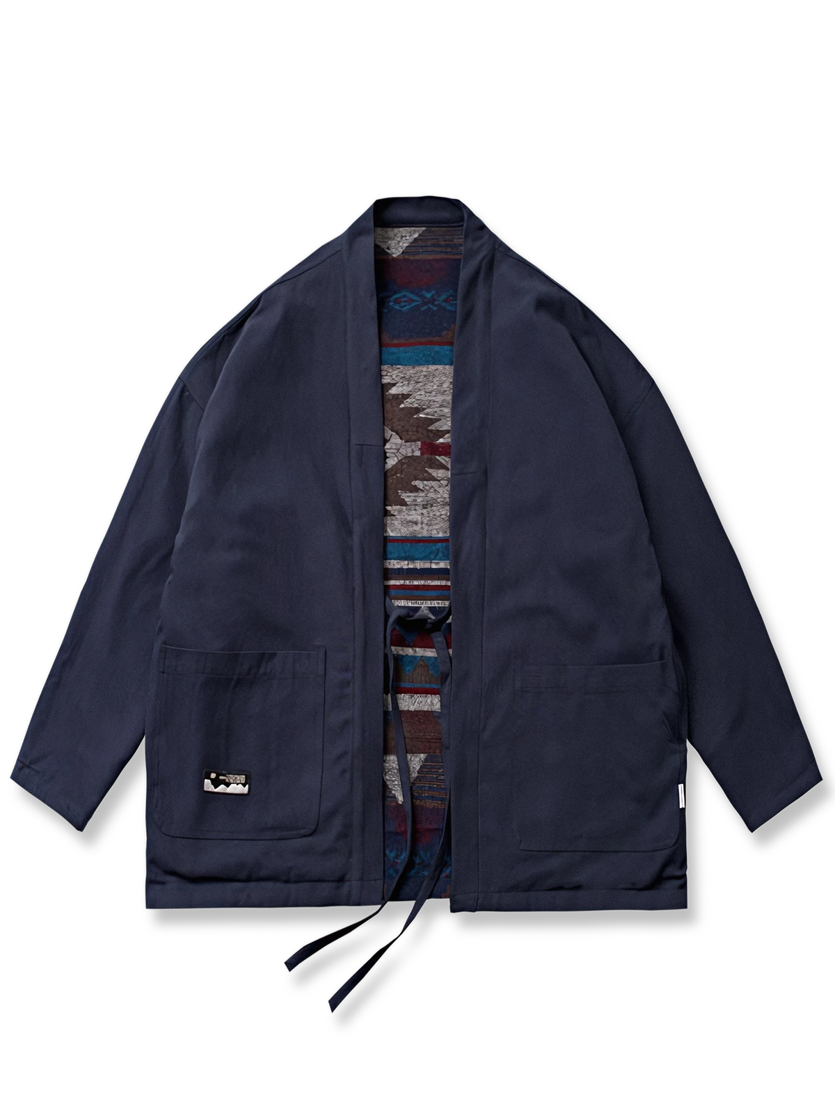 ナバホ織り側は伝統的な技法に基づいており、幾何学的な模様や鮮やかな色彩が特徴です。独自のデザインは目を引き、個性的なスタイルを演出します。ナバホ織りのデザインには文化的な意味や物語が込められていることもあり、着る人に豊かな魅力を与えます。無地側はシンプルなデザインであり、ネイビーの生地が使用されています。無地のデザインはクラシックでありながらも洗練された印象を与え、シンプルながらも重厚感を持っています。