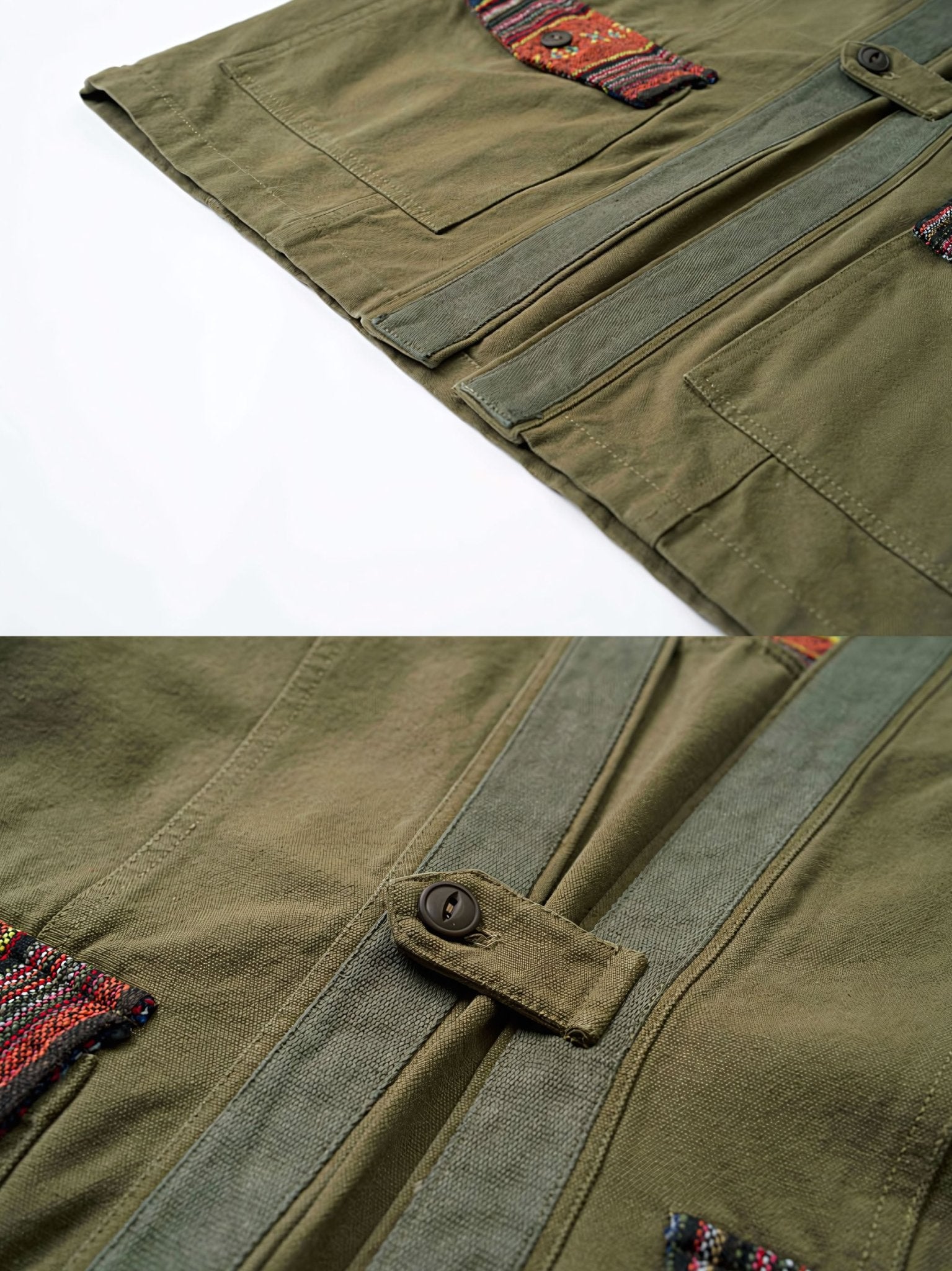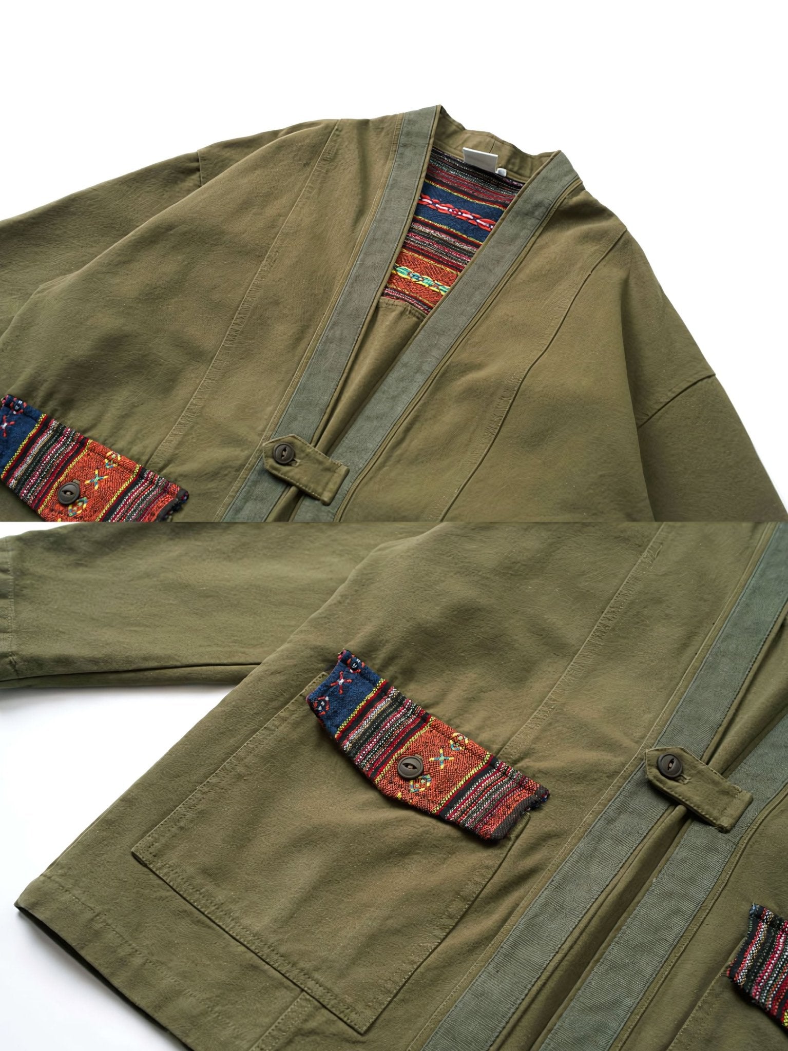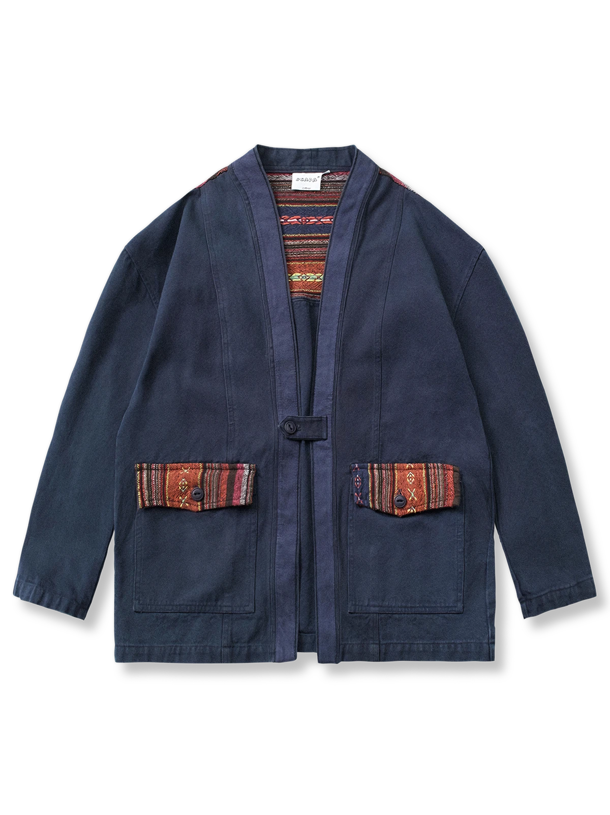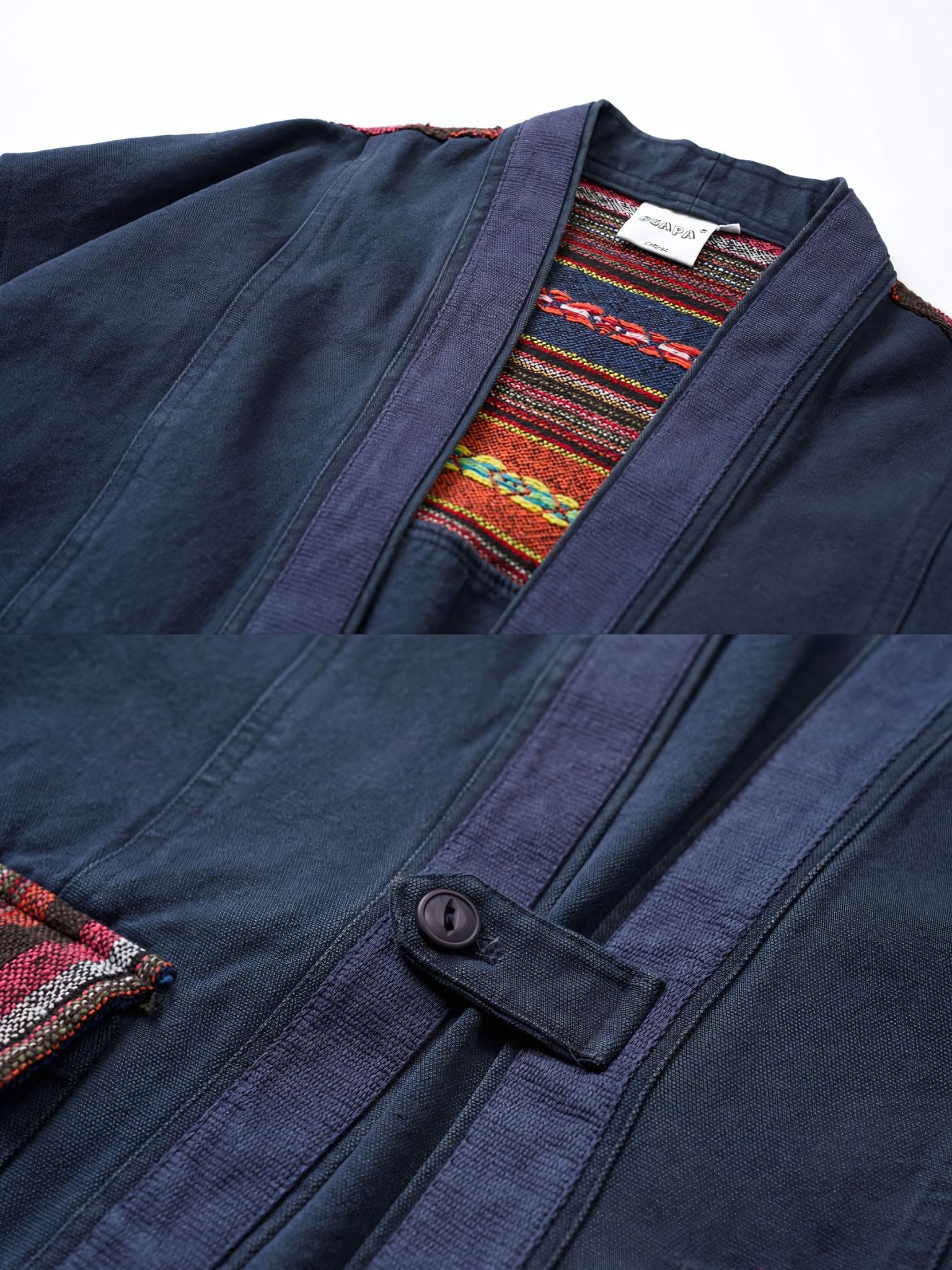 エスニック柄の開襟仕様で、首元を締め付けず快適な着心地です。 フロント留めのボタンなど、日本古来の文化を取り入れたこだわりのデザインです。