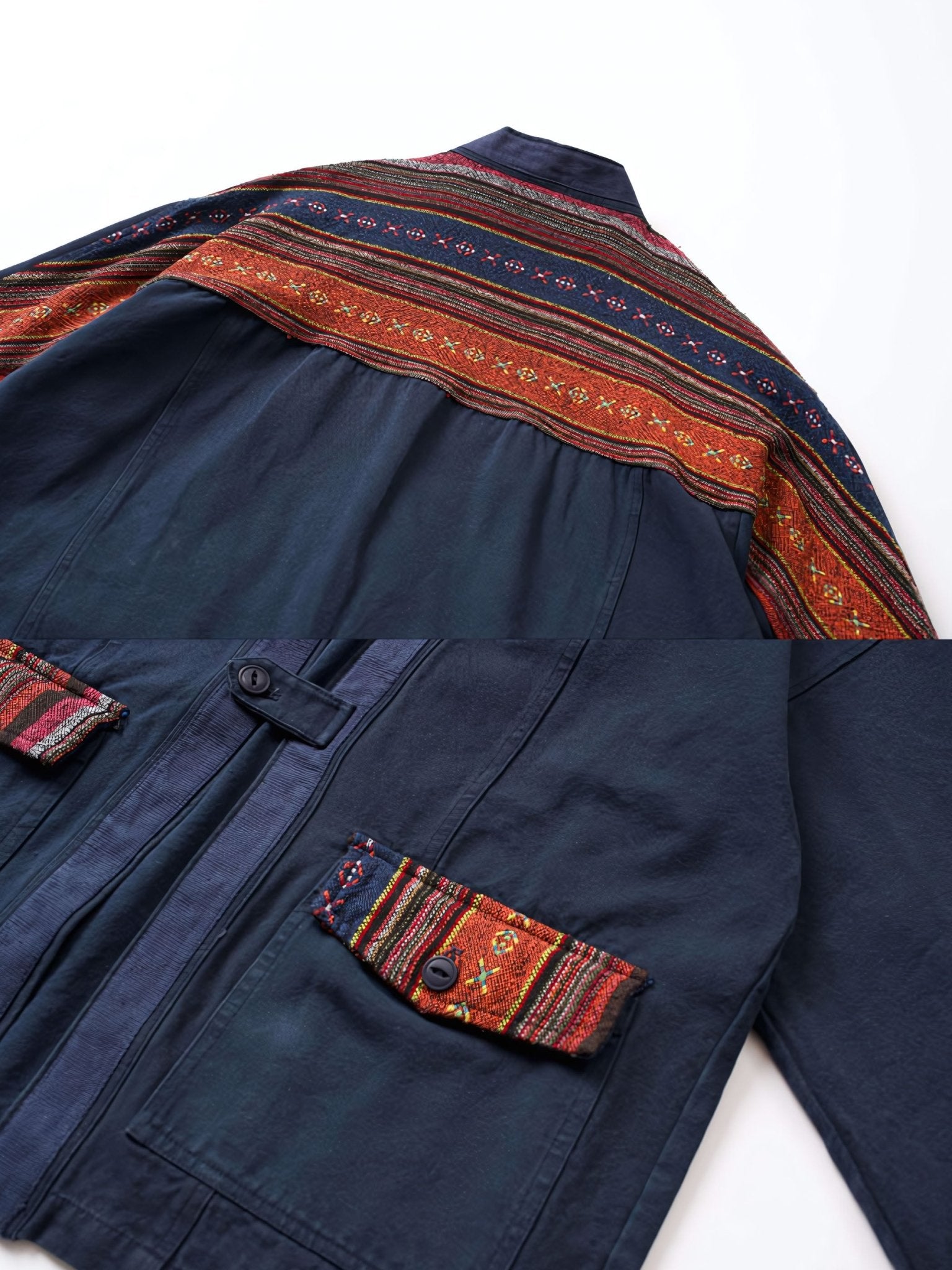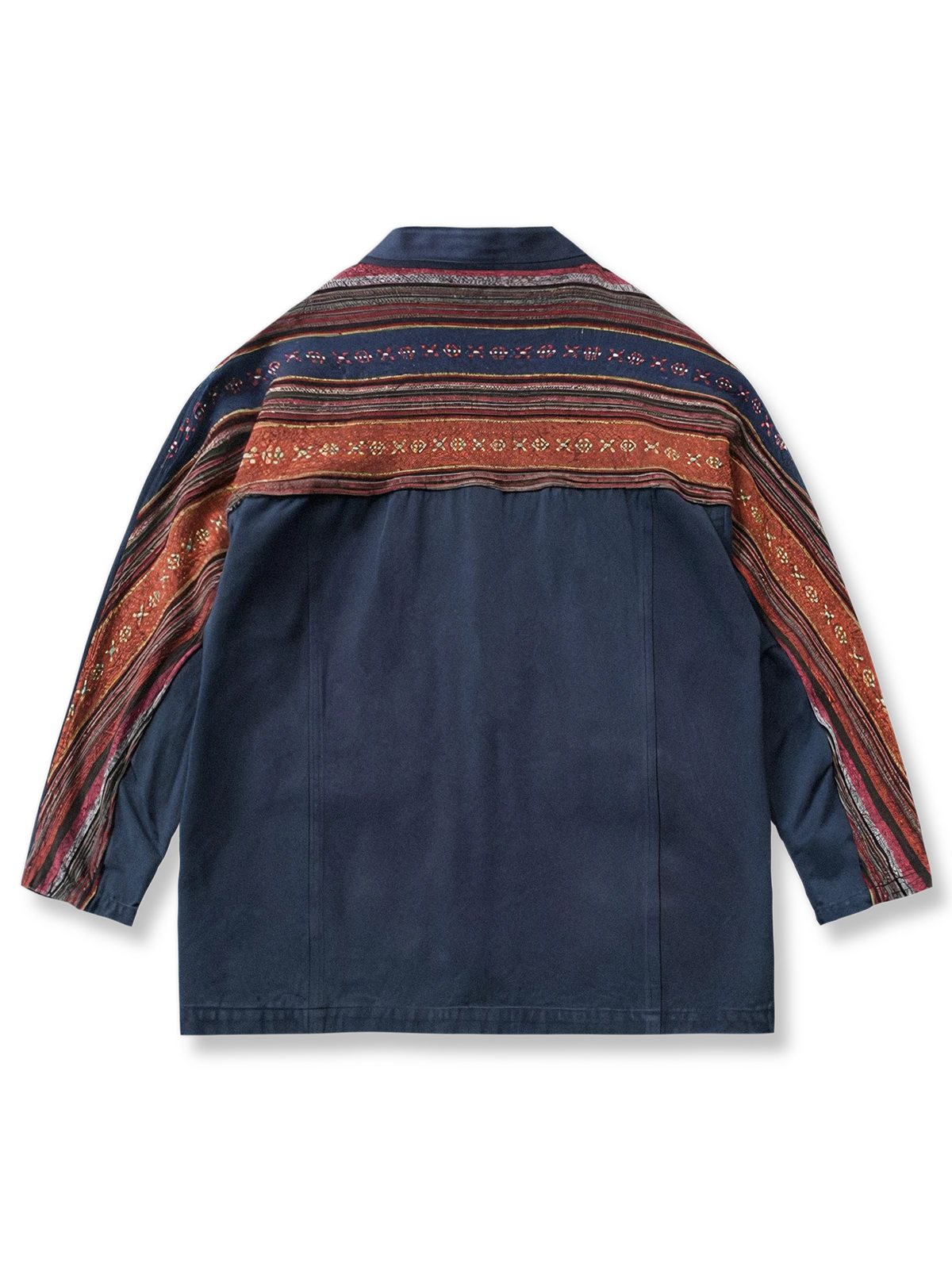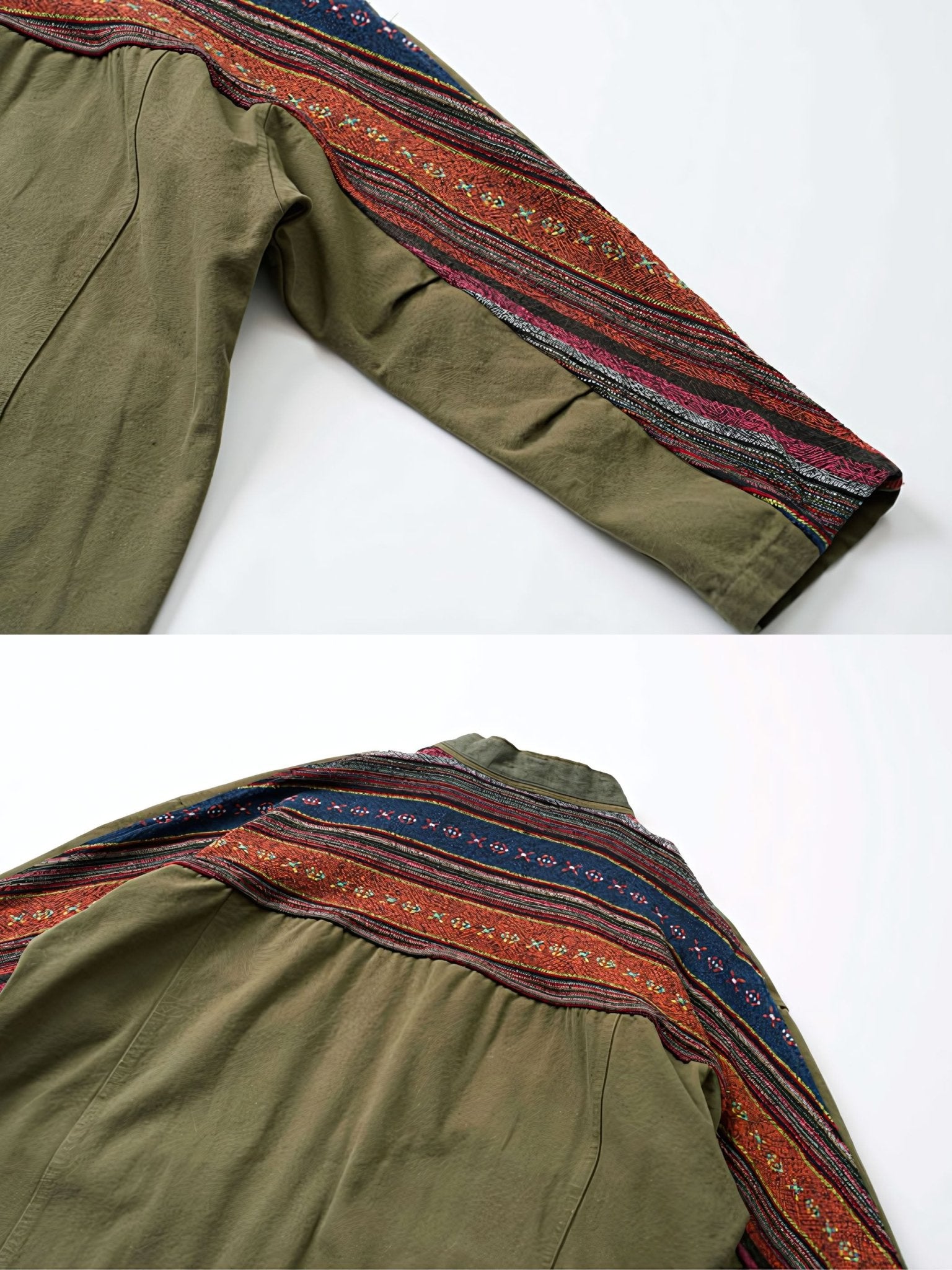肩、袖、背中にエスニックグラフィックパネルのディテールが施されています。 異なる文化や地域の要素を組み合わせ、全体に深みと面白みを加えた鮮やかなデザインが特徴の民族柄や模様を指します。