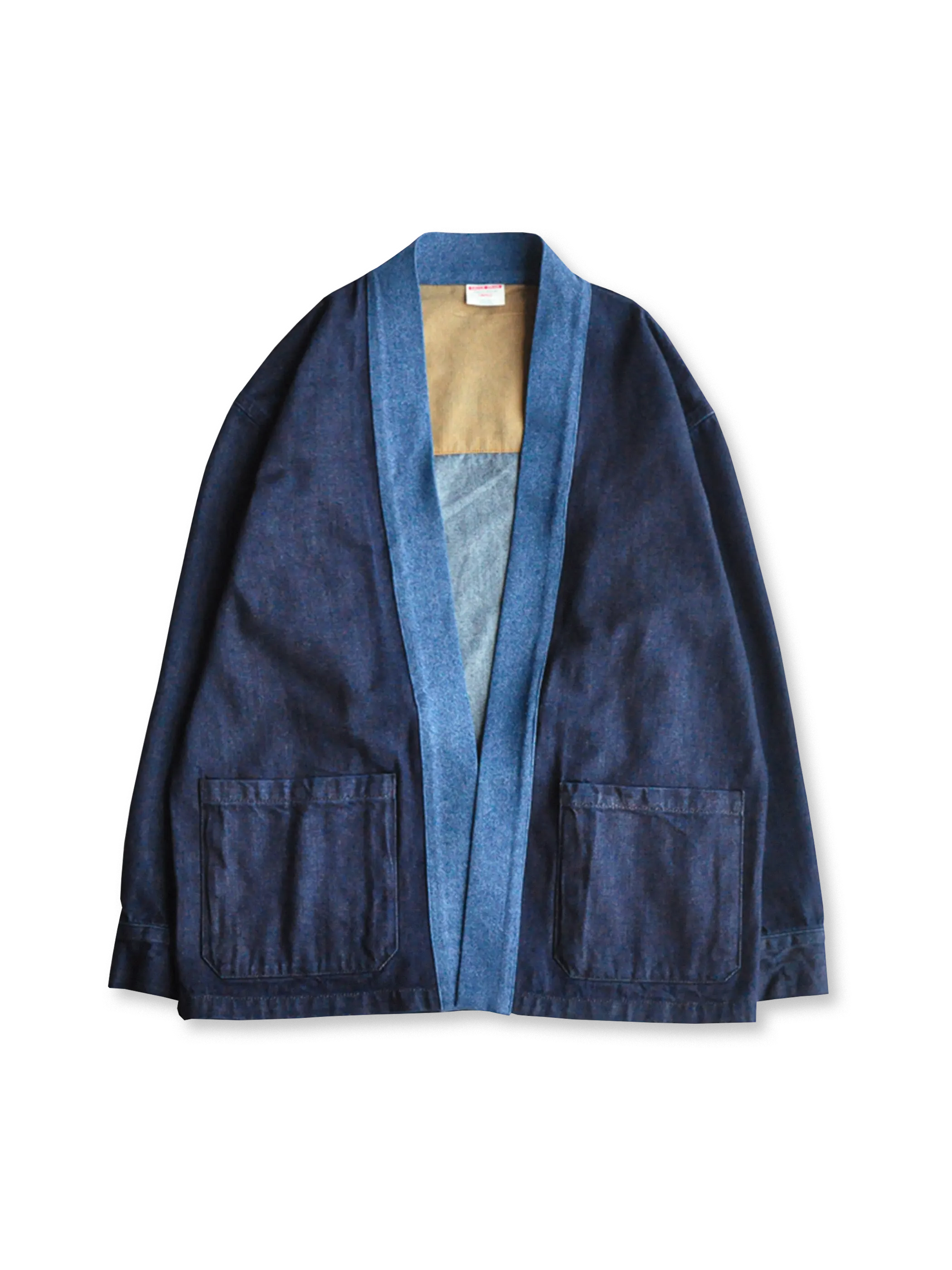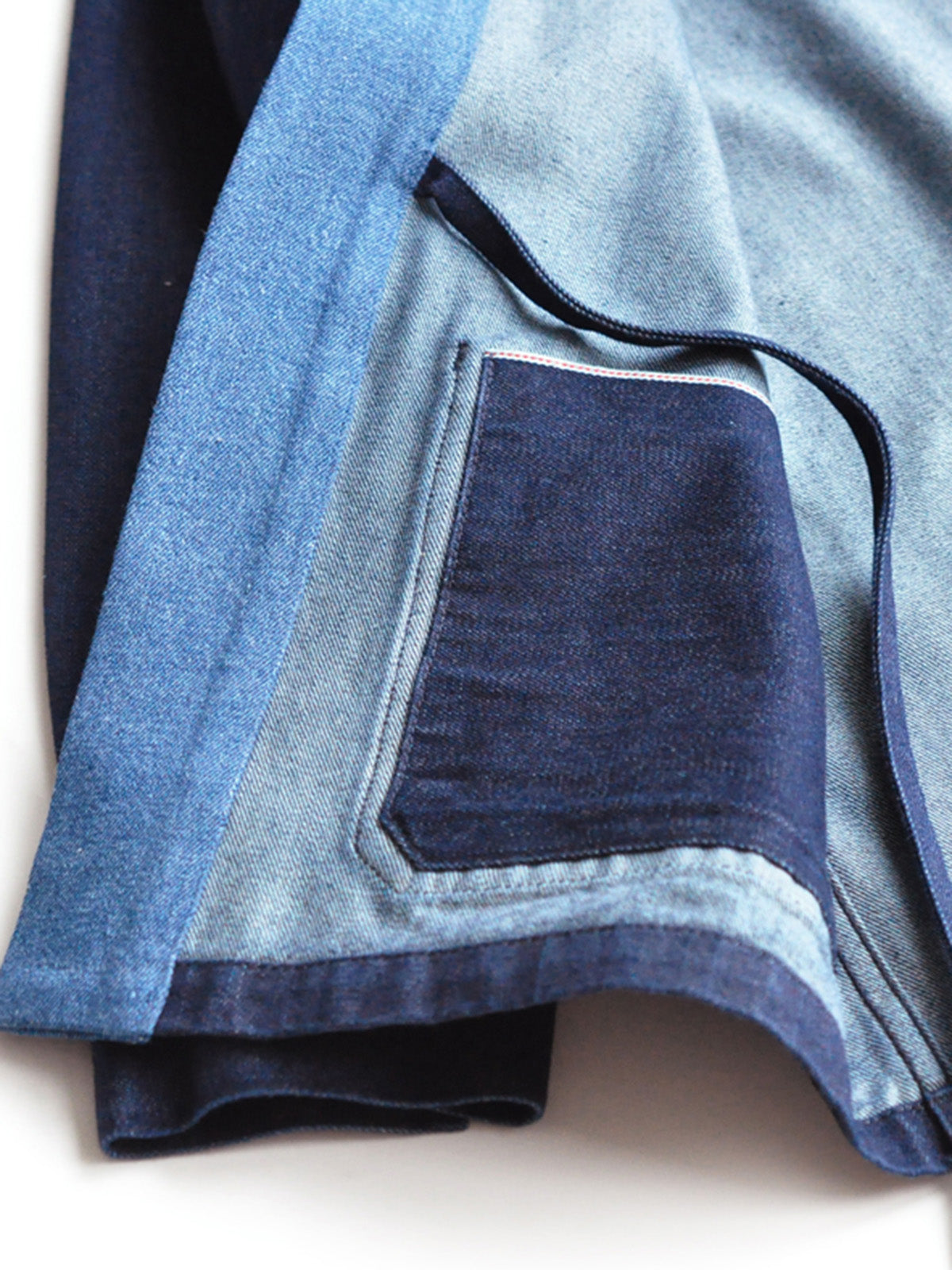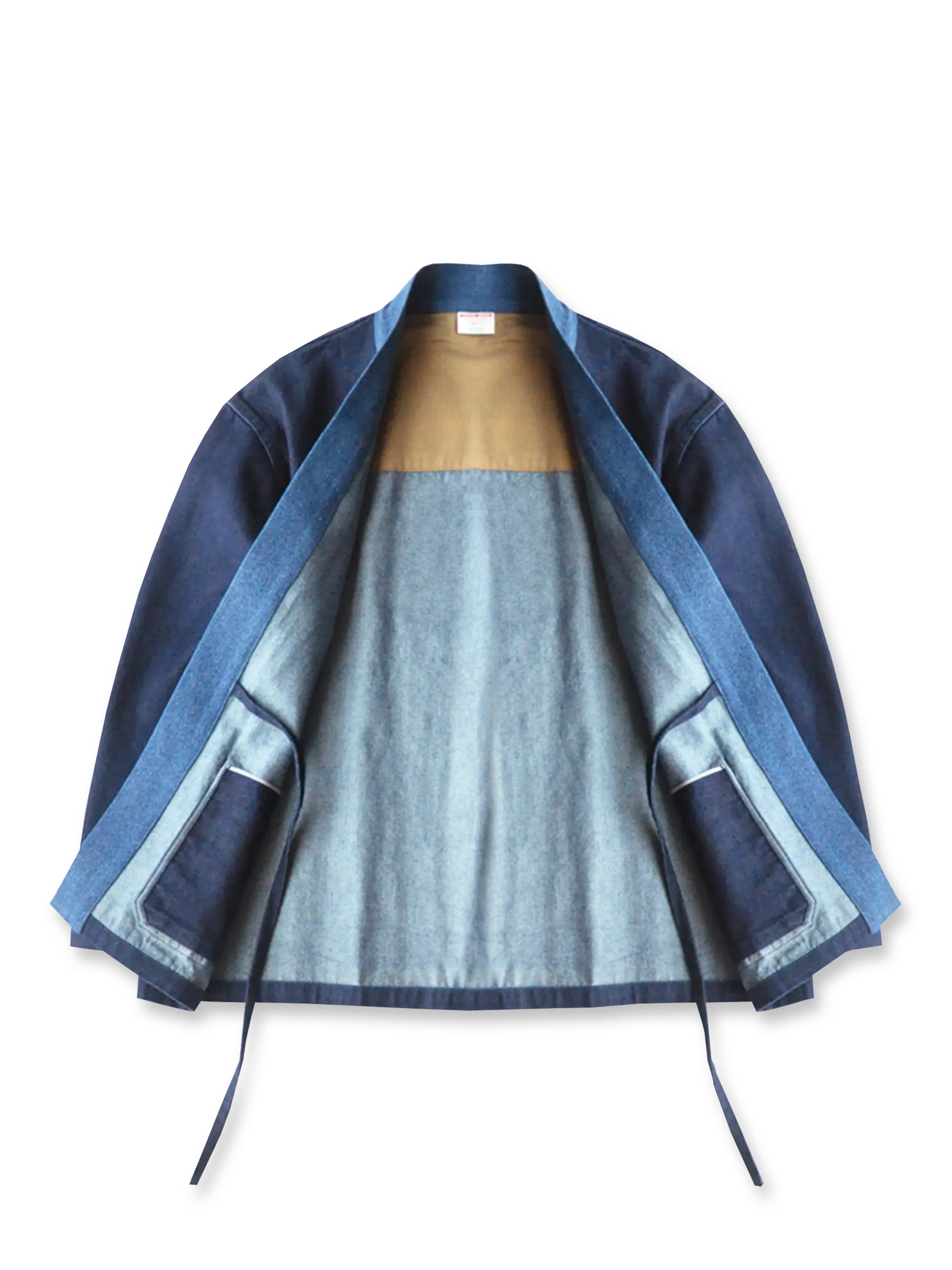 13オンス赤耳デニムを使用したウォッシュ加工デニム半纏。深浅の配色デザインで、柔らかく快適な着心地。カジュアルファッションにぴったりなアイテムです。