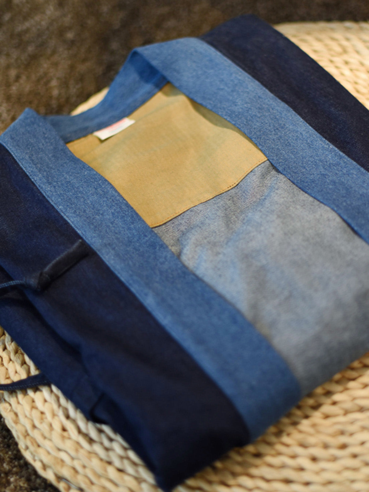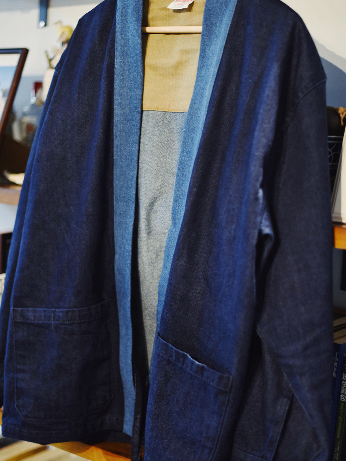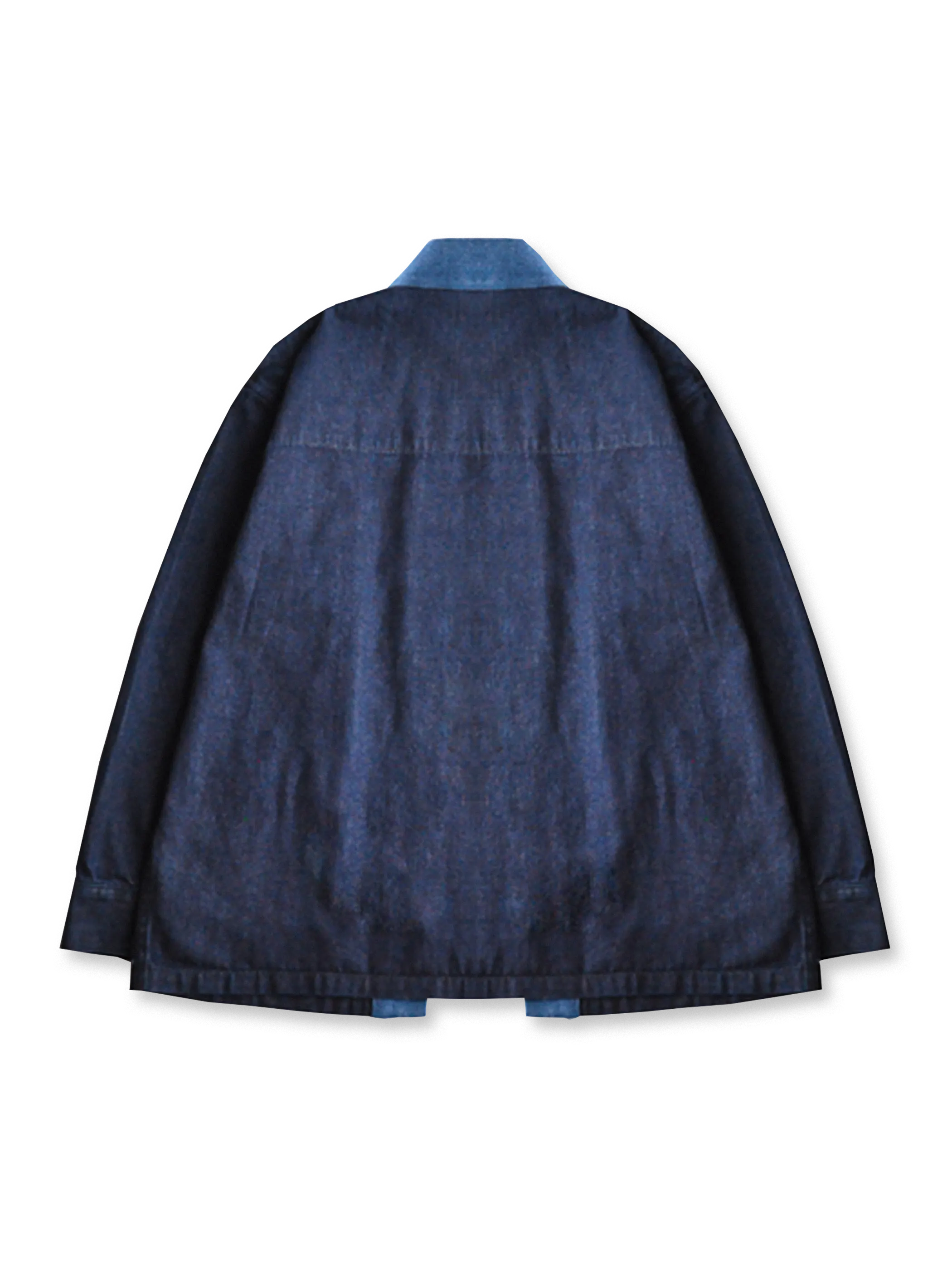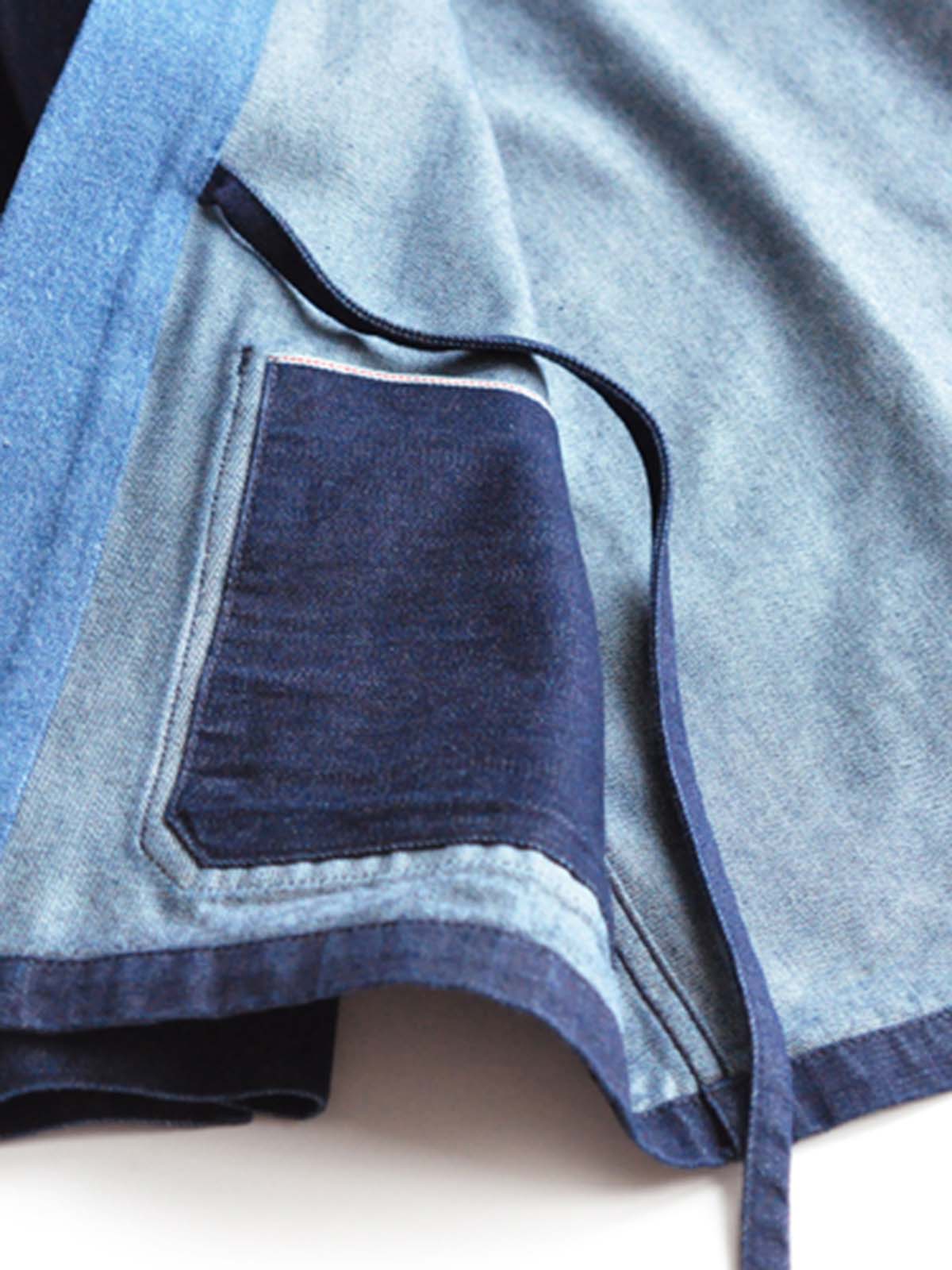 13オンス赤耳デニムを使用したウォッシュ加工デニム半纏。深浅の配色デザインで、柔らかく快適な着心地。カジュアルファッションにぴったりなアイテムです。