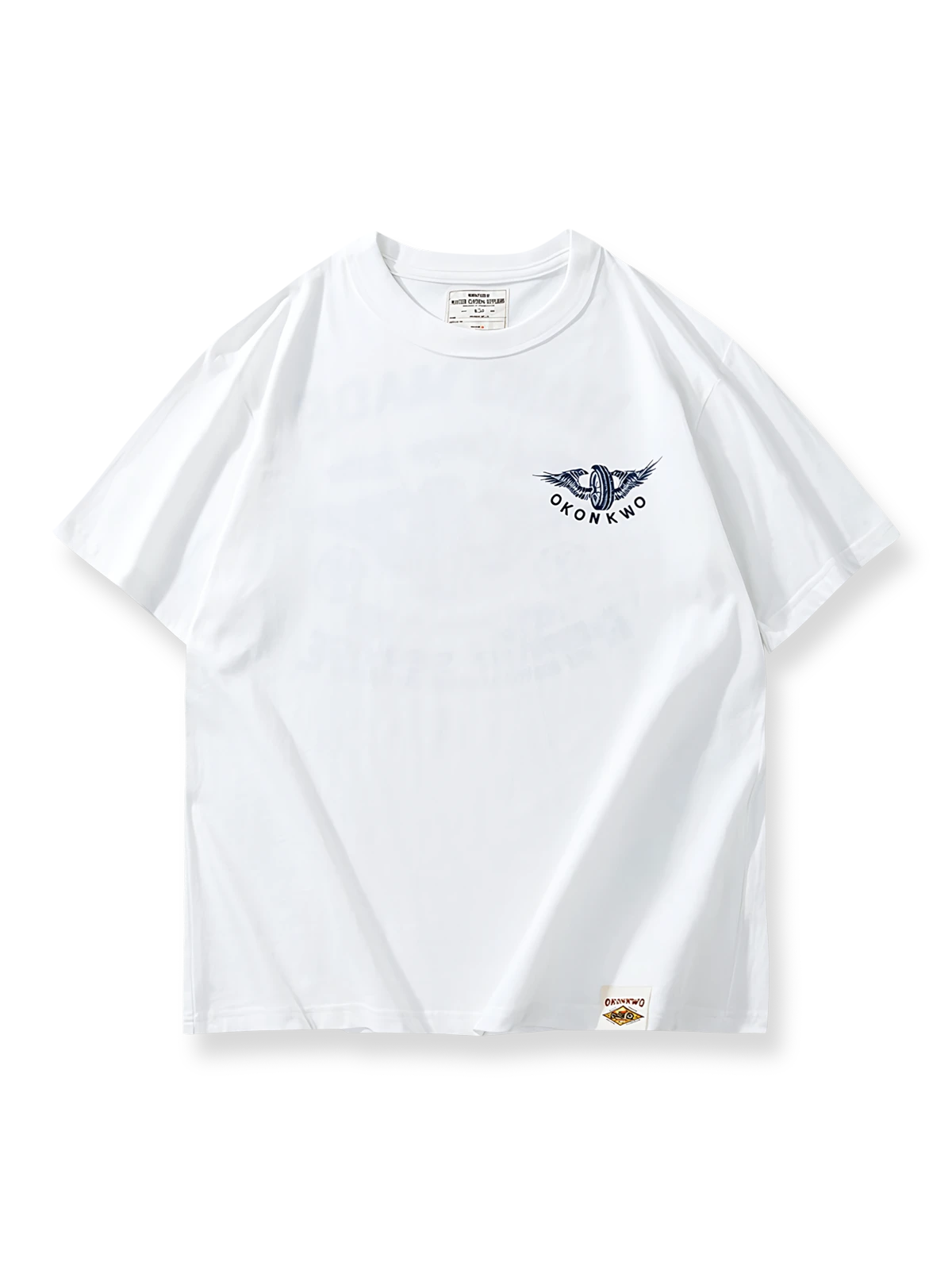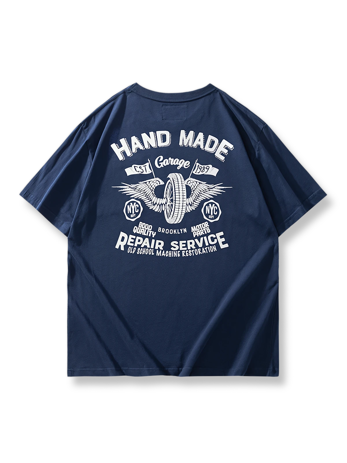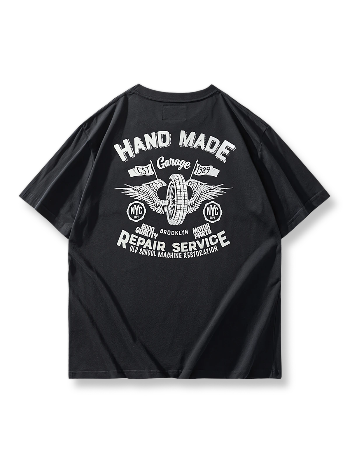 このTシャツは、20世紀のレトロなバイクカルチャーをテーマにデザインされており、前面にはクラシックなバイクのホイールとその要素が描かれています。オイルとメタルミュージックが溢れる時代のニューヨークの古いガレージの荒々しさと原始性を捉え、手作業と機械修理の文化に敬意を表しています。