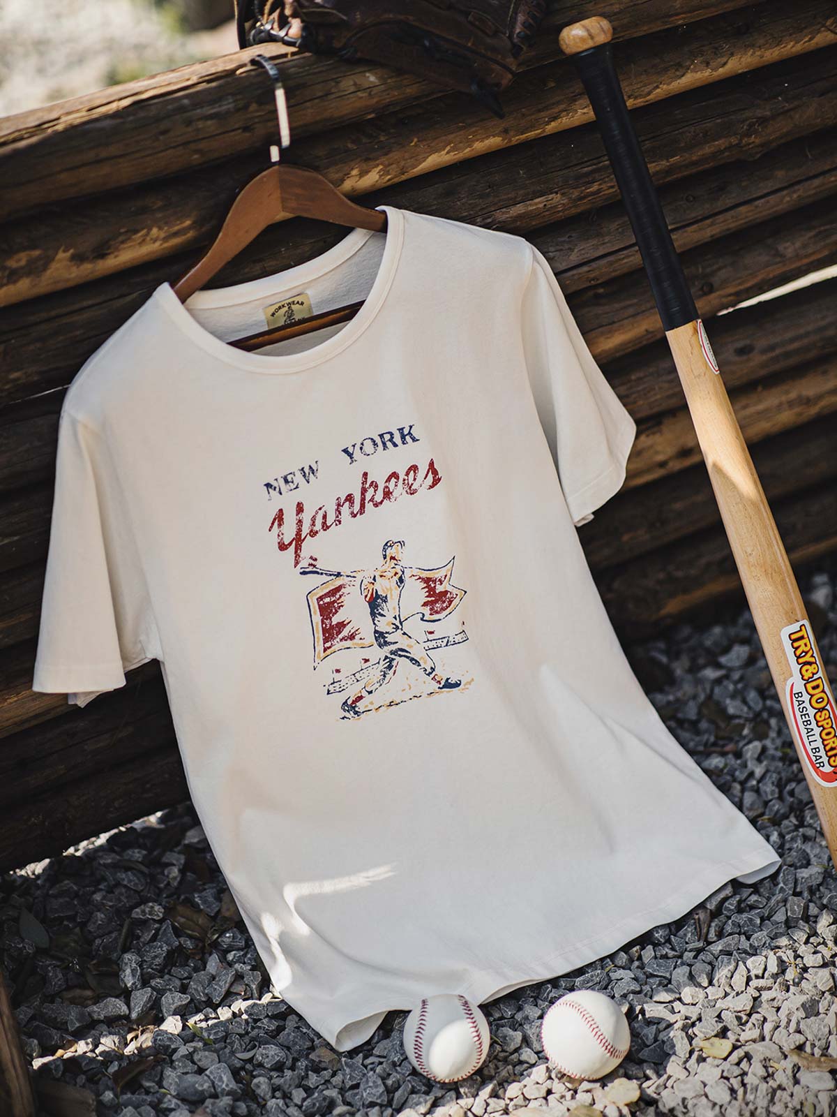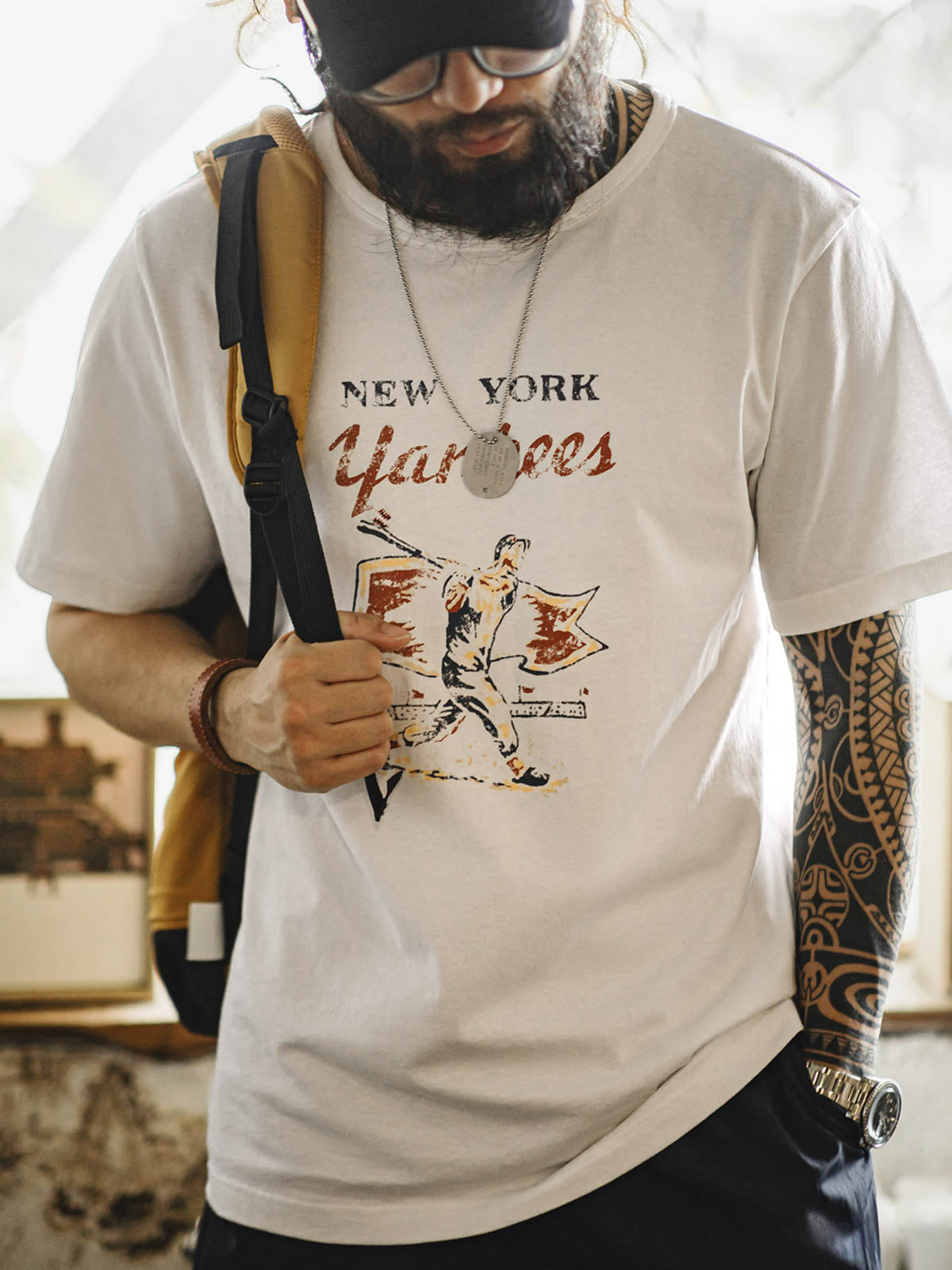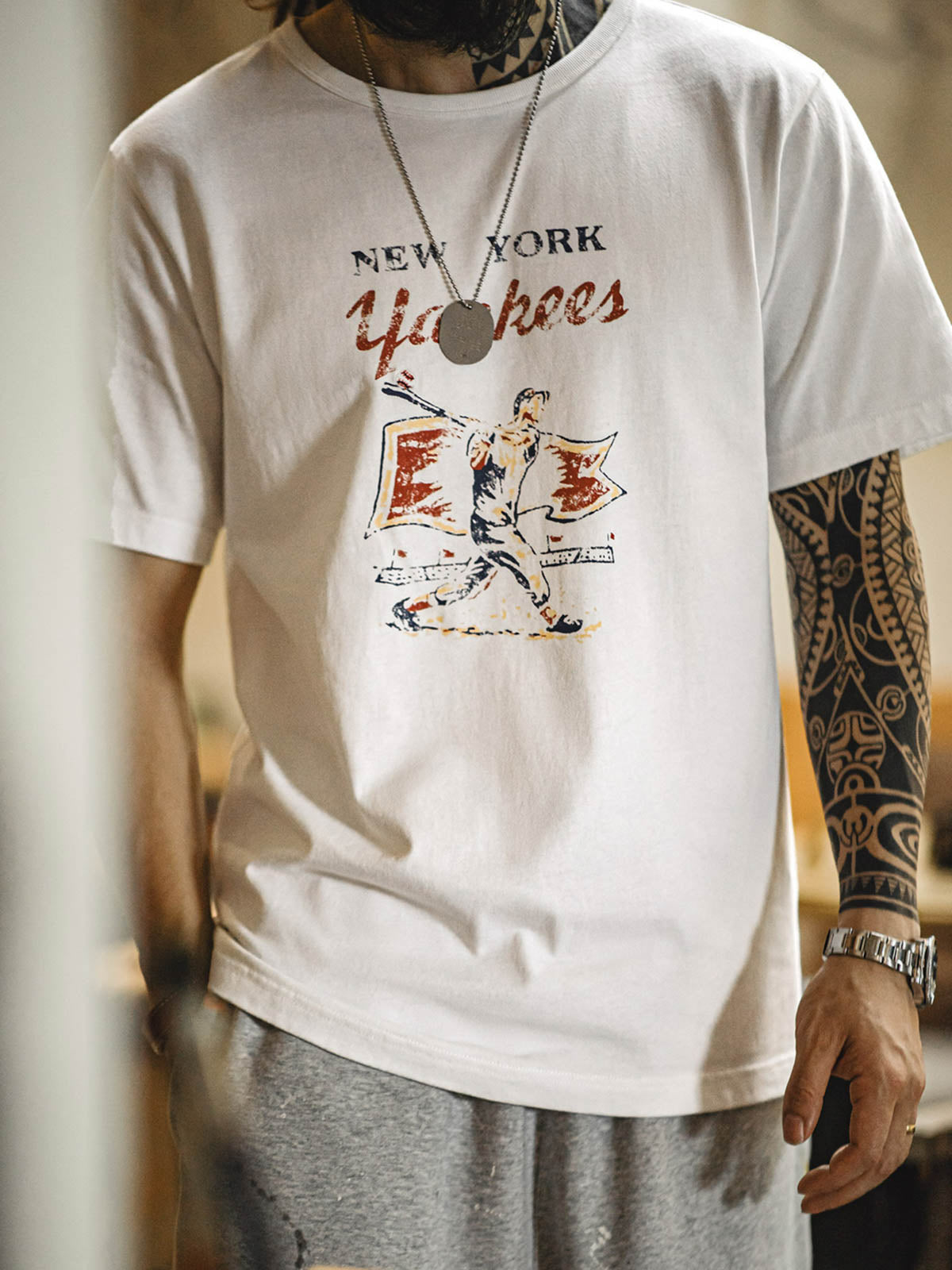 アメリカンスポーツにインスパイアされたこのTシャツは、ニューヨークのベースボールチームを想起させる象徴的なフォントとパターンでデザインされています。緻密な刺繍とプリントの技術が融合しており、視覚的な深みとともにベースボールの豊かな歴史と文化的背景を表現しています。このTシャツは、スポーツの伝統への敬意と現代のレトロファッショントレンドの追求を体現しています。
