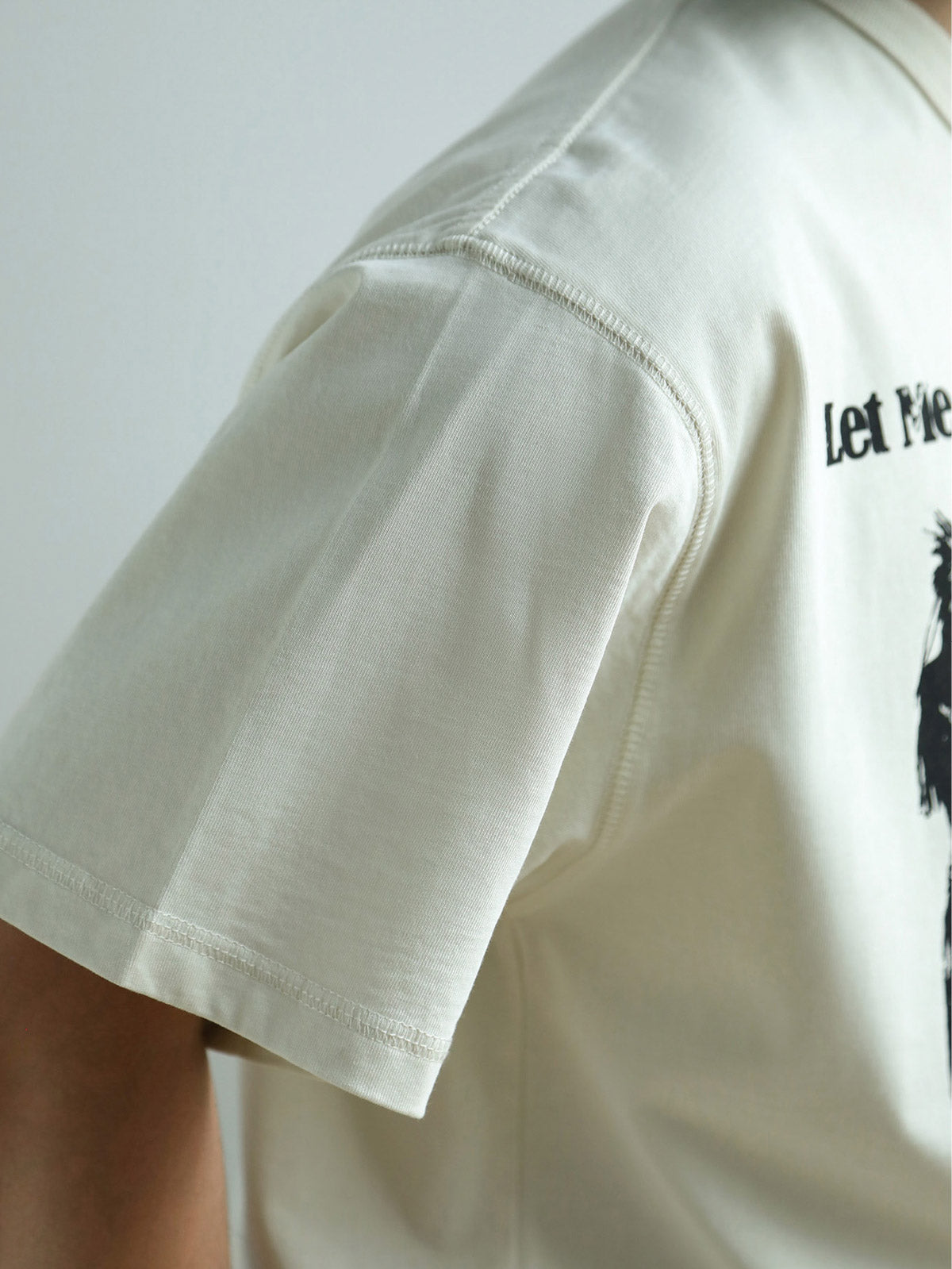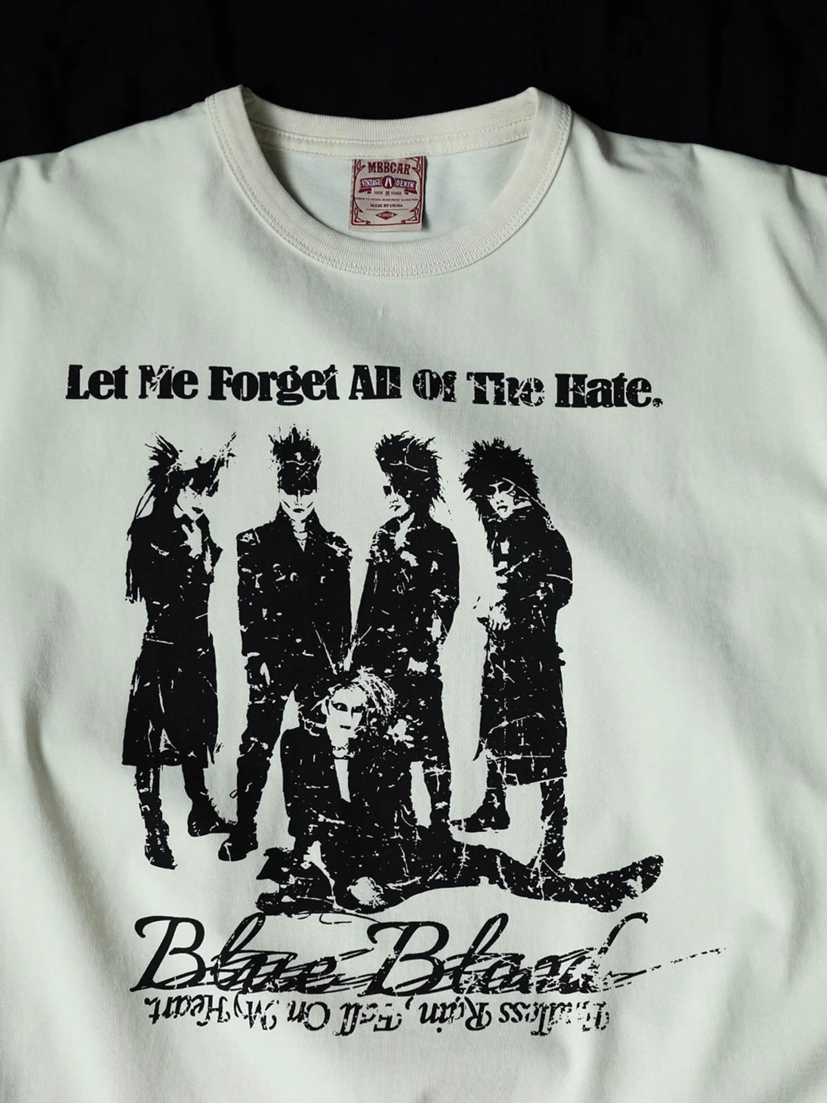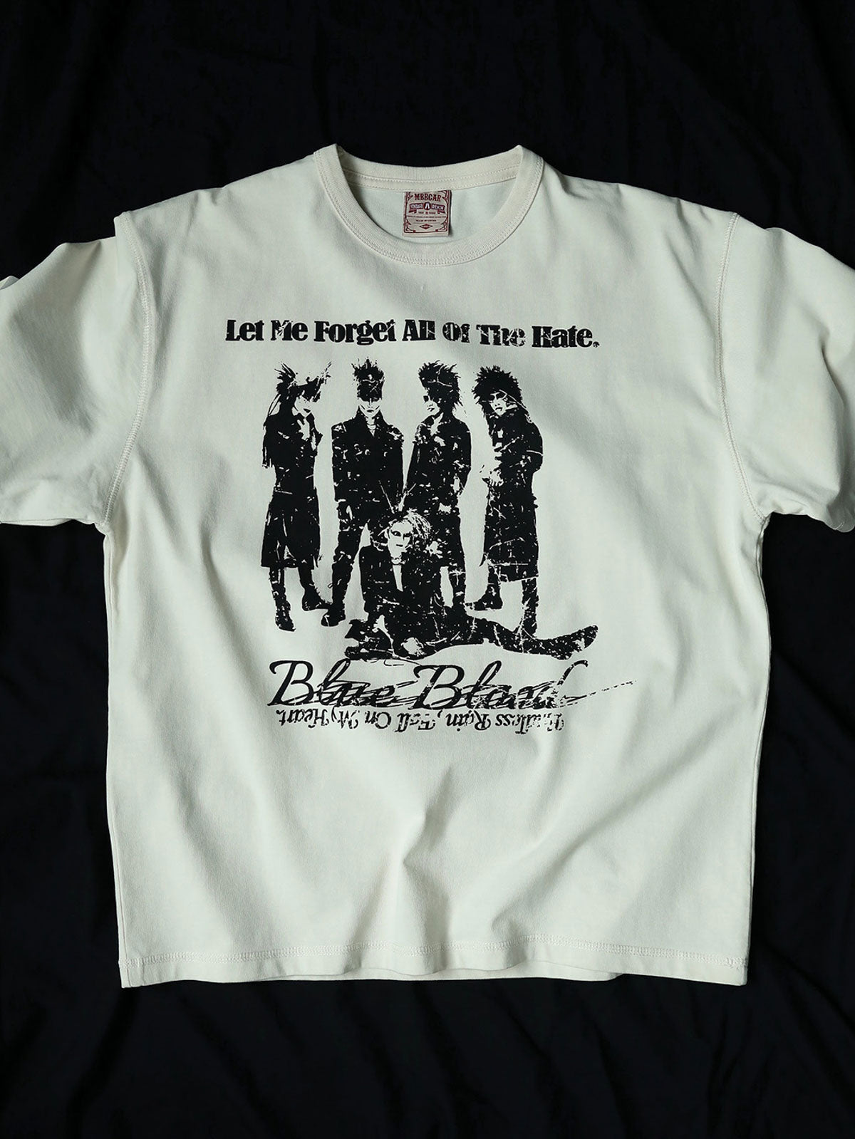 このTシャツは、アジアのロックバンドX JAPANからインスパイアされたデザインで、有名なメンバーのシルエットをプリントしています。強烈なパンクロックスタイルを演出します。生地は260gの40番手ツインズコットンジャージー(100%コットン)を使用しており、滑らかで柔らかく、快適で通気性があります。プリントはスクリーンプリントと水性インクを用いてヴィンテージ風に仕上げています。生地のアイボリーカラーが清潔感のあるヴィンテージスタイルを引き立てます。シルエットは狭めでショートワイドフィット、ウエストを絞ったカッティングにより、裾が広がらないようにデザインされています。リブネックはダブルステッチで強化され、袖口と裾、アームホールにはカンハソ工法を使用し、肩と後ろ襟はバインディングとチェーンステッチで補強されています。ブラックやデニムのパンツと合わせて、ロックなヴィンテージスタイルを楽しめます。
