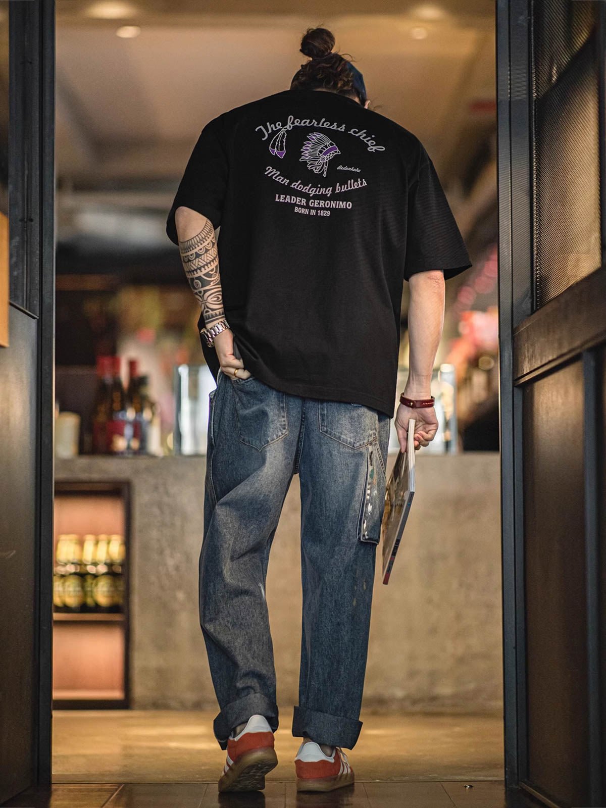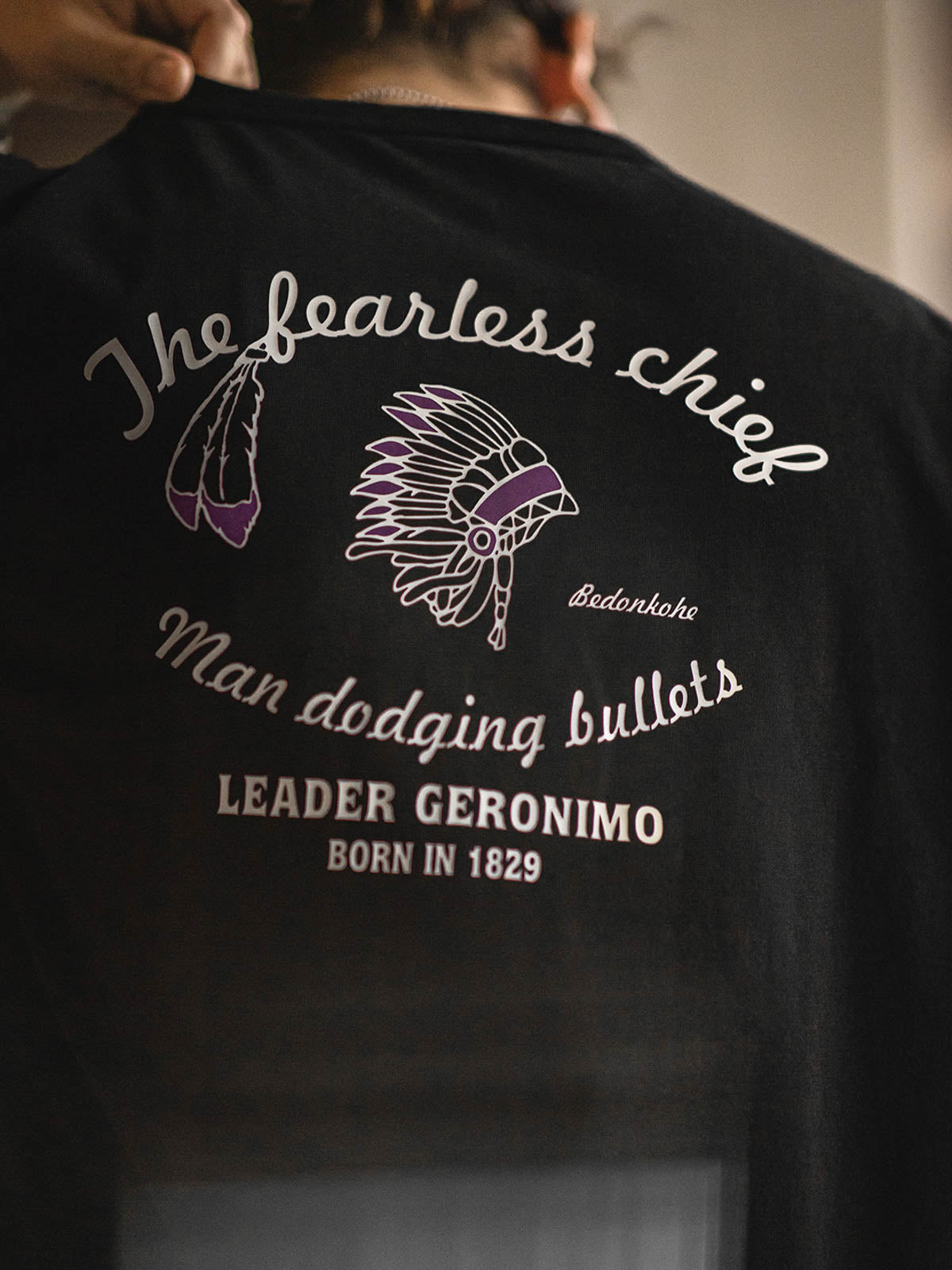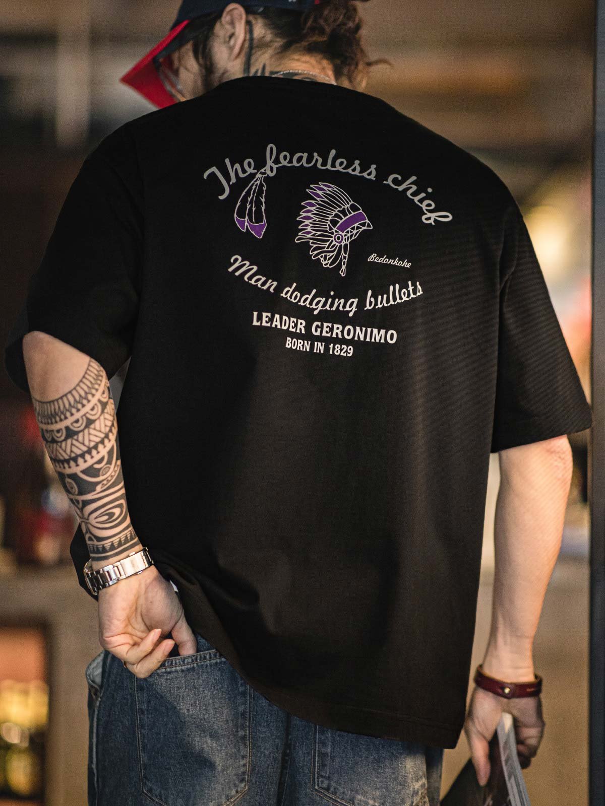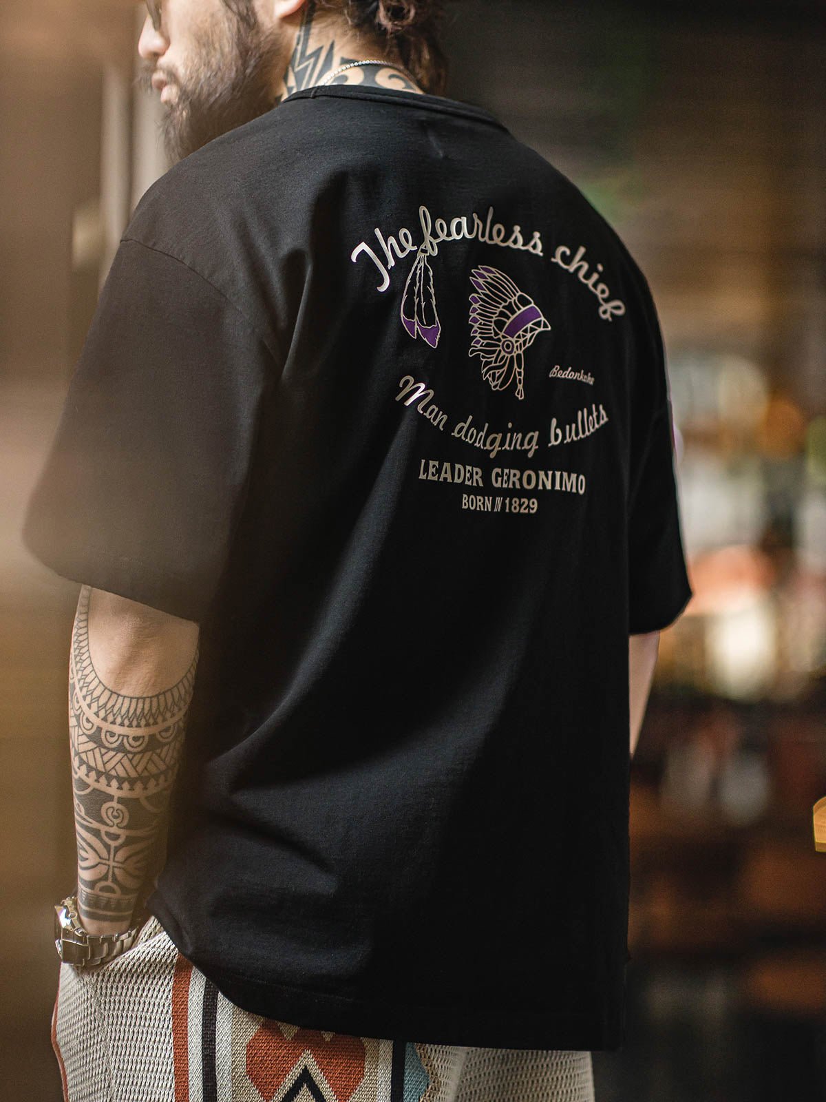 このTシャツは、北アメリカ先住民文化に触発された鷹の羽の冠を主要なデザイン要素に採用し、勇敢さと名誉、権力の象徴としています。プリントされた鷹羽冠モチーフは、伝説のインディアン首長「ジェロニモ」に敬意を表し、彼の不屈の精神を讃えています。歴史と現代デザインが融合し、力強く文化的な深みを表現しています。