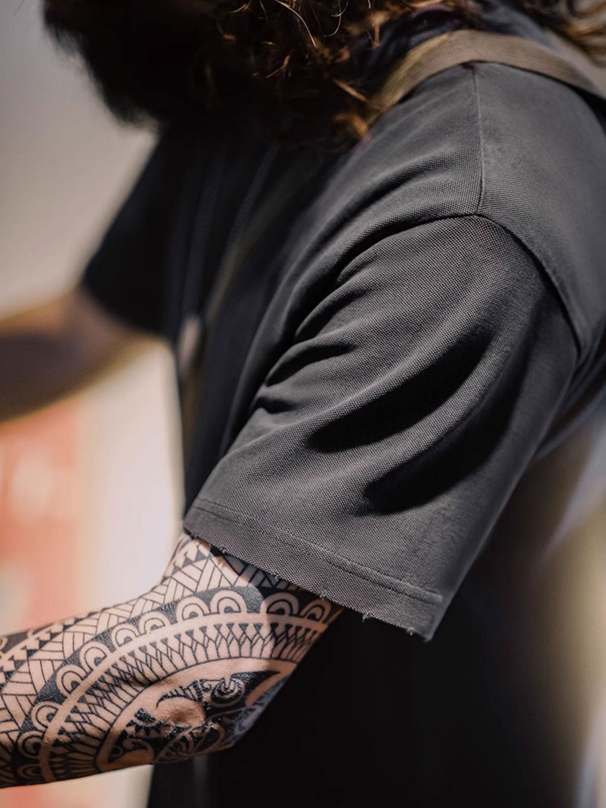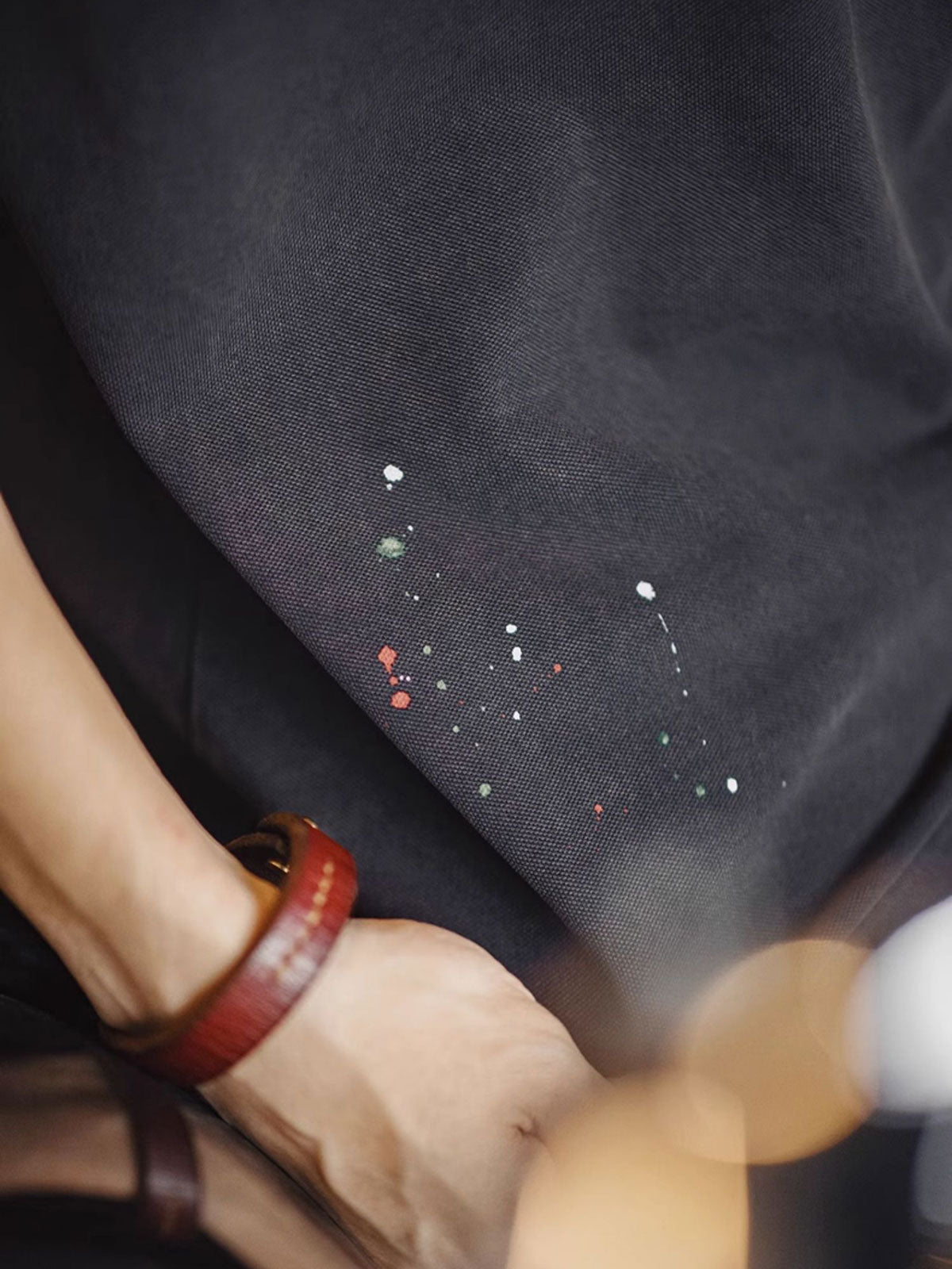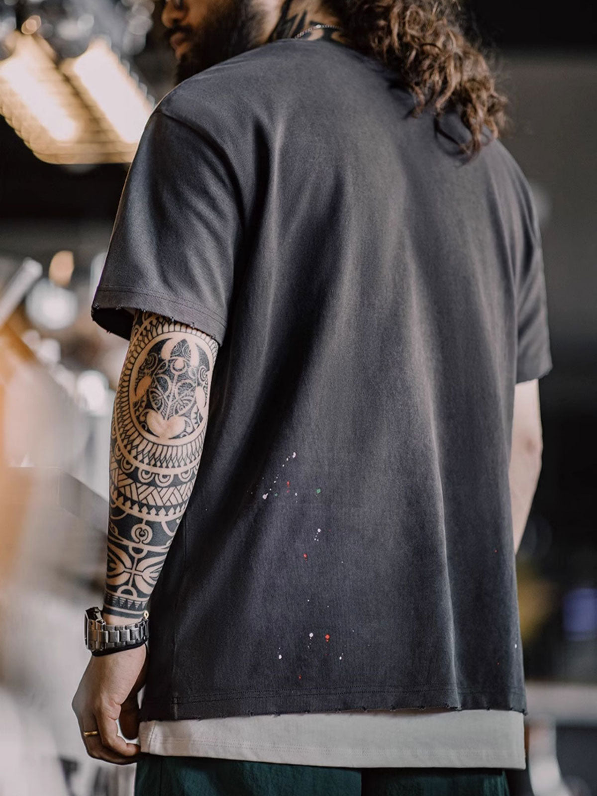 この短袖Tシャツは、16番手の糸で織られた220グラムのコットン素材を使用し、洗い加工により自然な色落ちとムラのある風合いを実現しています。スプラッシュペイントデザインが自由で個性的な視覚効果を生み出し、袖口、裾、襟元に施されたデストロイカットがヴィンテージ感をさらに強調します。柔らかく通気性に優れた素材で、夏の快適な着用感を提供します。デニムやカジュアルショーツとの相性が良く、レトロなスタイルを演出します。